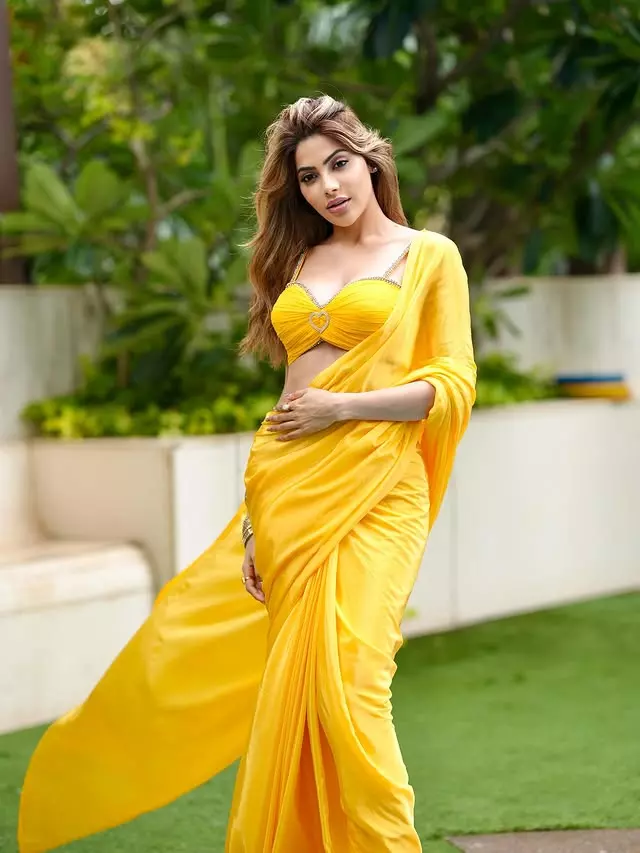 In this captivating picture, Nikki looks radiant in a bright yellow saree paired with a stylish, embellished blouse featuring a cute heart-shaped detail.