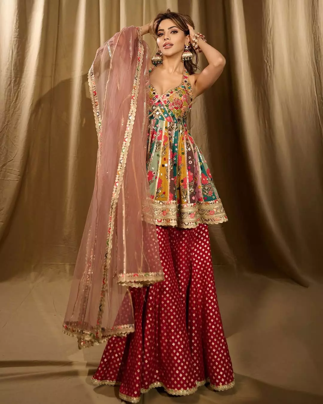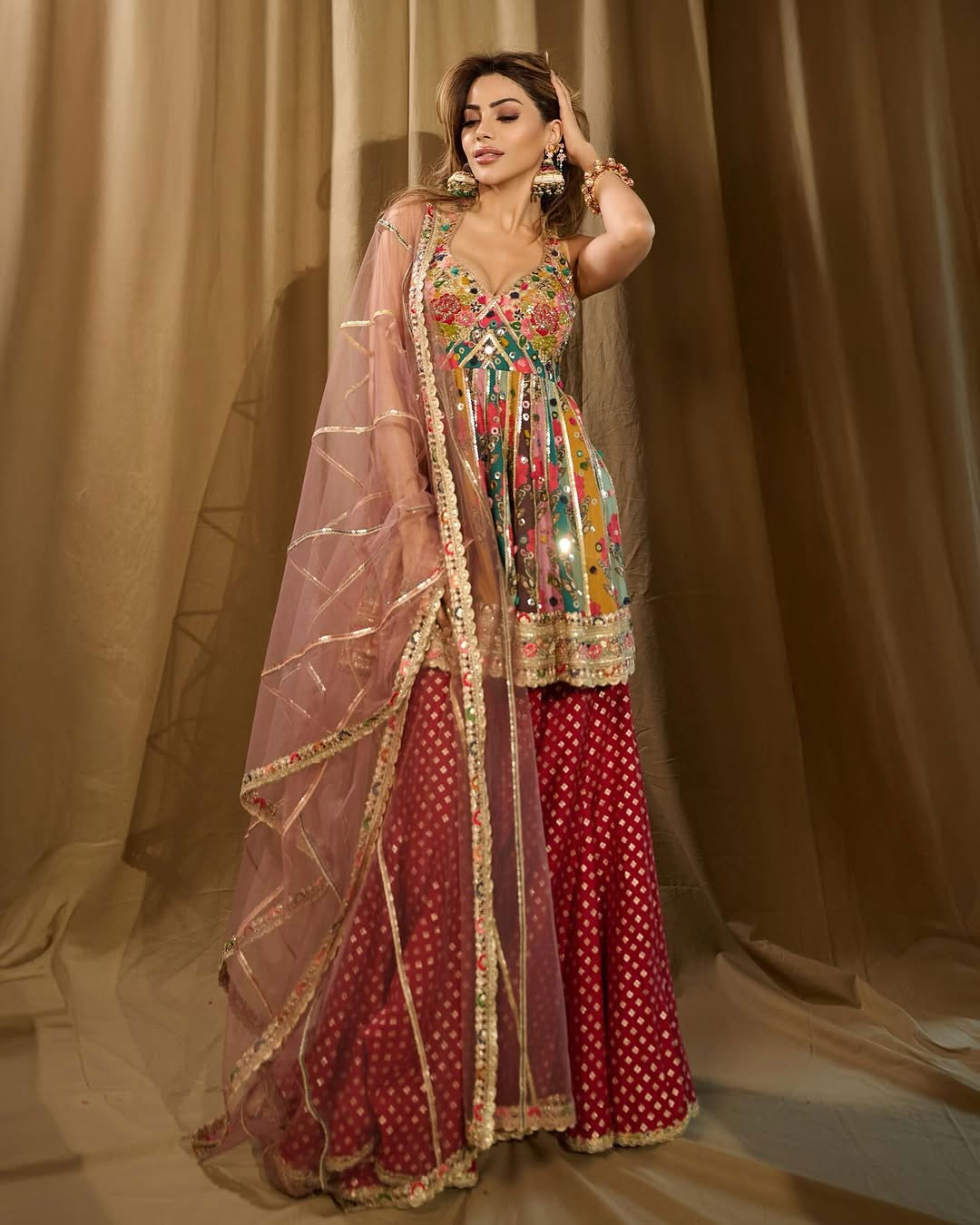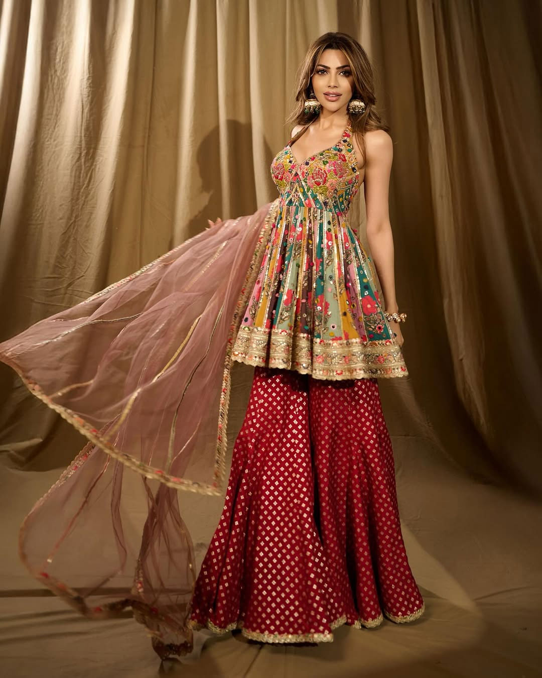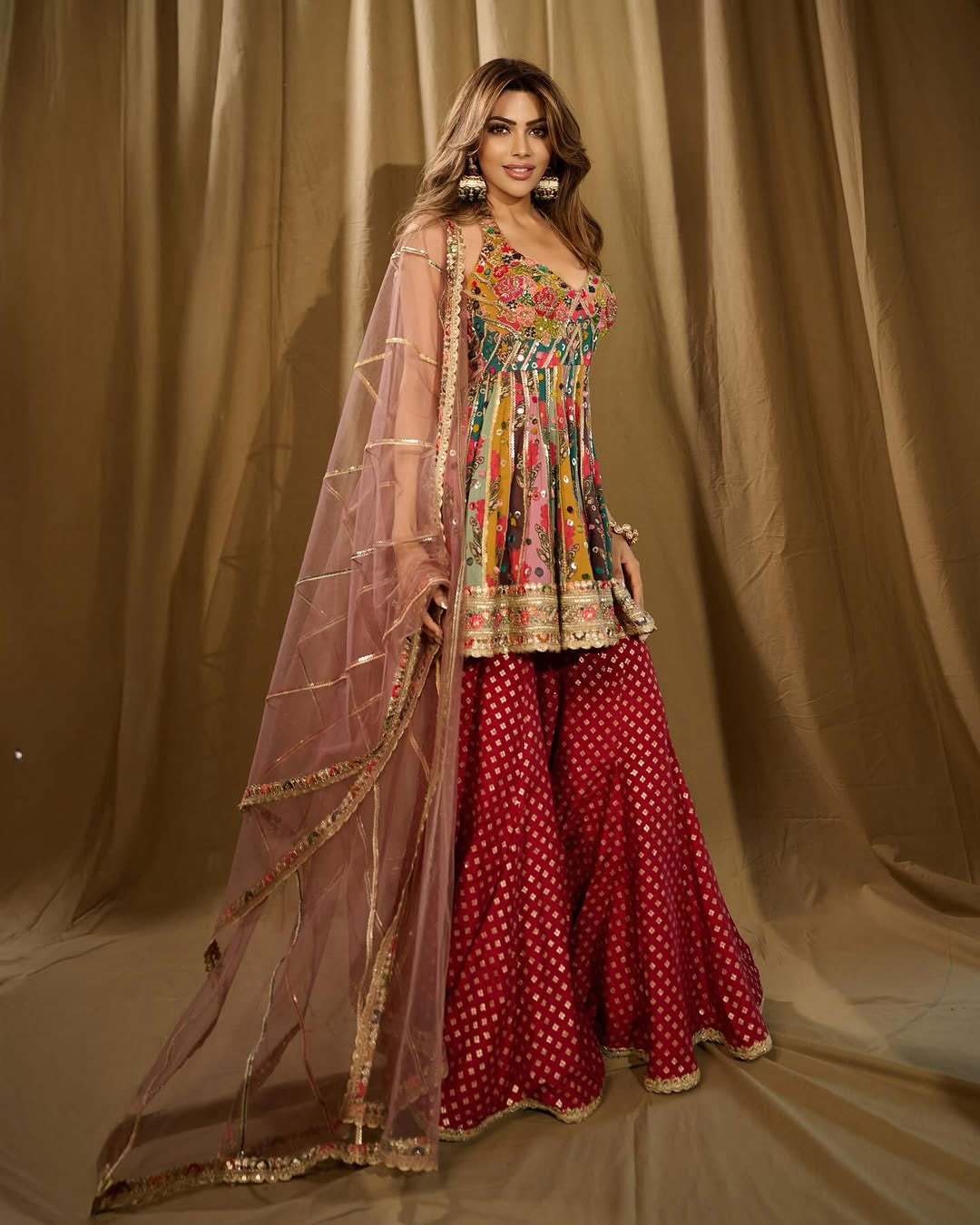 In her latest Instagram post, Nikki stuns in a rich maroon embroidered ensemble that redefines regal elegance. Adorned in traditional gold jewelry and framed by a sheer, delicately draped veil, she is every bit the modern-day queen. Her caption, “The phool you’ve been looking for” 🌹✨, adds just the right amount of playful poetry to the look. The warm golden tones and her radiant presence create a scene that feels straight out of a fairytale.