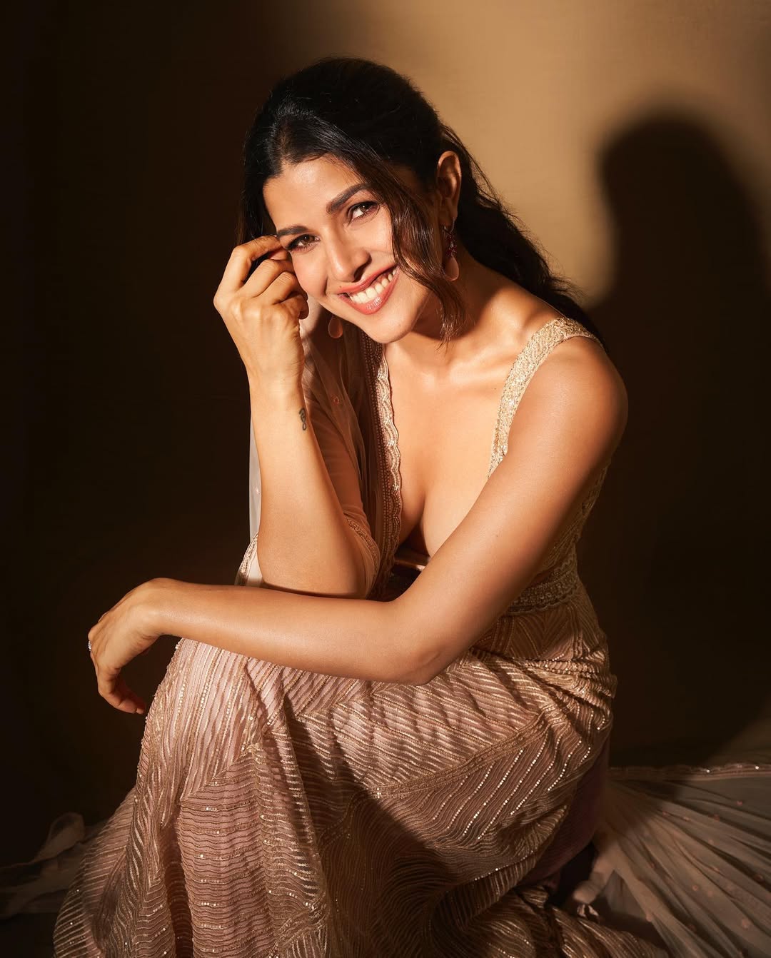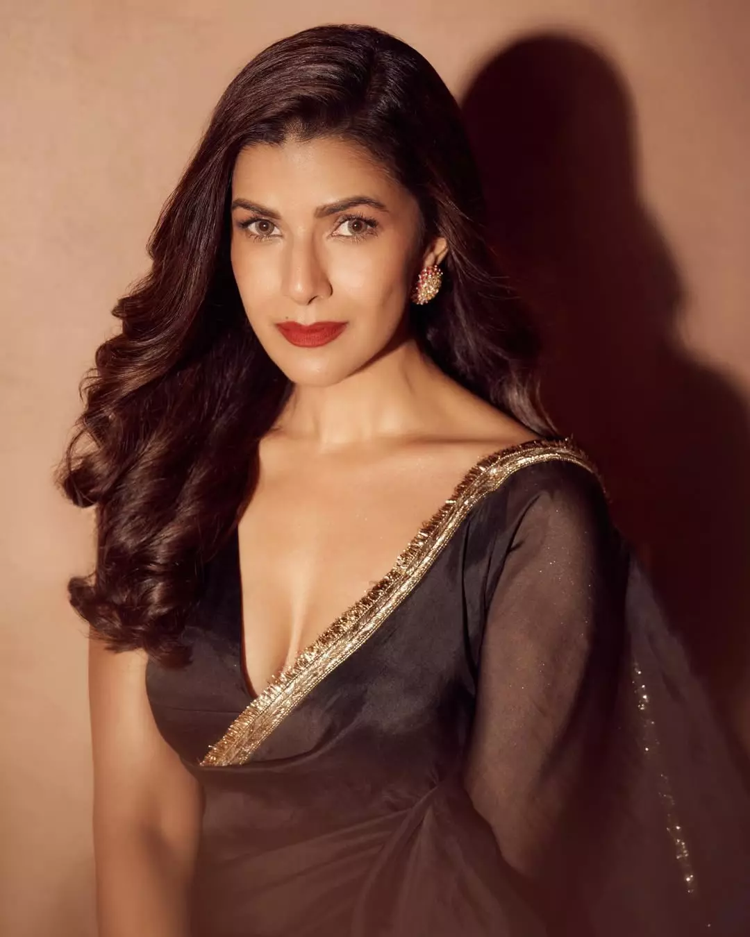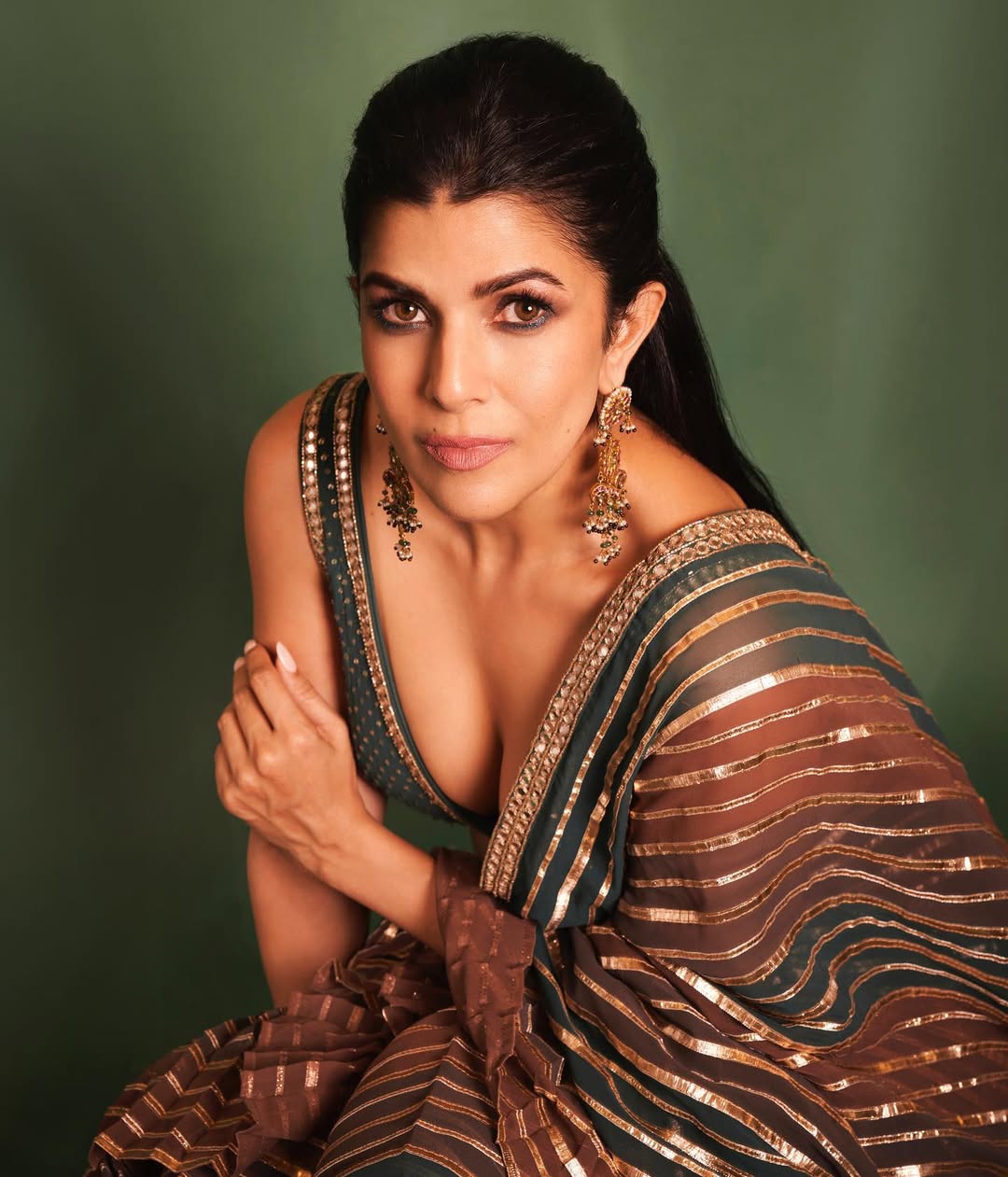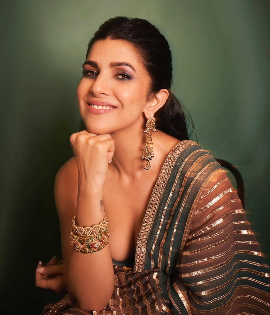 This mesmerizing photo captures Nimrat in a stunning deep green and gold striped saree with intricate embroidery, paired with a plunging-neckline blouse and ornate chandelier earrings. Her sleek ponytail, subtle smoky eyes, and poised demeanor against a muted backdrop radiate timeless ethnic glamour and confident allure.