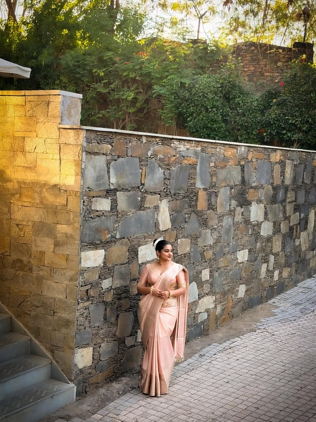 Actor Nivetha Thomas recently shared a calm and graceful photo on Instagram that quietly touched many people. In the picture, she is seen wearing a soft peach saree, standing against a stone wall, looking peaceful and confident.
