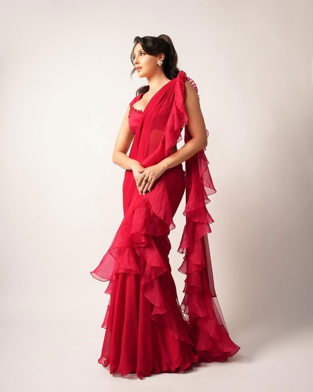 Nora Fatehi knows how to make a bold fashion statement. She often selects outfits that highlight her elegance and grace. Her fashion choices include structured silhouettes, detailed embellishments and modern aesthetics.