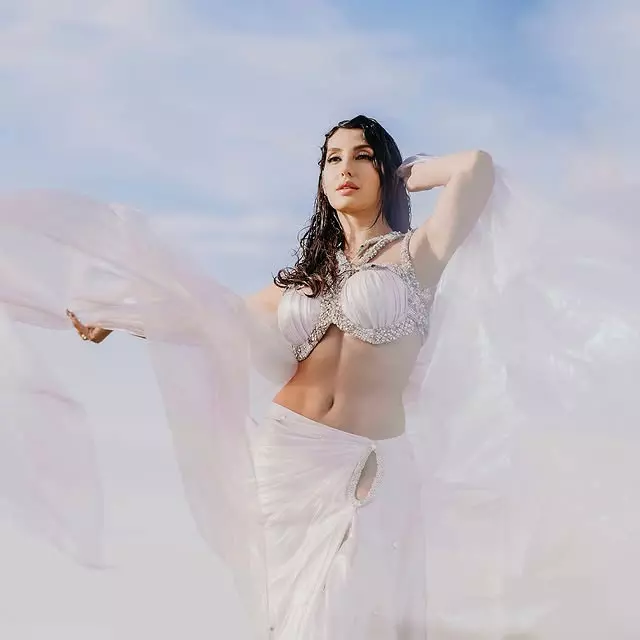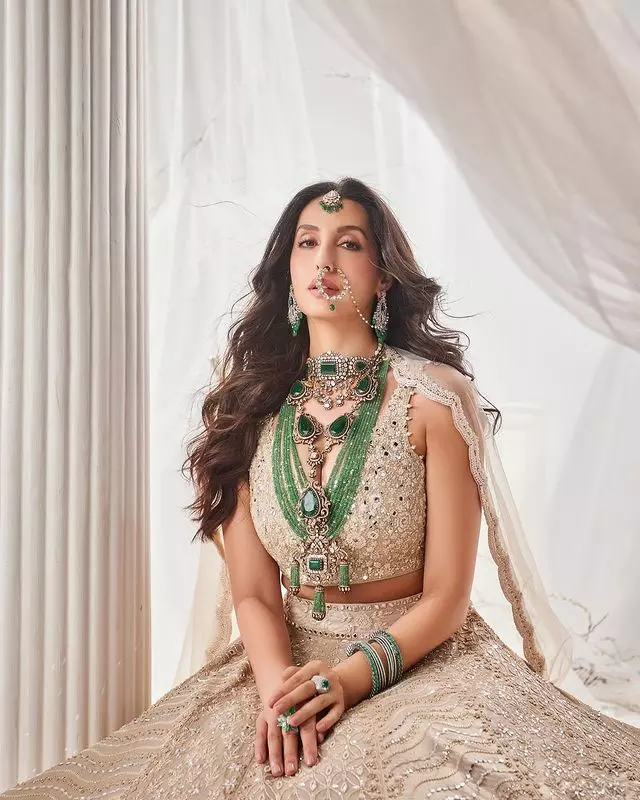 What makes this ensemble remarkable is its seamless blend of heritage and contemporary design. The ornate zardozi and reflective mirror accents celebrate traditional Indian artistry, while the modern silhouette ensures the look remains chic, personal, and timeless. Nora’s poised styling and effortless confidence allow the gown to truly shine, presenting her as a vision of refined glamour.