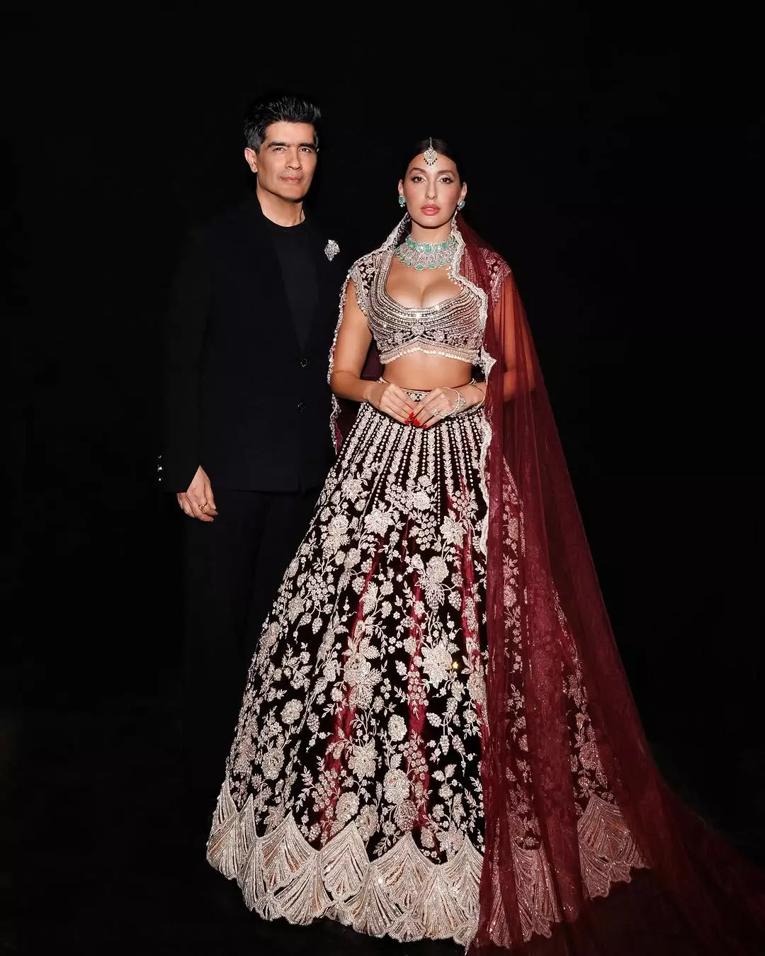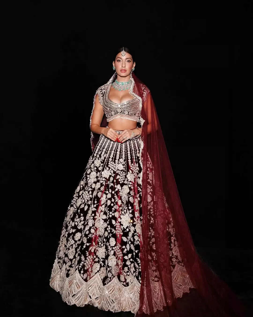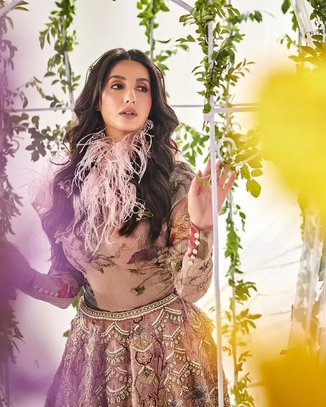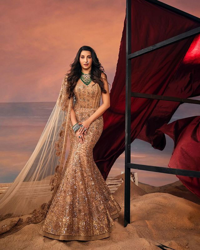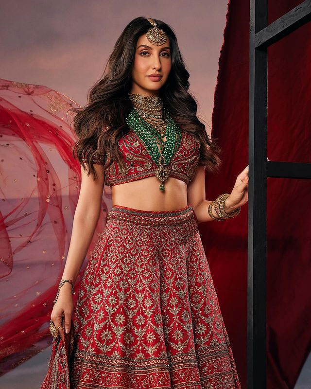 Nora Fatehi in new picture on Instagram wore a heavily embroidered lehenga designed by Manish Malhotra. The lehenga has rich detailing with fine embroidery. Nora mentioned in her caption that the embroidery took two months to complete. She also revealed that the Russian diamond emerald was the final touch that made the look special.
