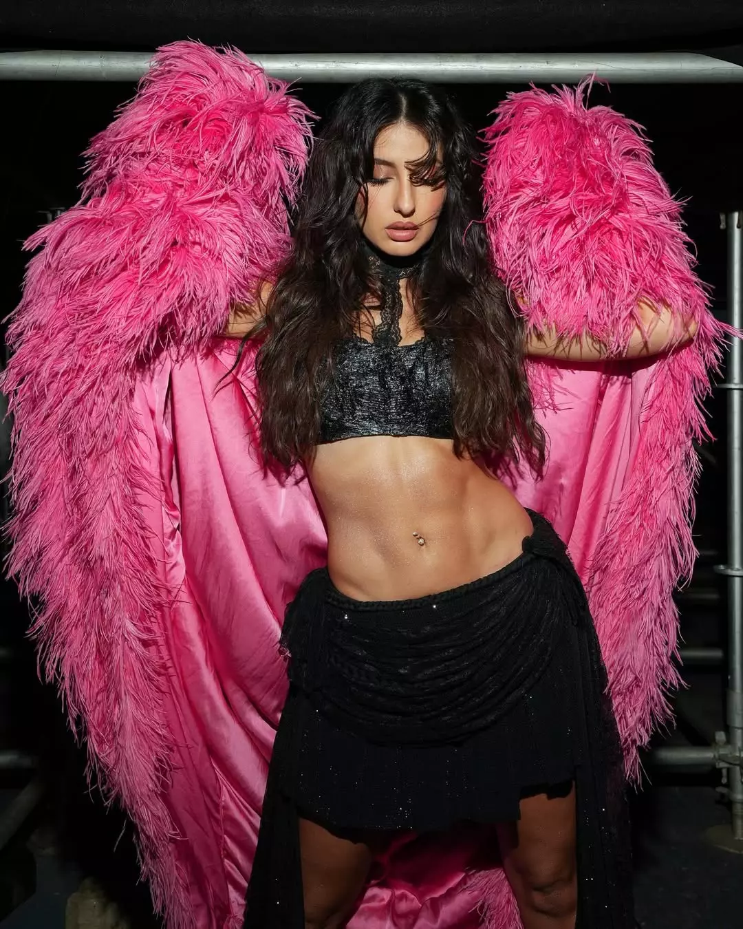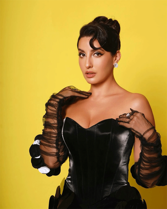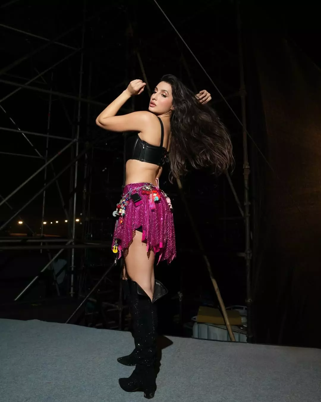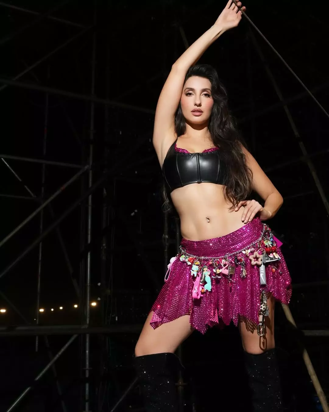 Nora Fatehi sets the stage ablaze in this electrifying photo, striking a bold pose in a sparkling pink sequined mini skirt adorned with playful charms, paired with a black leather corset top, thigh-high glitter boots, and a confident, fierce expression. Her high-energy vibe and glamorous look scream performance-ready glamour, capturing her signature dance-floor dominance and sultry charisma.