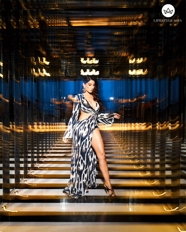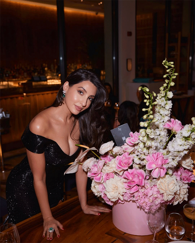 Nora Fatehi sets the stage ablaze in this electrifying photo, striking a bold pose in a sparkling pink sequined mini skirt adorned with playful charms