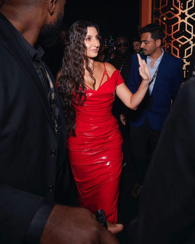 Meanwhile Nora Fatehi shared a new picture on Instagram in which she is seen in front of a gold wall in a deep red dress with a side slit.
