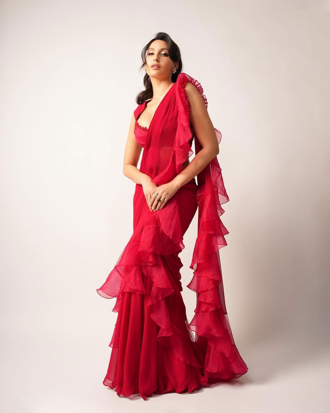 Meanwhile Nora Fatehi shared a new picture on Instagram in which she is seen in front of a gold wall in a deep red dress with a side slit. Her look was complemented by sparkling jewellery from Saltanat Diamond Gallery.