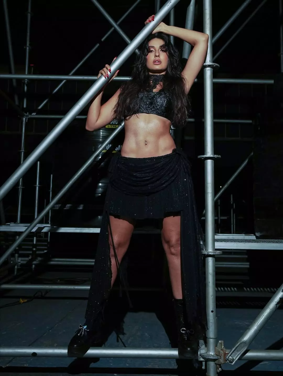 Nora Fatehi strides through the theatre aisle like a cosmic event in motion—sequins flashing, tulle swirling, confidence radiating. Her glittering crop top and micro skirt spark like midnight stardust, while crystal-bow boots anchor the look with pure, irresistible edge. In seconds, Nora transforms an ordinary cinema corridor into a high-voltage fashion moment.