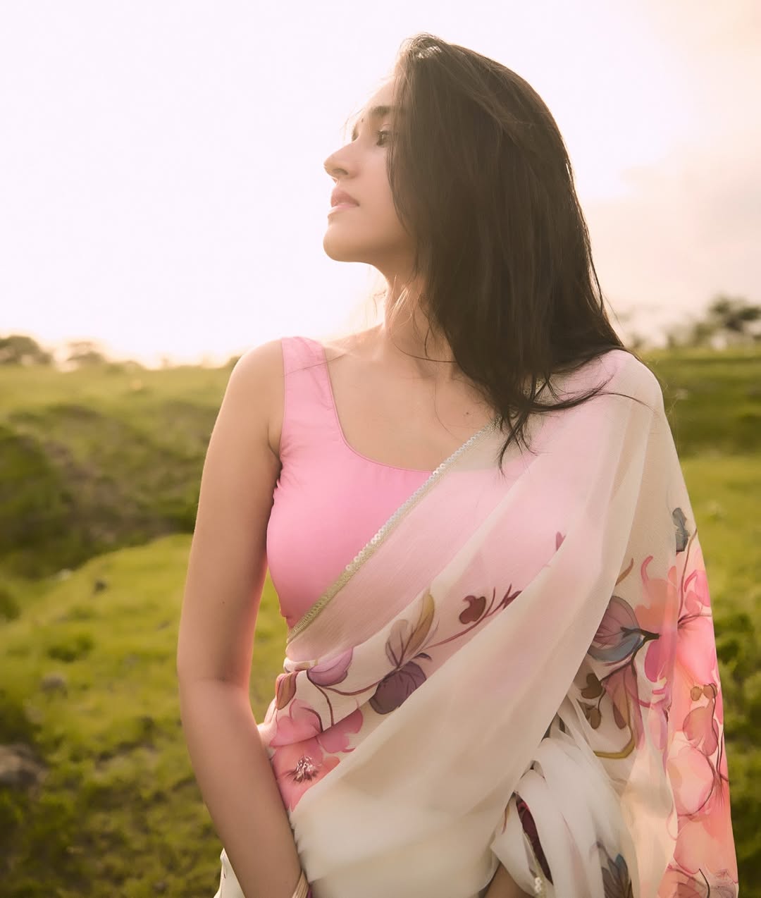 Actor Nuveksha shared a new post on Instagram. She wore a soft floral saree paired with a pink blouse.