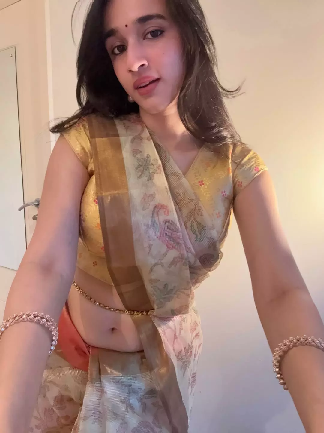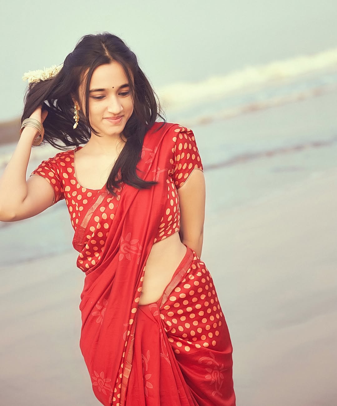 In the shared image, Nuveksha is seen wearing a traditional saree that highlights her natural elegance.