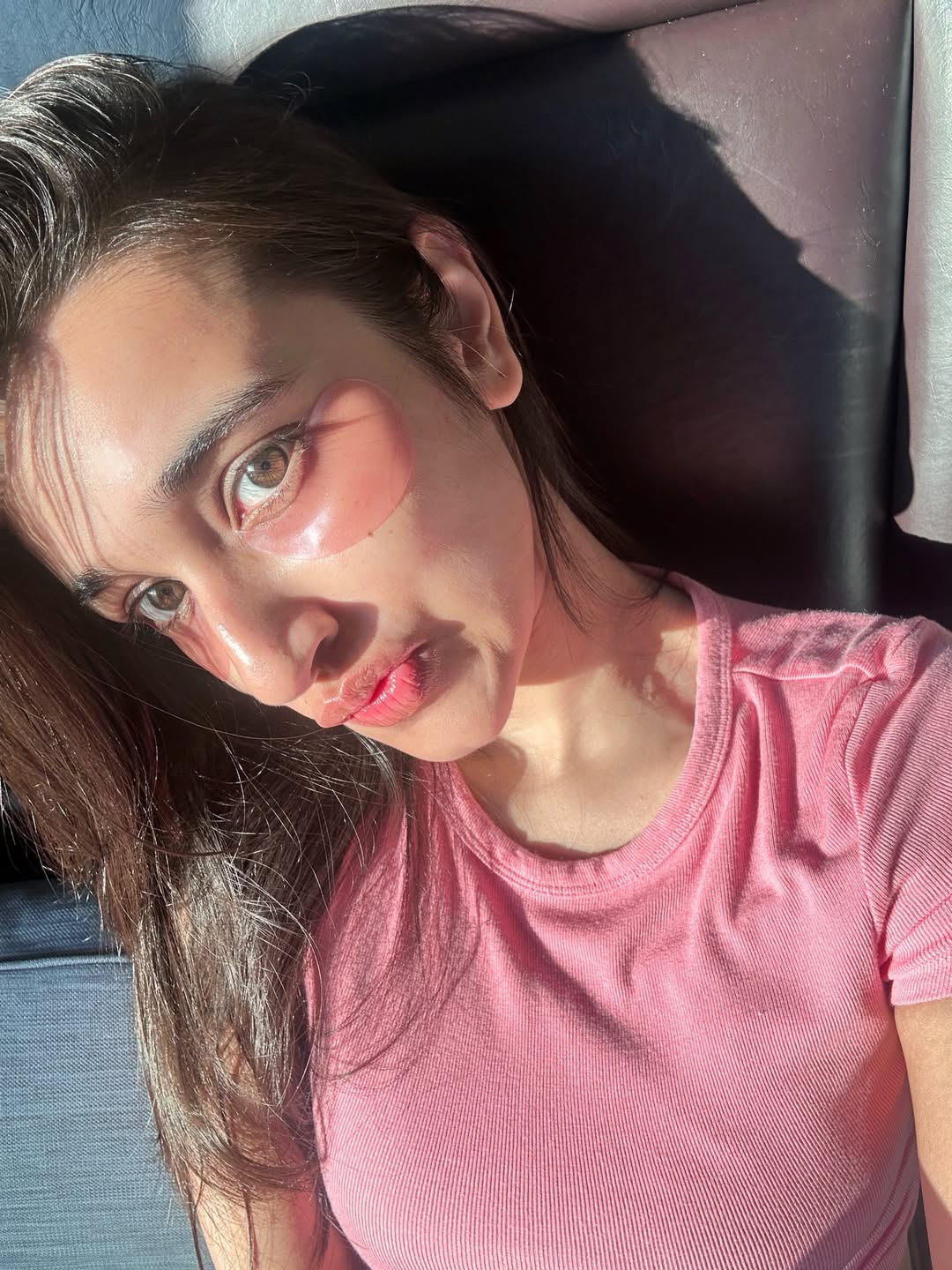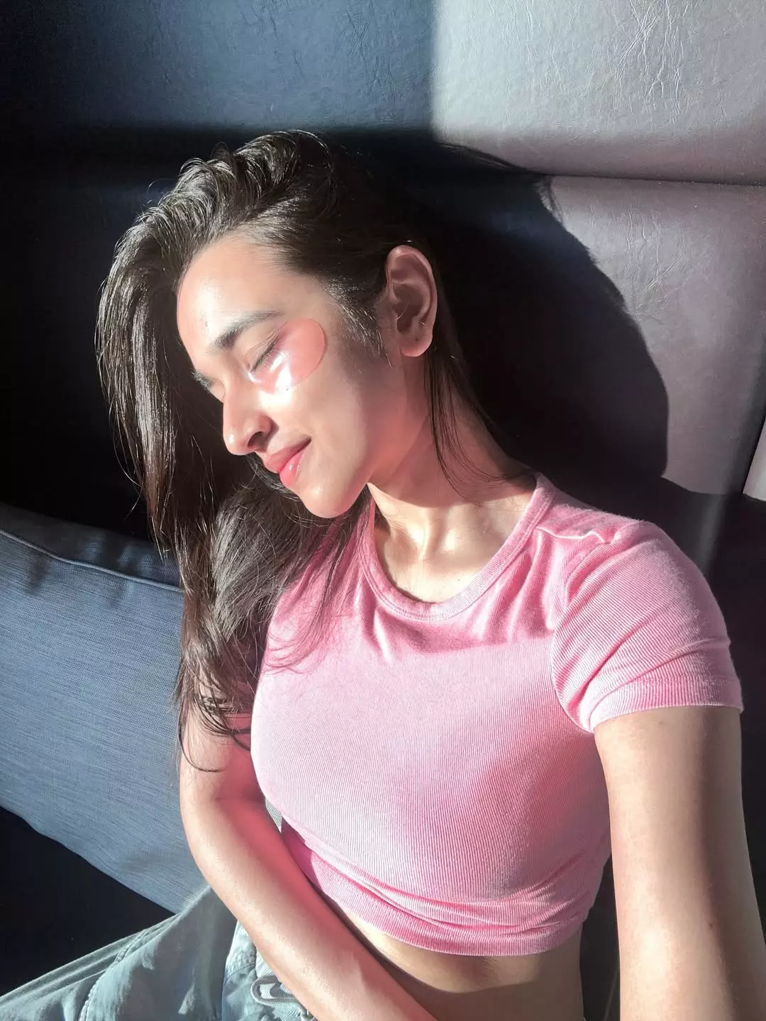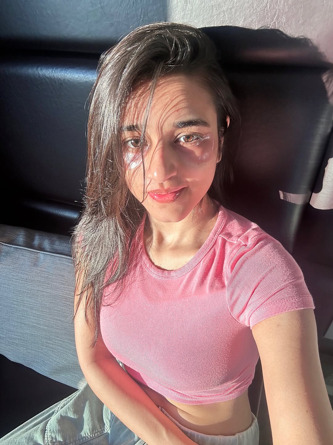 The picture shows Nuveksha sitting comfortably with sunlight covering half of her face. Her hair falls naturally on one side and the glow on her skin shows she is enjoying a moment. There are also small under-eye patches visible, hinting that she might be taking some self-care time before starting her day.