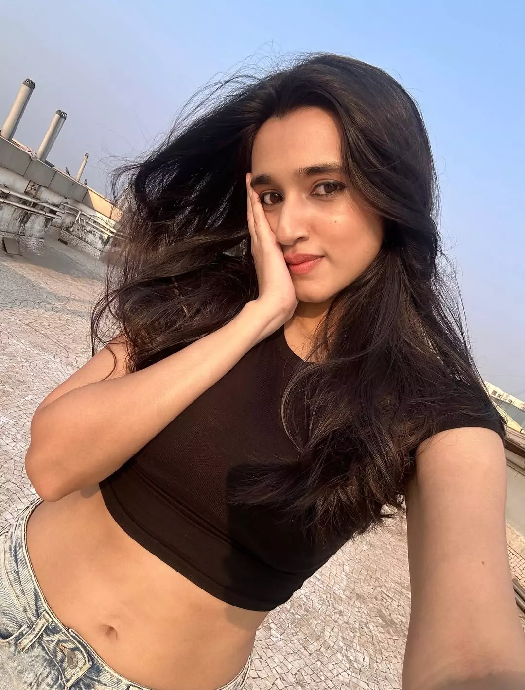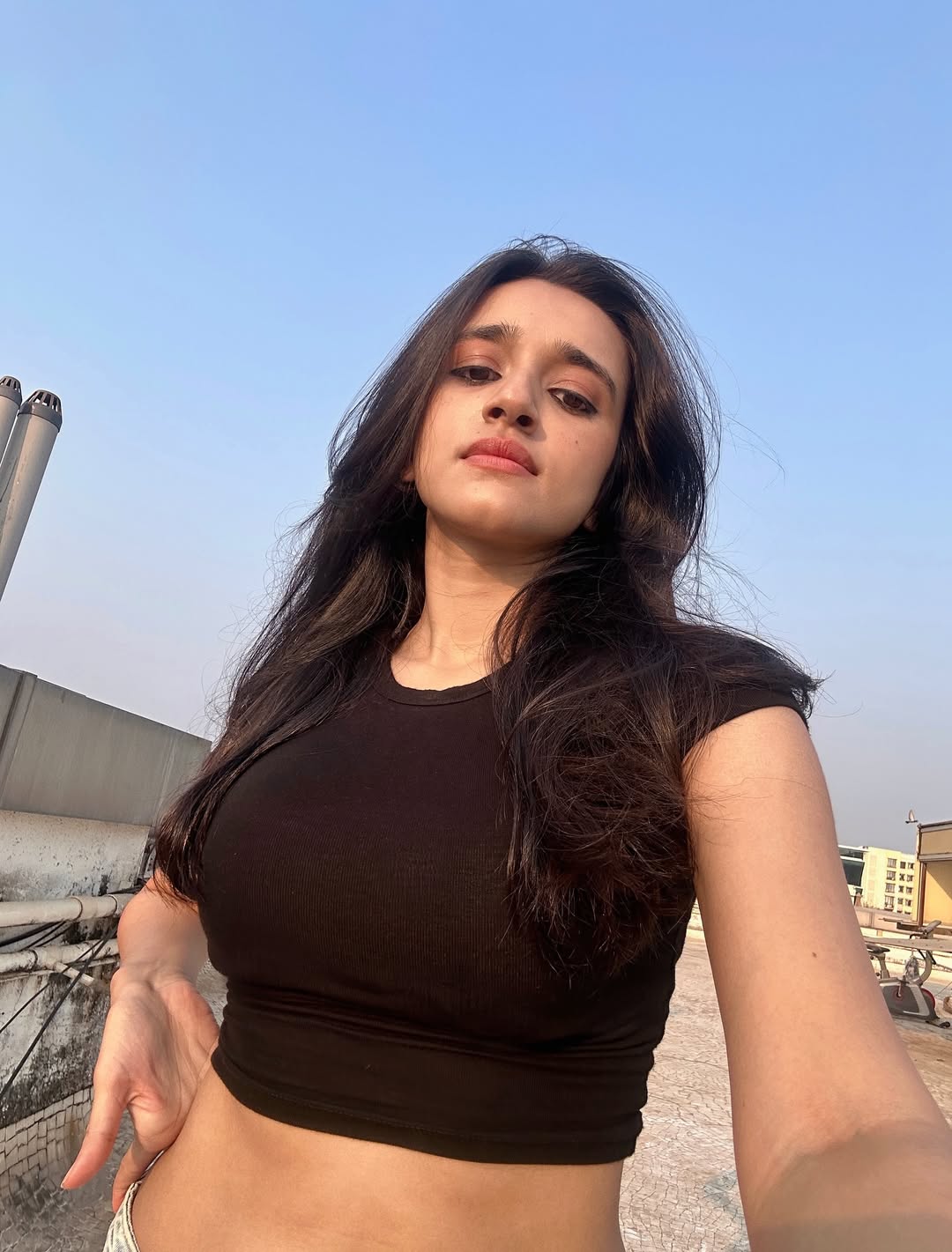 Did you check Nuveksha’s latest Instagram post? If not, you’re in for a treat! The young Telugu film actress just dropped a sunny rooftop selfie that has her fans double tapping in seconds. Wearing a sleek black crop top paired with light blue denim jeans, Nuveksha shows off her natural glow and effortless style. Isn’t that smile absolutely contagious?