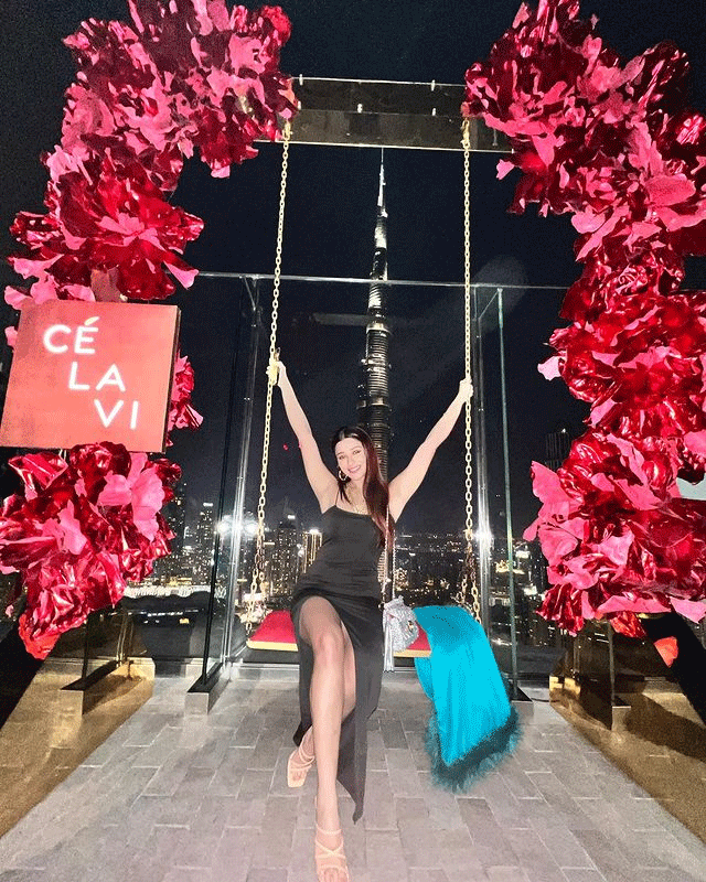 The look is further enhanced by subtle makeup with a pop of pink on her lips and eyelids. Black mascara and flowing open hair complete the picture, showcasing her natural beauty. For a touch of whimsy, Nyrraa adds eye-designed slippers, adding a playful touch to the overall look.