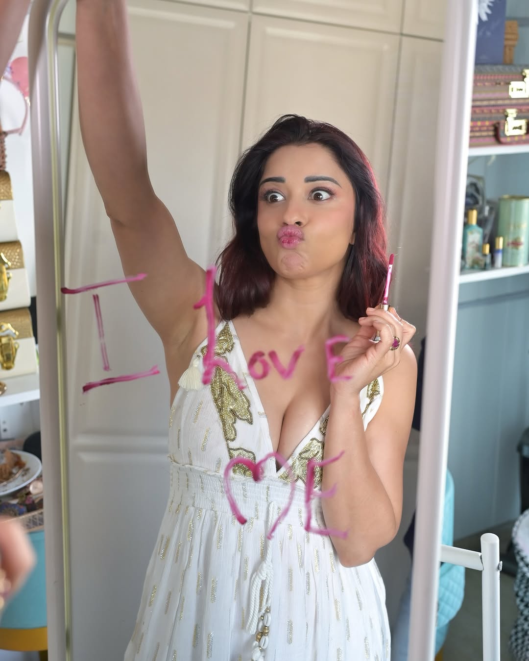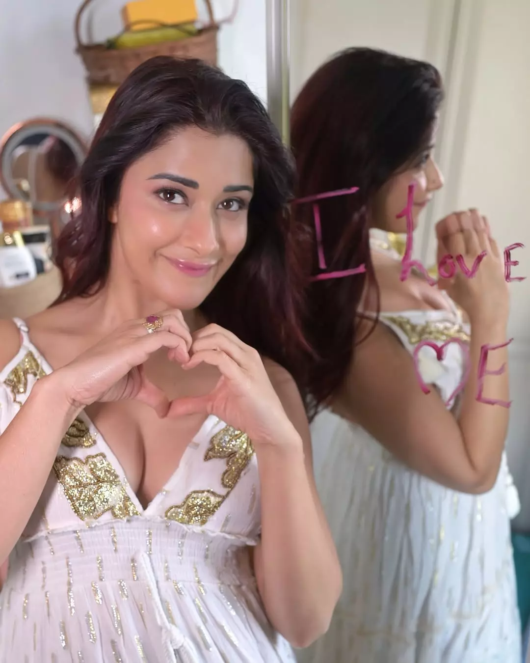 Nyrraa M Banerji radiates timeless elegance in this captivating Valentine's Day photoshoot, embodying pure romance and grace. Draped in a flowing white sheer gown with delicate lace details, she poses against a dramatic red backdrop, one arm gracefully raised while cradling a lush bouquet of vibrant red roses. Her long, wavy dark hair frames her flawless makeup—bold red lips and smoky eyes—creating a mesmerizing contrast of white like peace, red like love . The look perfectly captures "Soft heart. Strong energy. Pure intentions this Valentine’s." With a serene yet powerful gaze, she declares: "Love isn’t something I look for… it’s something I radiate. " #ValentinesVibes #RedAndWhite #SoftGirlEnergy #LoveFrequency #ValentineLook #ElegantStyle #SelfLoveEra #ReelIndia #ExplorePage #ViralReelsBorn on May 14, 1987, in Mumbai, Nyrraa (also known as Nyra Banerjee or Madhurima Banerjee) began her career in South Indian cinema with her debut in the Telugu film Aa Okkadu (2009). She ventured into Bollywood with roles in Kamaal Dhamaal Malamaal (2012) and gained attention in One Night Stand (2016). Transitioning successfully to television, she starred as the lead in supernatural thrillers like Divya Drishti and Pishachini, earning widespread acclaim. She also participated in reality shows such as Khatron Ke Khiladi 13 (2023) and Bigg Boss 18 (2024–2025).