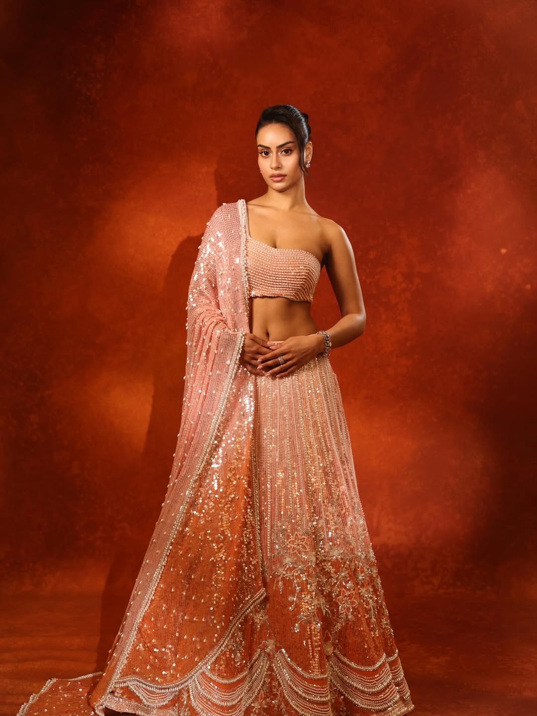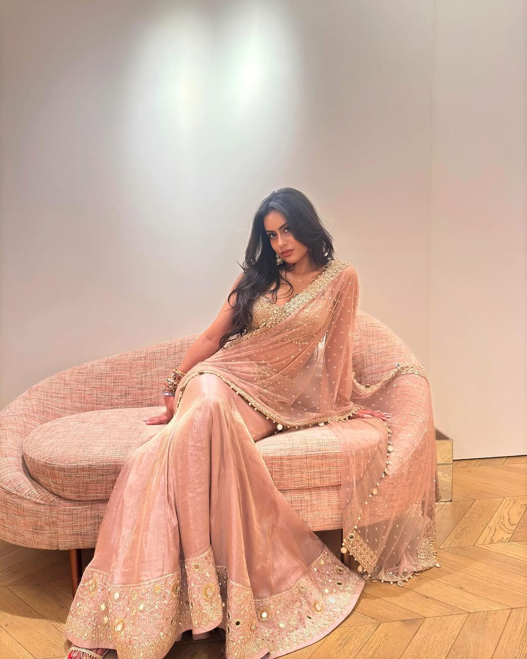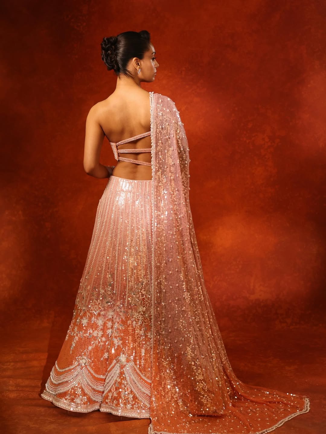 Nysa wore a peach and coral lehenga that shines beautifully under the lights. The skirt features heavy sequin work and fine embroidery, making it perfect for wedding celebrations and sangeet nights. A matching sheer dupatta with delicate detailing completes the dress.