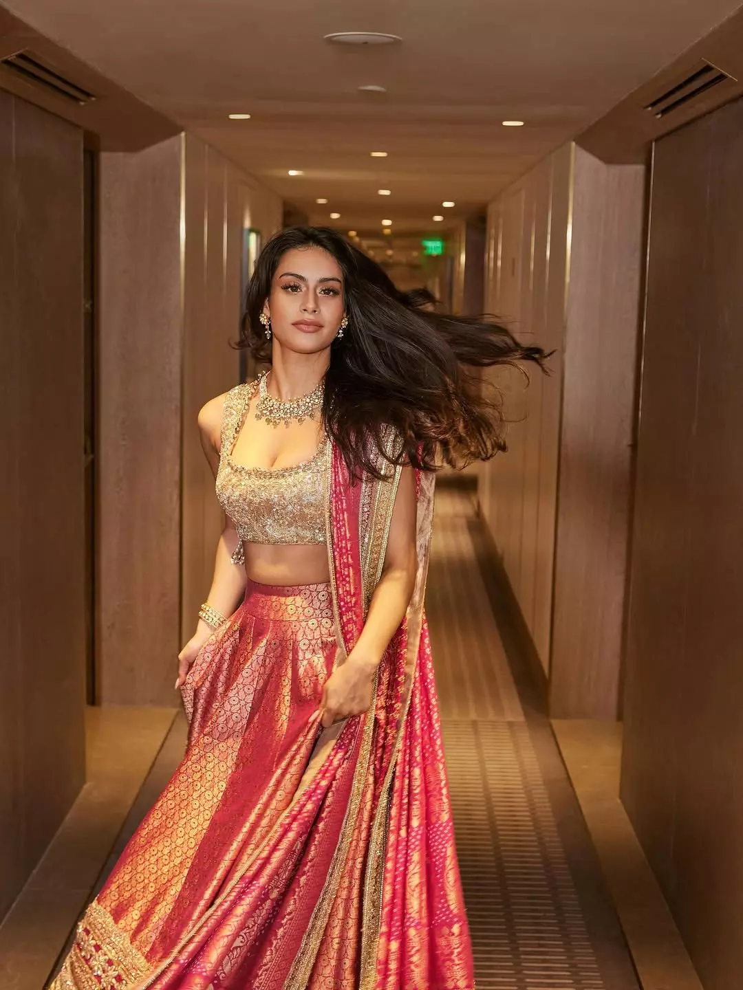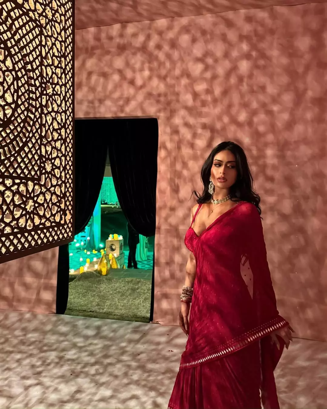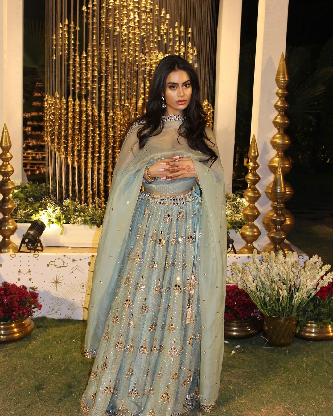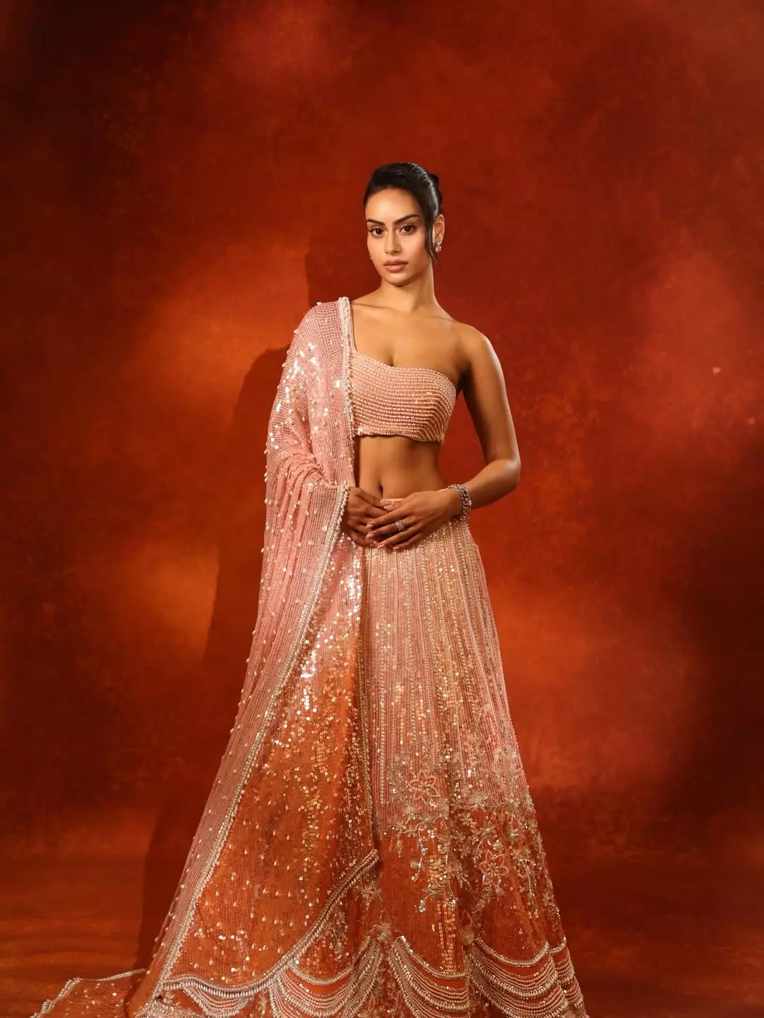 Nysa wore a peach and coral lehenga that shines beautifully under the lights. The skirt features heavy sequin work and fine embroidery, making it perfect for wedding celebrations and sangeet nights. A matching sheer dupatta with delicate detailing completes the dress.