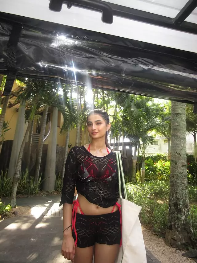 Palak Tiwari is truly soaking in the sun and good vibes as seen in her latest Instagram post from the beaches of Mauritius. She is dressed in a vibrant red and white bikini paired with black tie-up shorts. She is seen with a cheerful peace sign glowing with joy under the palm trees. Her caption read: