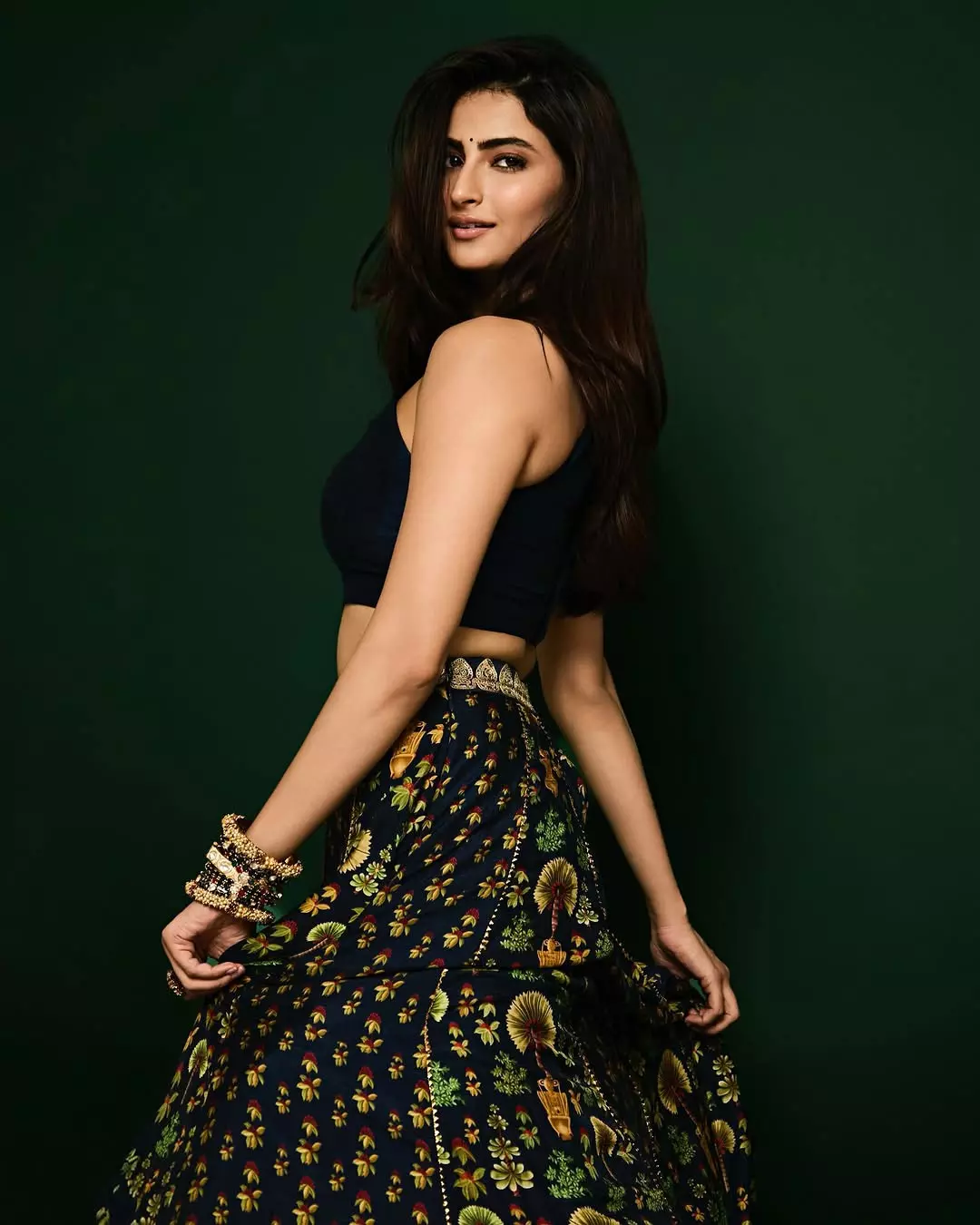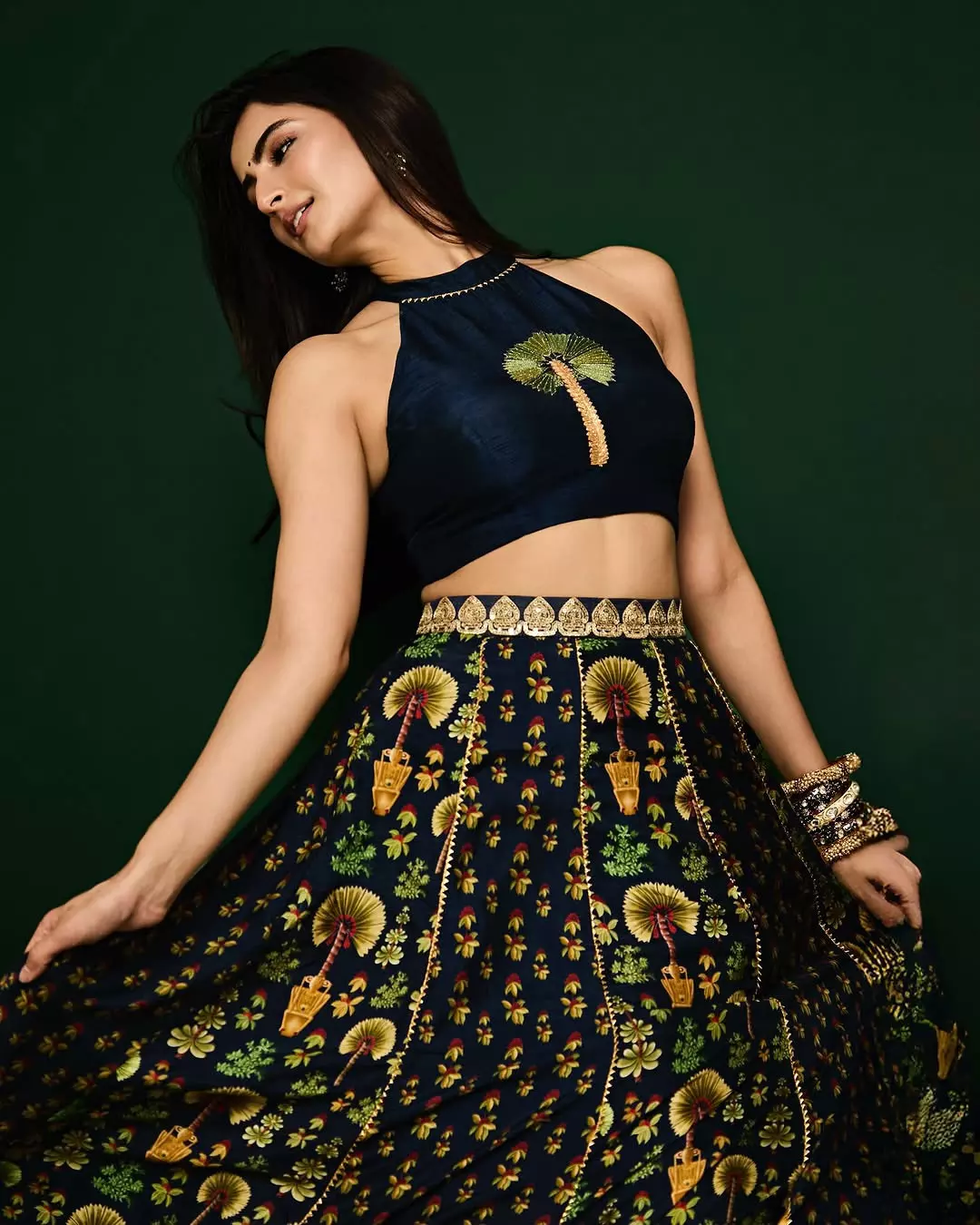By: Tupaki Desk | 28 May 2025 9:35 PM ISTPalak Tiwari recently took to Instagram to share a graceful picture that left her followers delighted. She is seen dressed in a dark blue traditional two-piece set,. Her look featured rich prints of traditional hand fans and lanterns in golden yellow and green. The blouse was matching the printed flowy skirt. Her caption was just a leafy emoji "🌿.”
