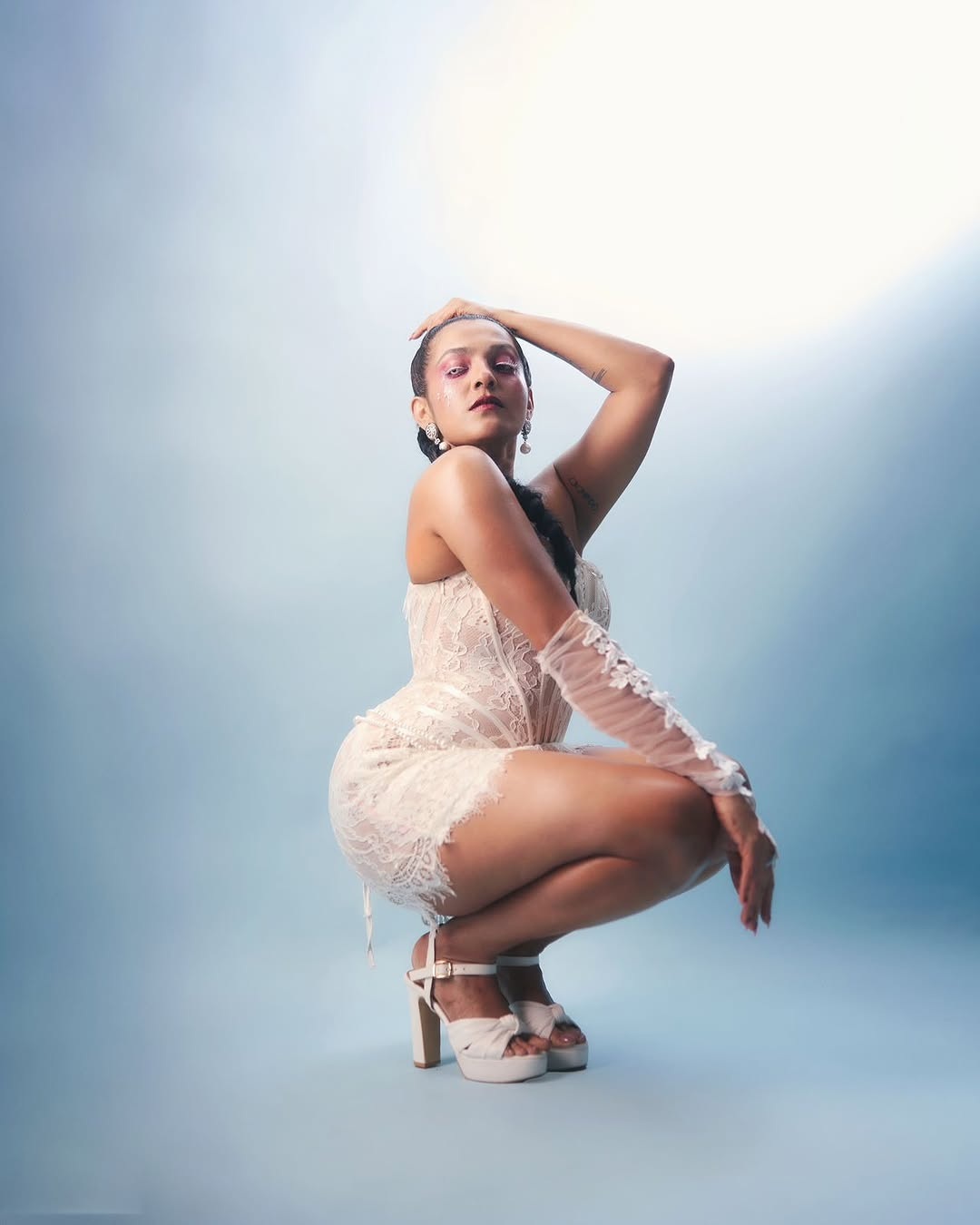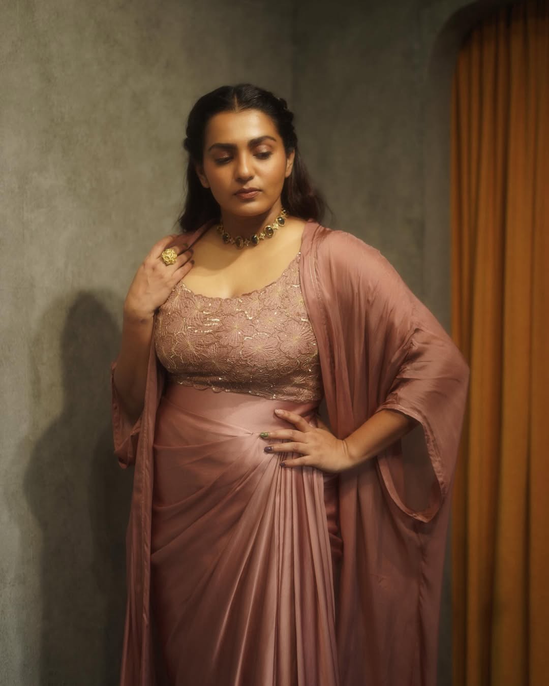 On this joyous Christmas day, acclaimed actress Parvathy Thiruvothu spreads holiday cheer with a stunning photoshoot. Captured elegantly in a form-fitting purple mesh dress adorned with intricate face motifs, a high slit, and halter neckline, she exudes poise and confidence against a minimalist backdrop. Her sleek ponytail, subtle makeup, and clear heels complete the sophisticated look.