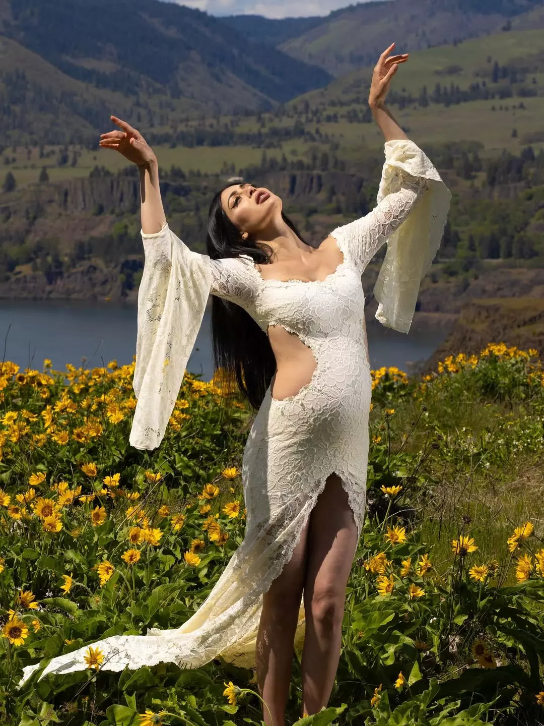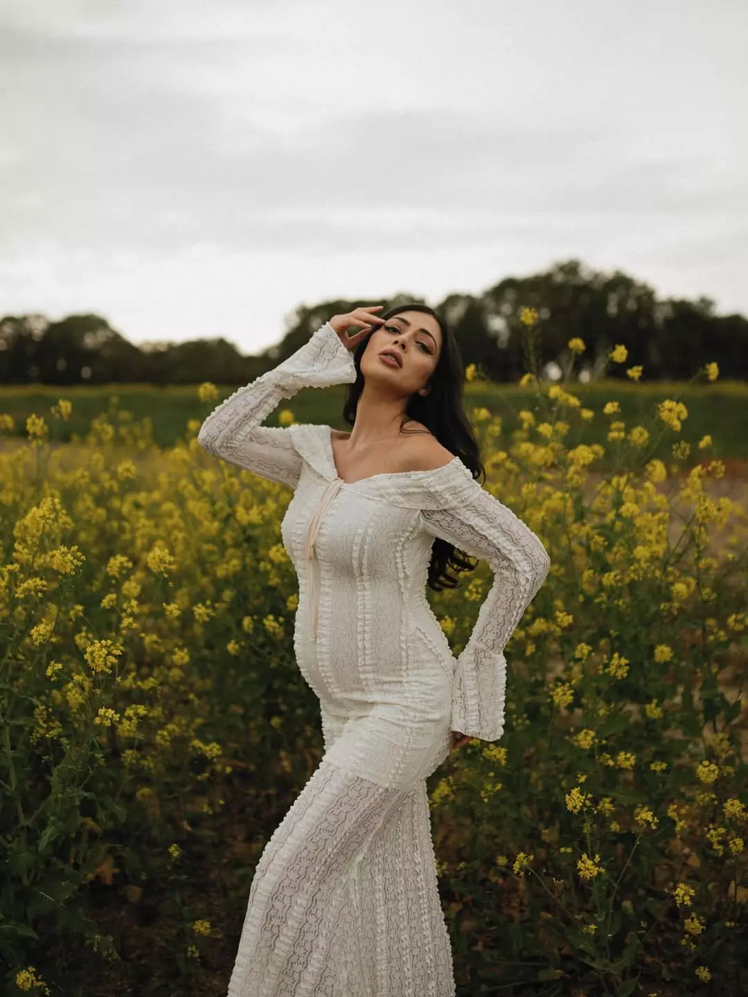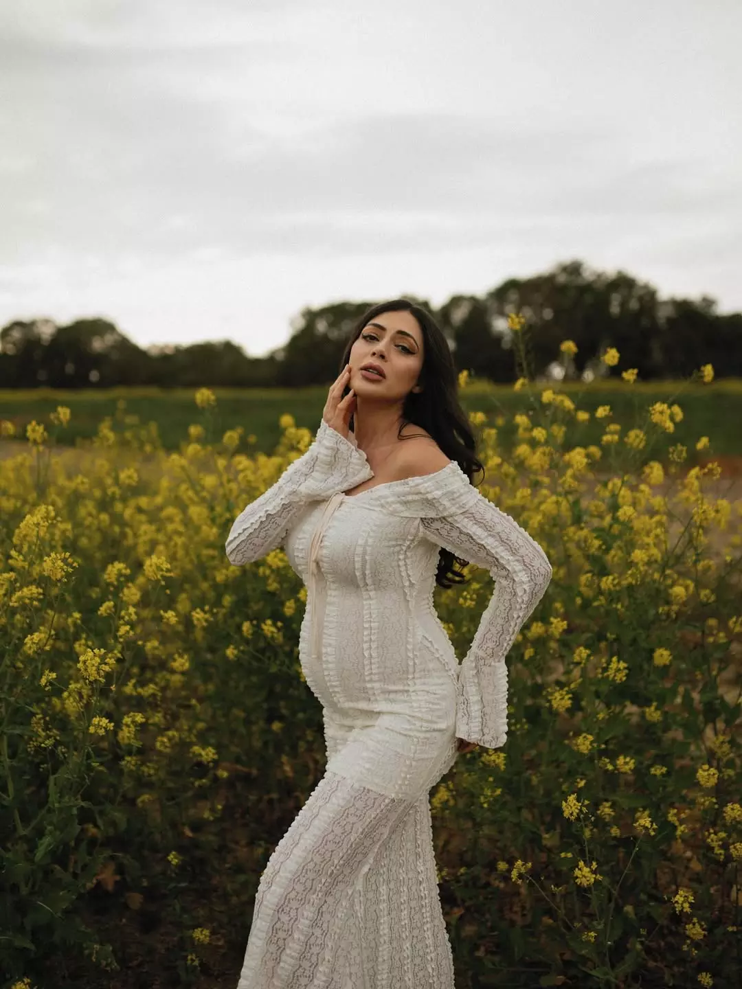 Parvati Melton appeared in a recent maternity shoot shared on Instagram. The picture shows her in a graceful cream dress. The frame is styled with flowers placed around her feet. Her presence gives the image a calm and pure feel.
