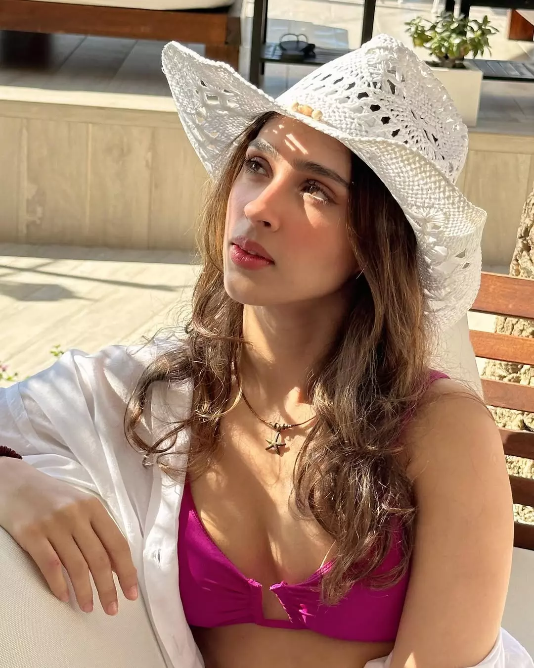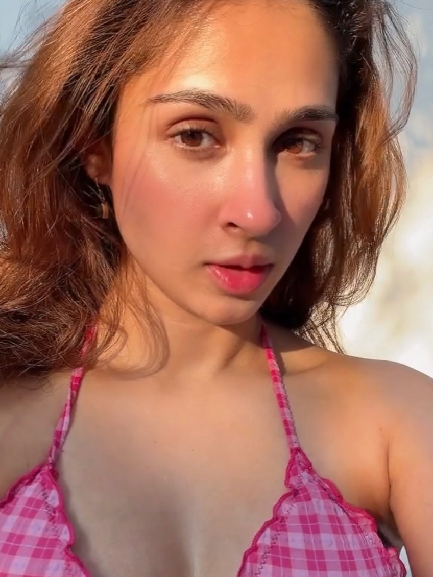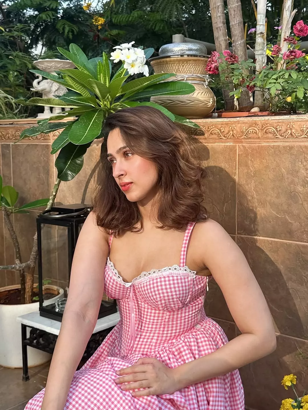 In the photo, Pashmina is seen sitting on a wooden table in an outdoor setting. She is wearing a light pink checked shirt paired with denim shorts.