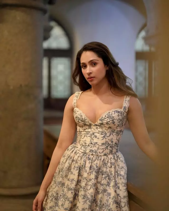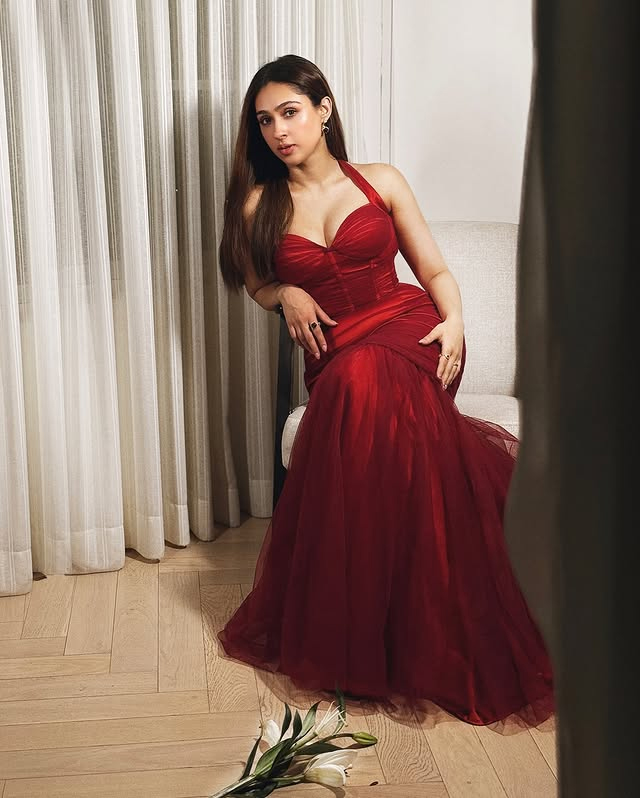 Pashmina Roshan brings a breath of fresh air with her latest look, effortlessly blending vintage charm and modern grace. Dressed in a beautifully structured ivory and blue floral gown, she embodies poise and subtle glamour. The delicate bodice with scalloped detailing adds a touch of romance, while the full skirt creates a princess like silhouette that’s both timeless and chic.