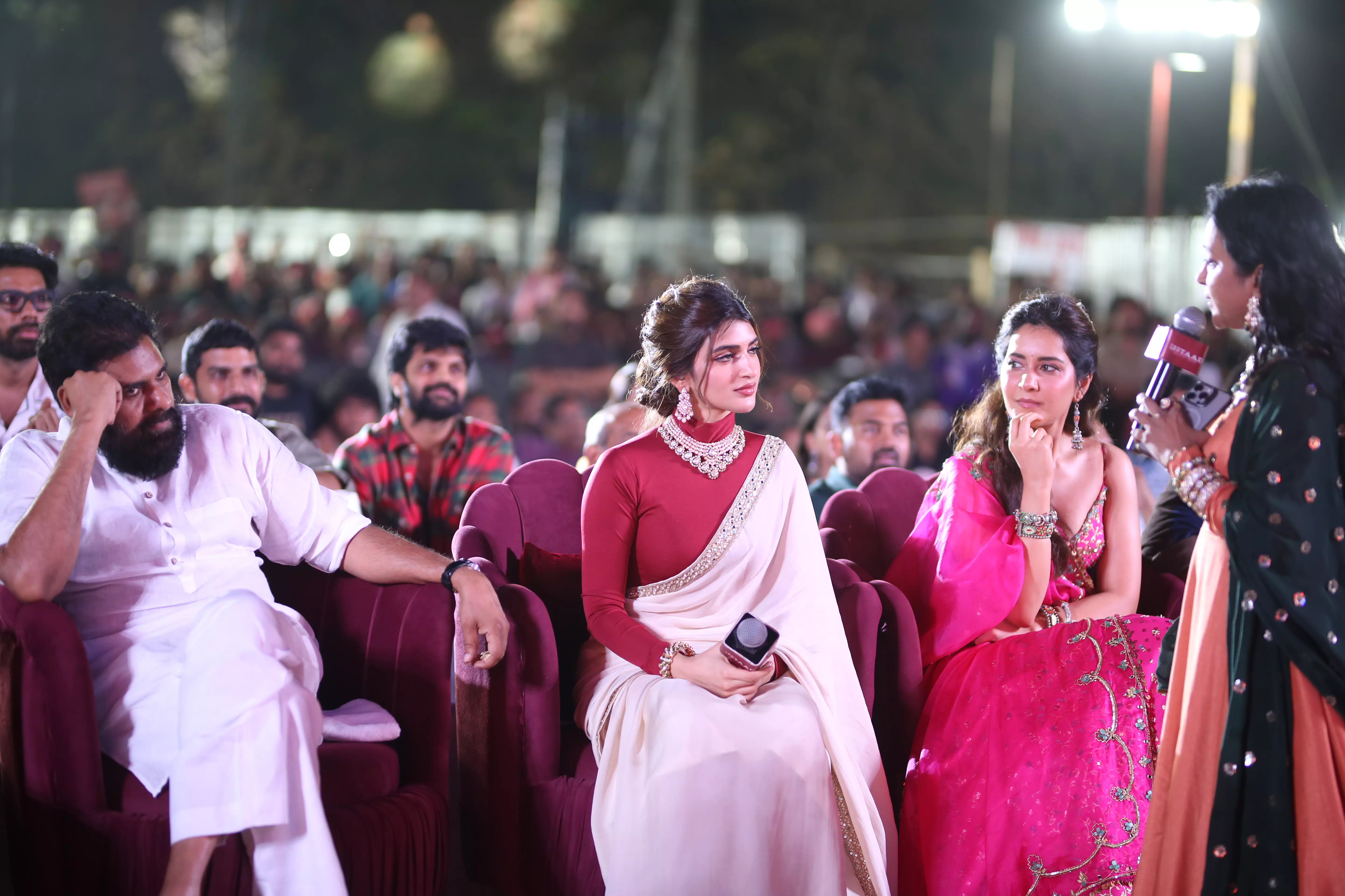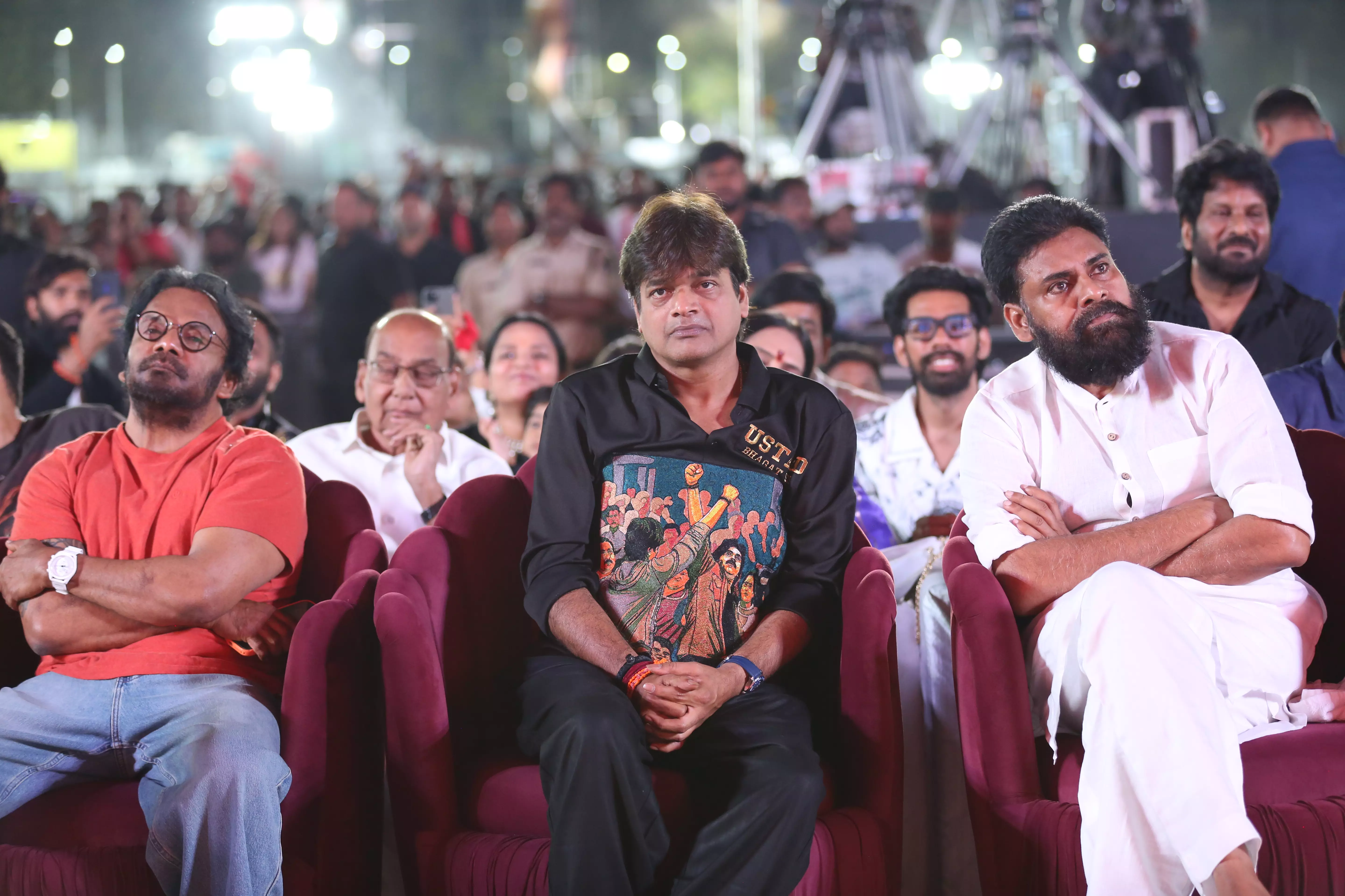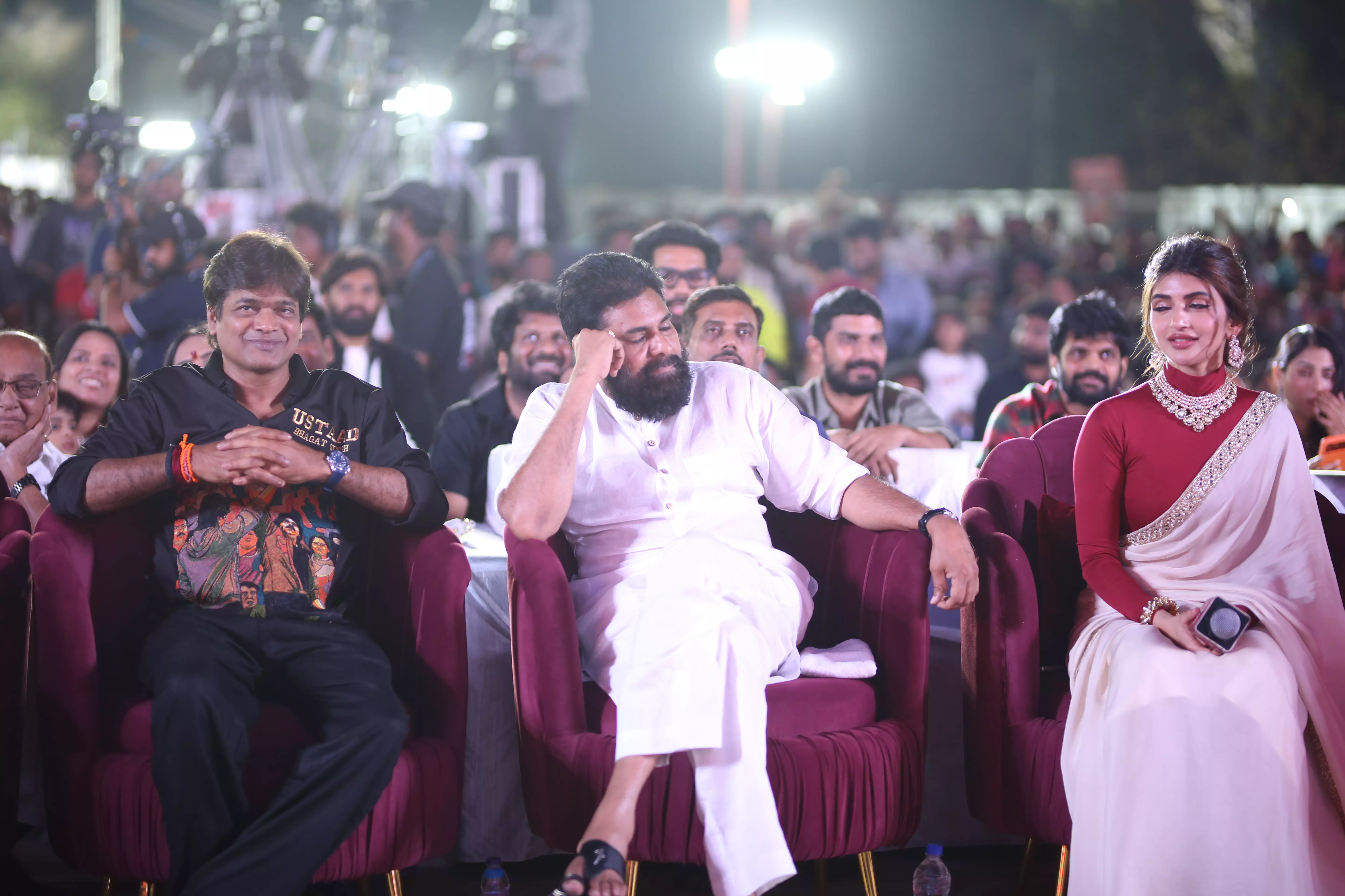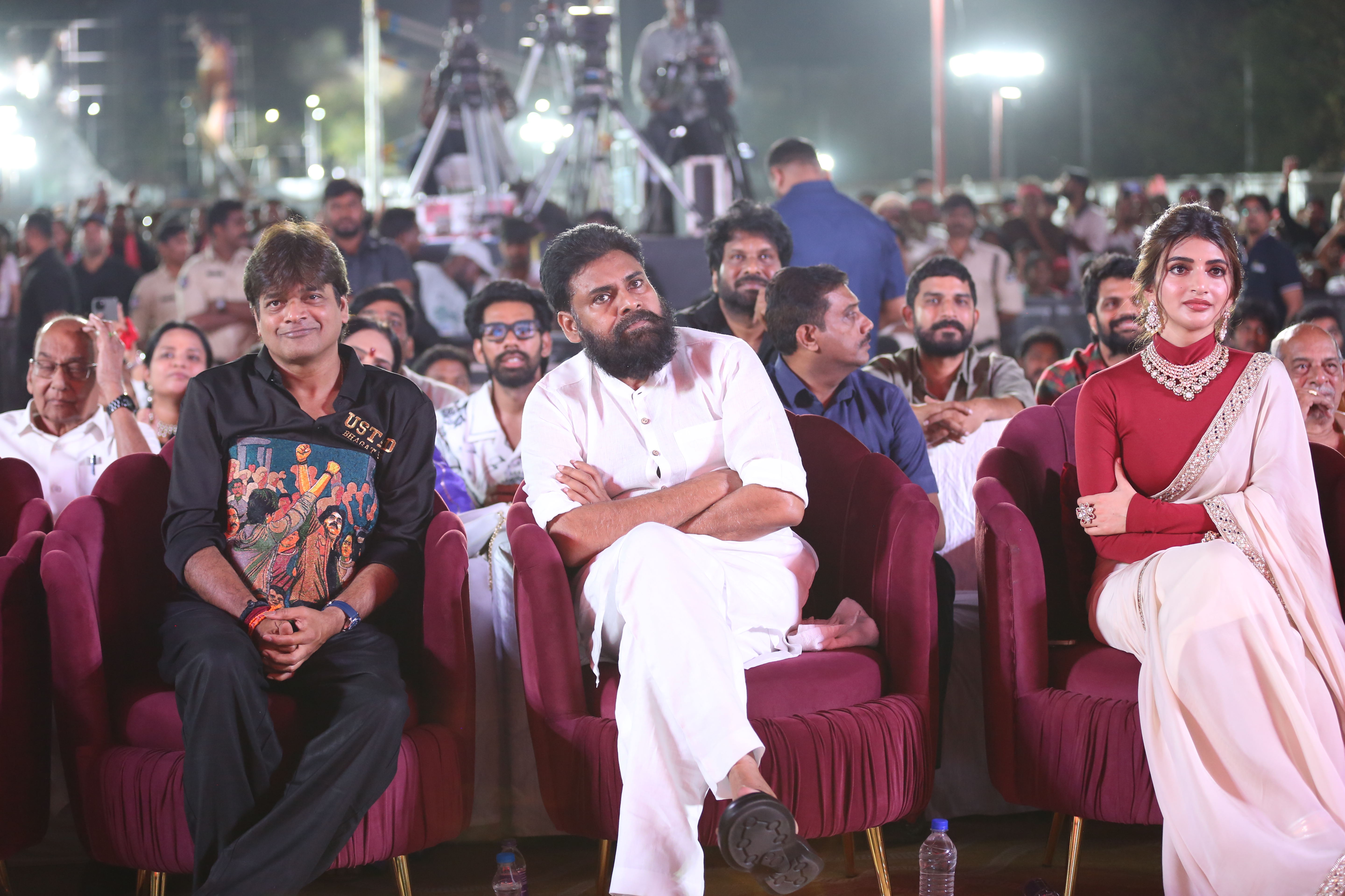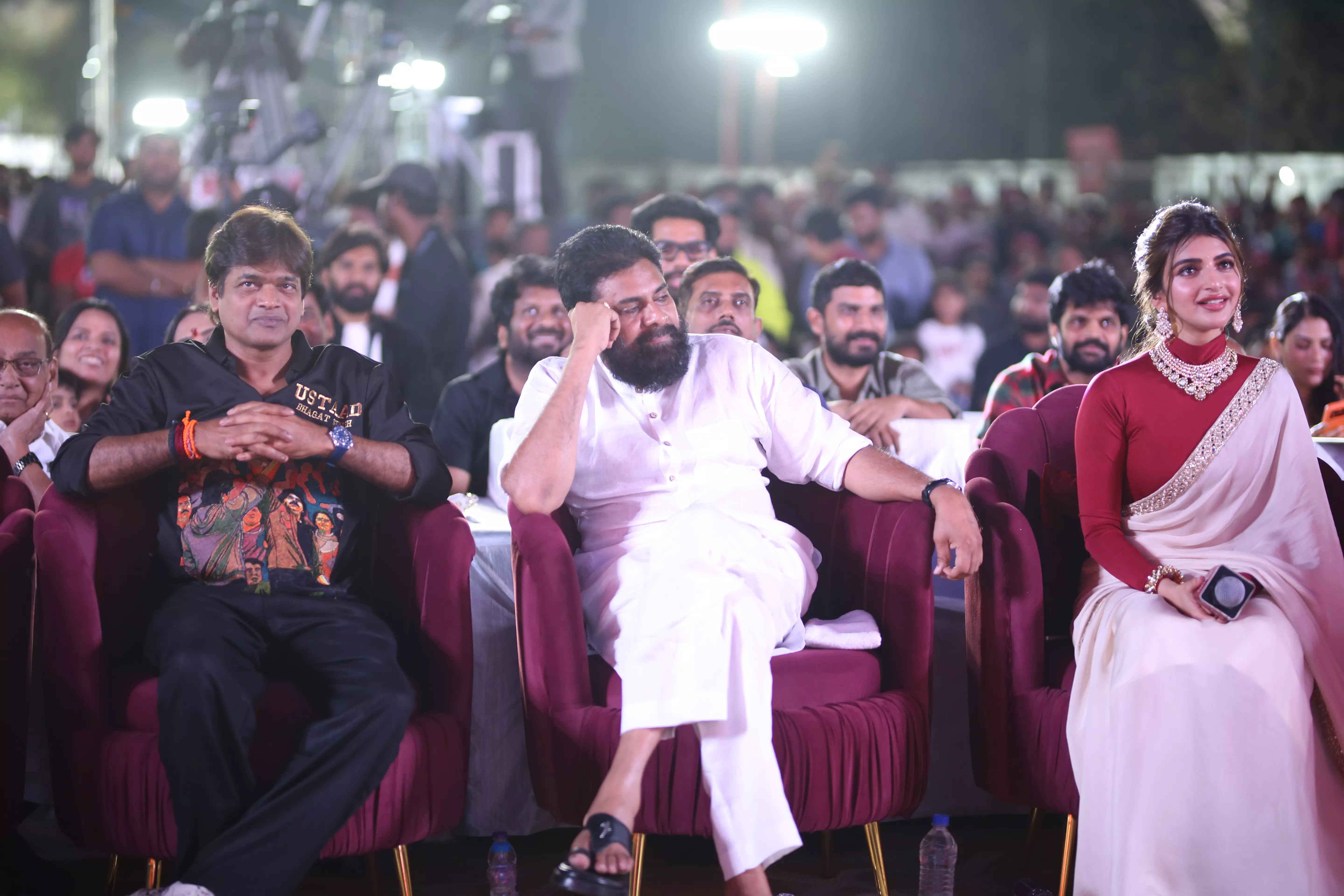 Adding glamour and charm to the star-studded event were actresses Raashi Khanna and Sreeleela, whose radiant presence captivated everyone. Both stars engaged warmly with fans, posed for pictures, and brought vibrancy to the stage, making the event visually spectacular. Their coordinated elegance alongside Pawan Kalyan highlighted the film’s star power, and the crowd’s enthusiasm reflected the strong anticipation for the movie’s release.