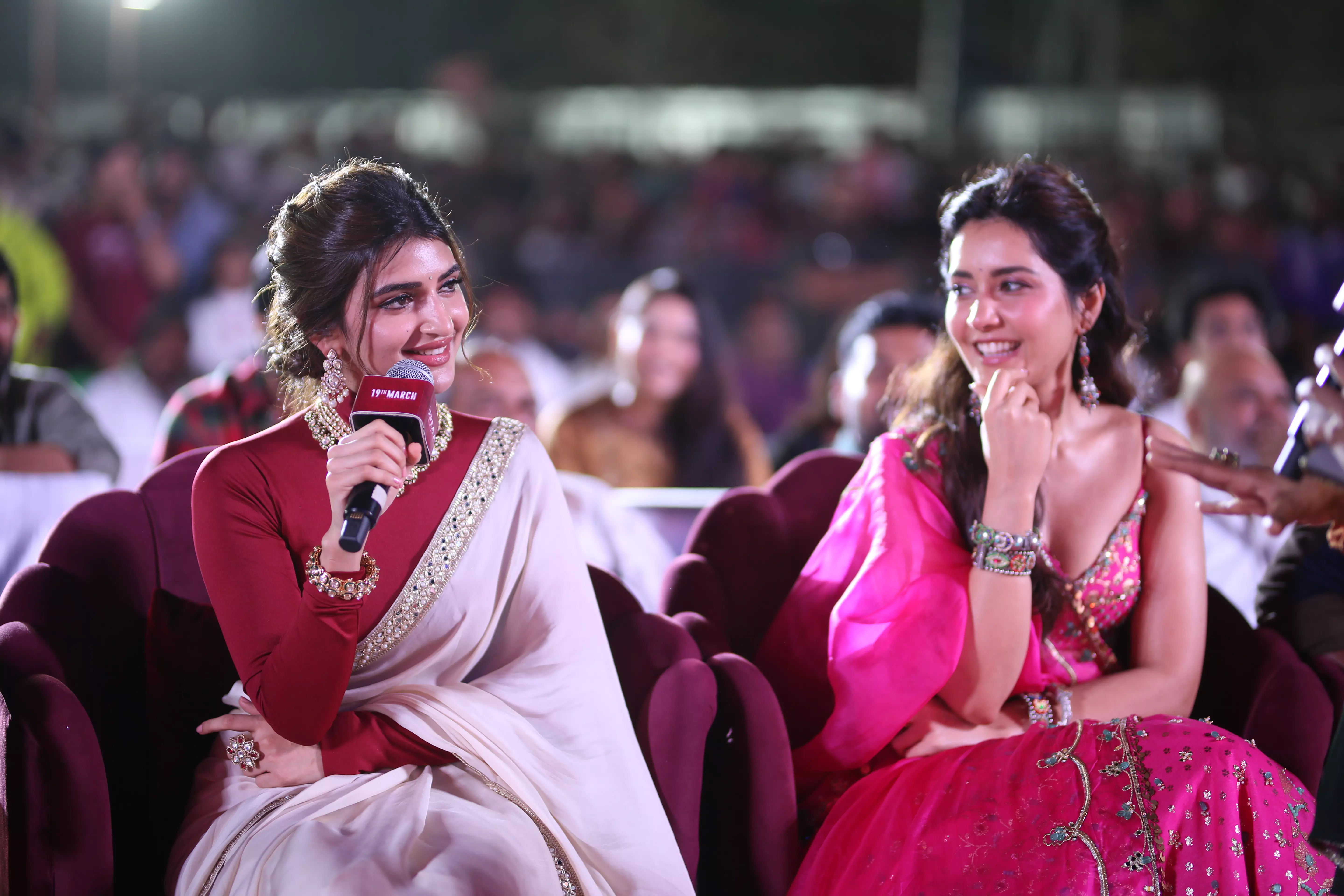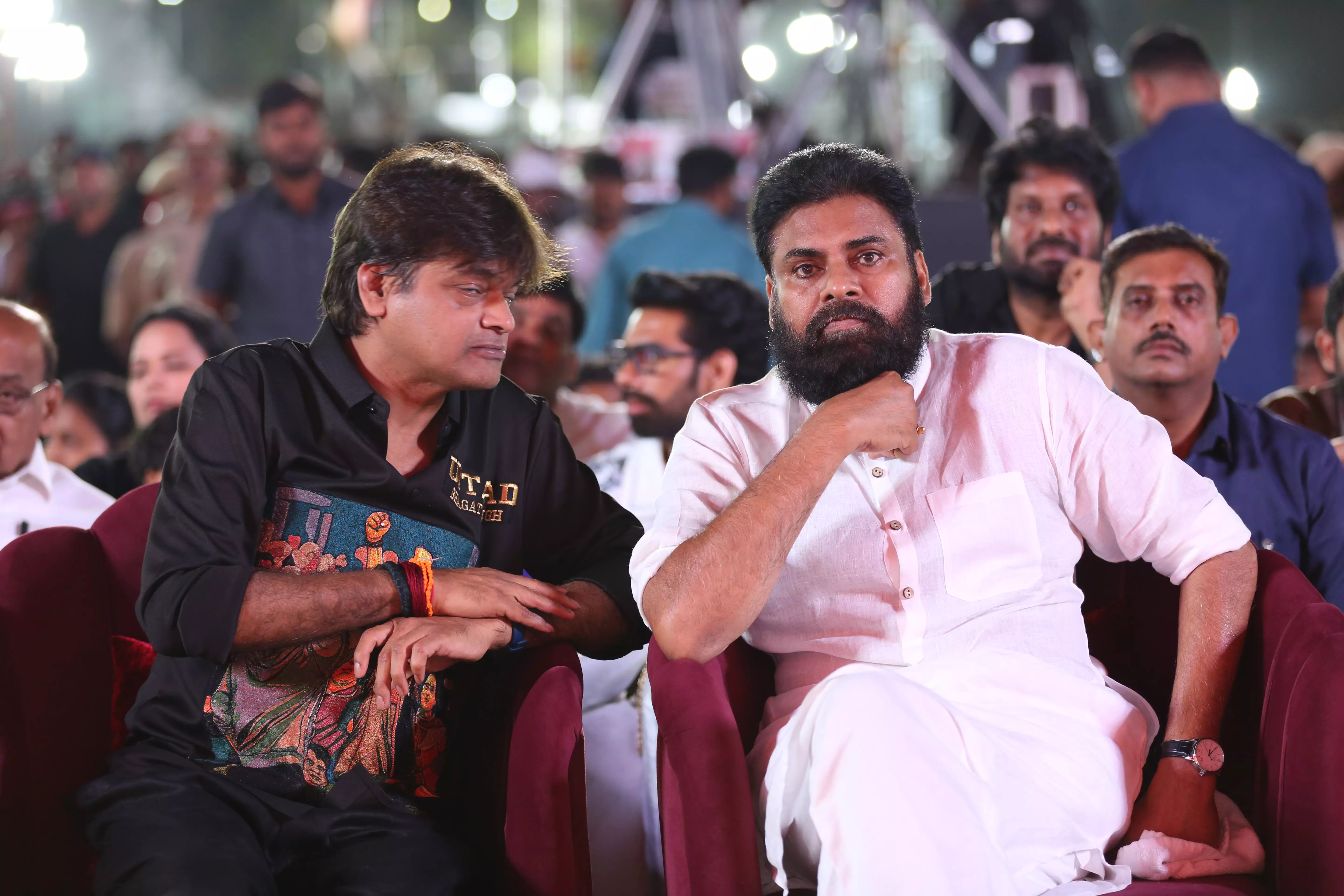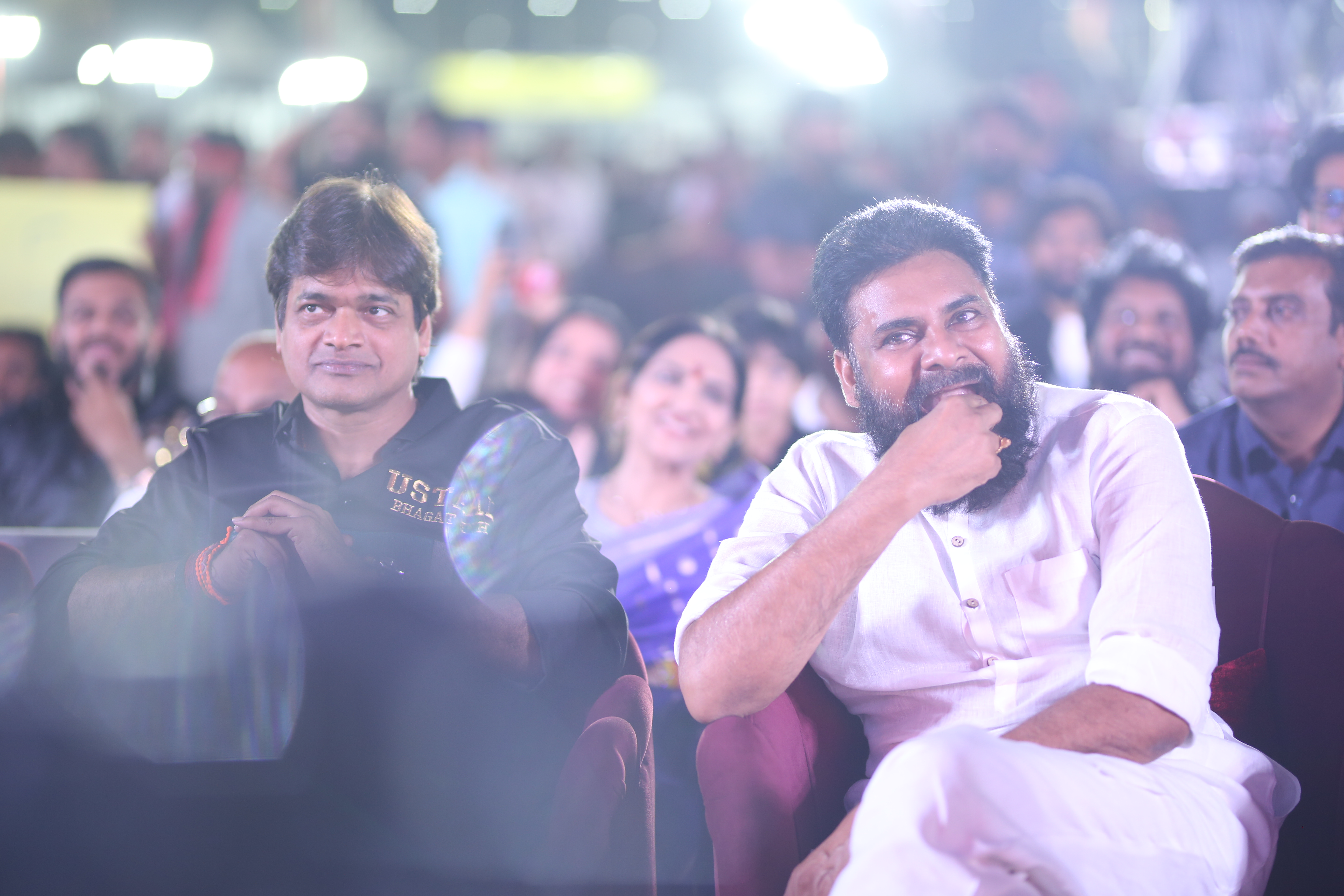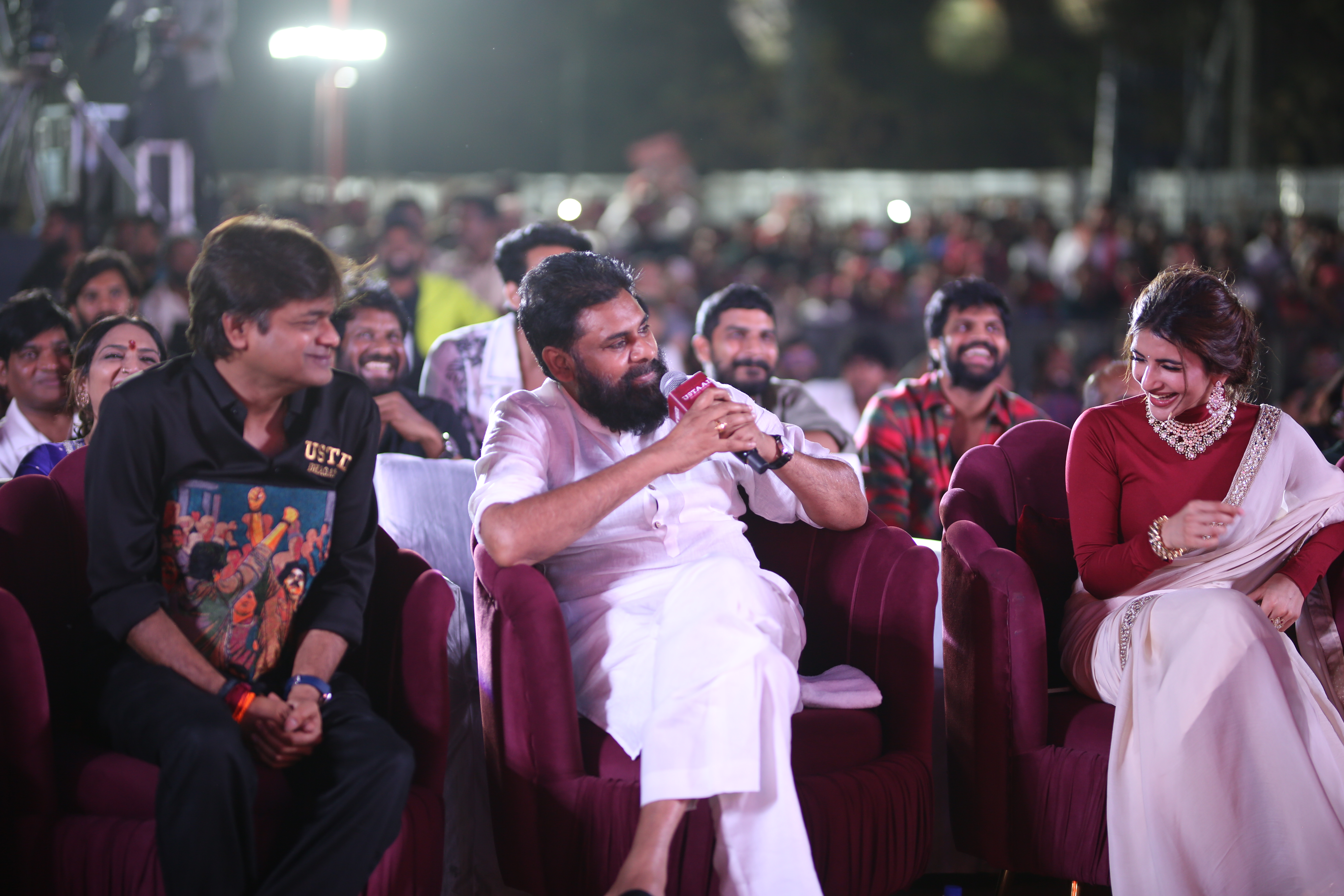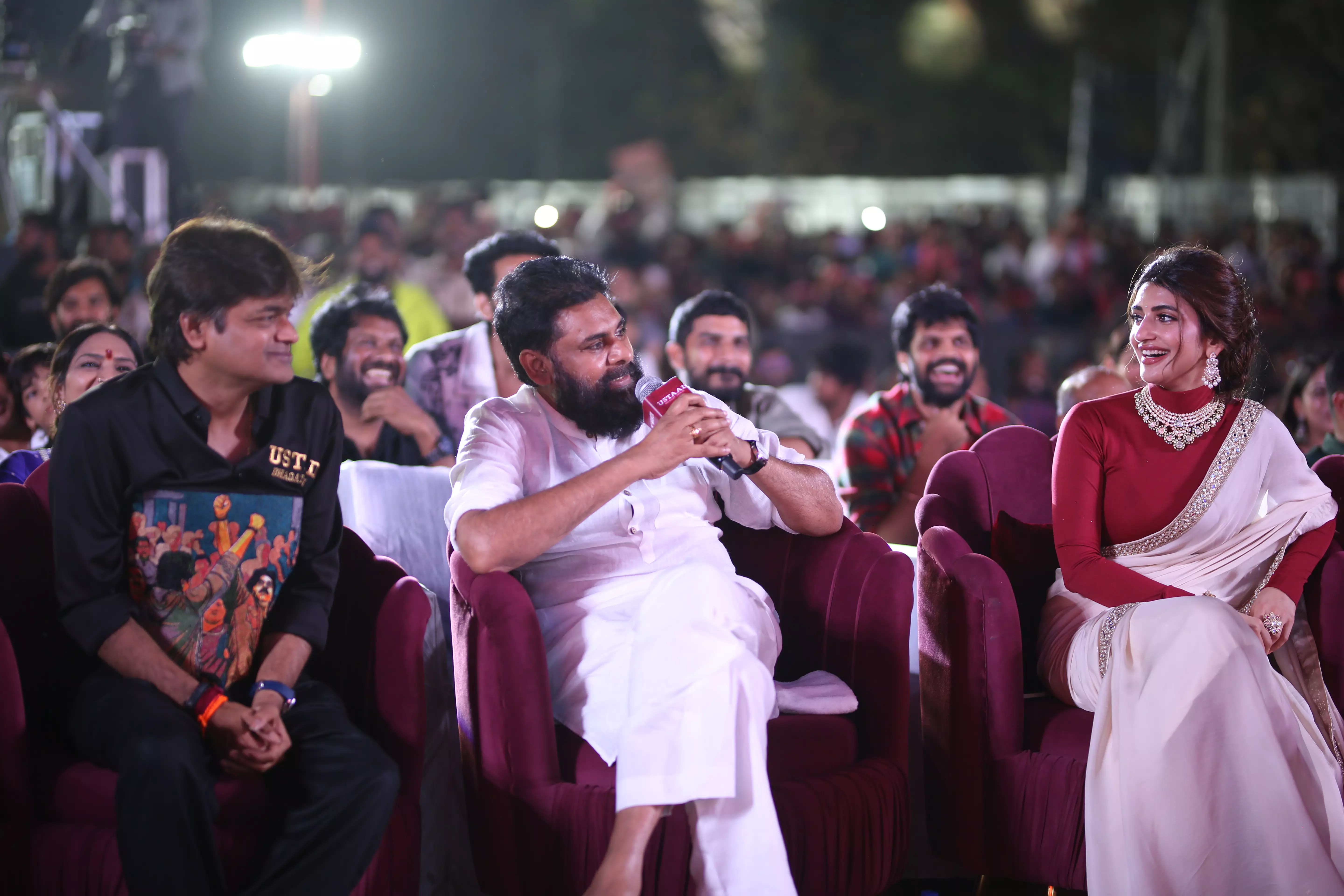 Adding glamour and charm to the star-studded event were actresses Raashi Khanna and Sreeleela, whose radiant presence captivated everyone. Both stars engaged warmly with fans, posed for pictures, and brought vibrancy to the stage, making the event visually spectacular. Their coordinated elegance alongside Pawan Kalyan highlighted the film’s star power, and the crowd’s enthusiasm reflected the strong anticipation for the movie’s release.