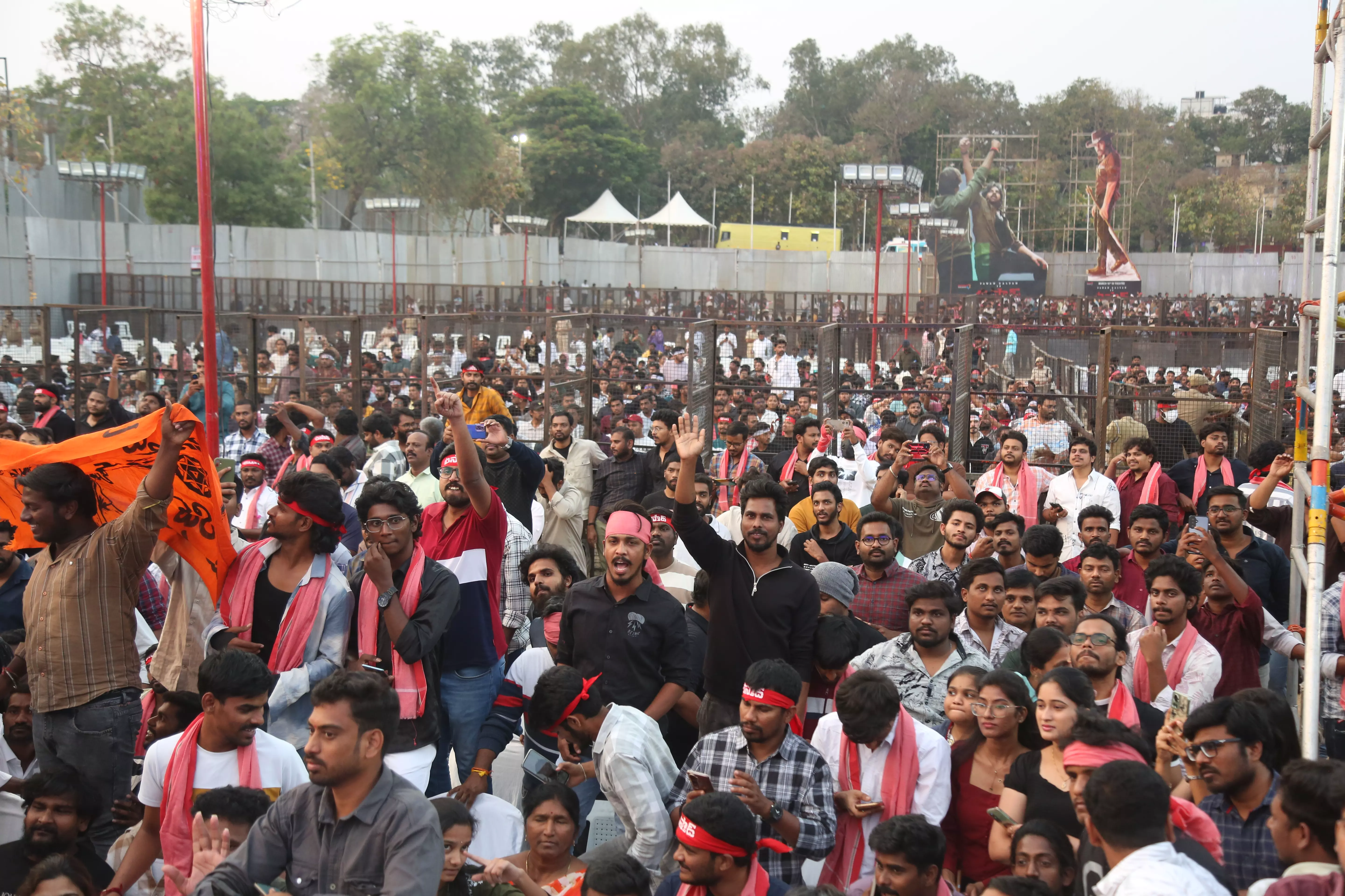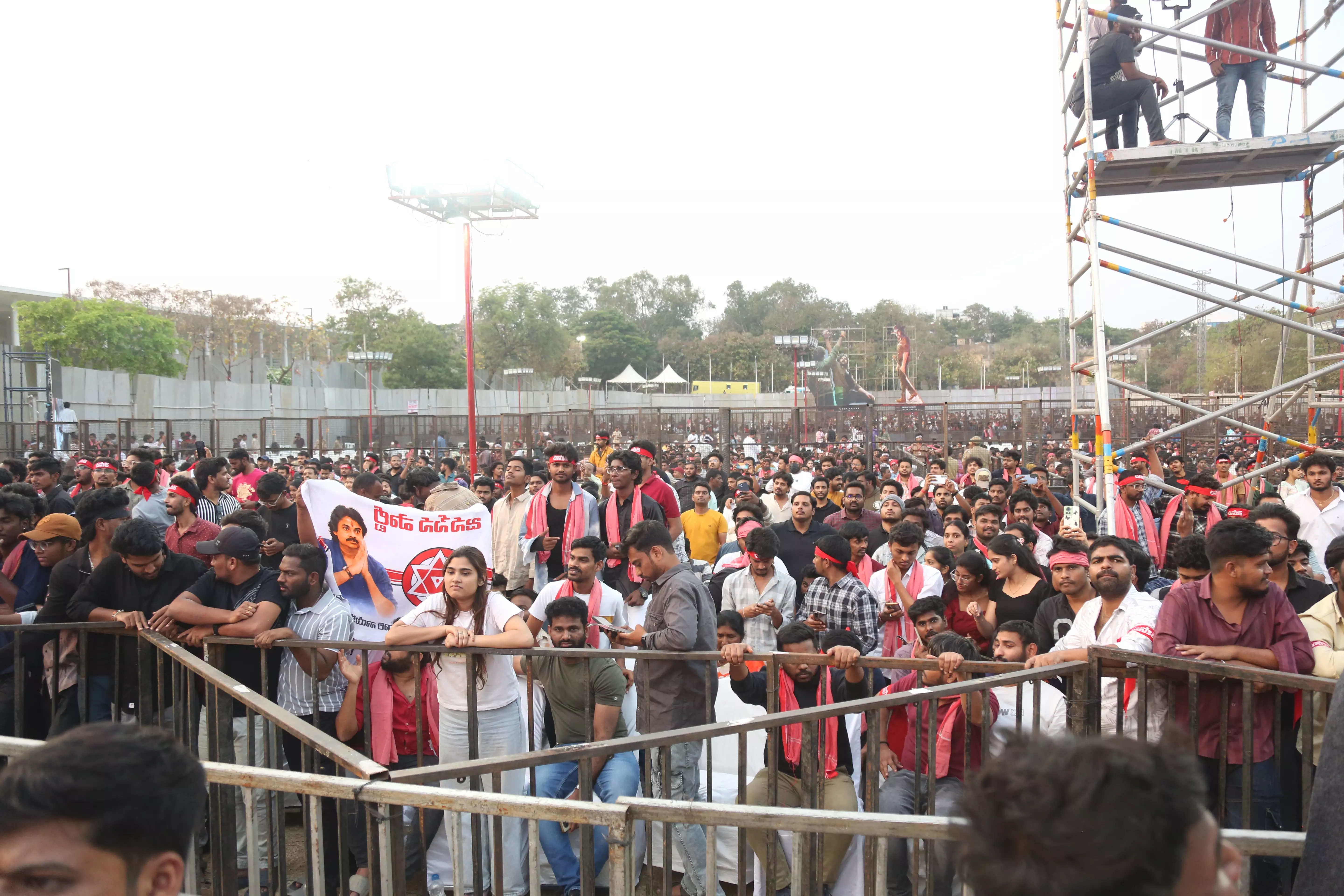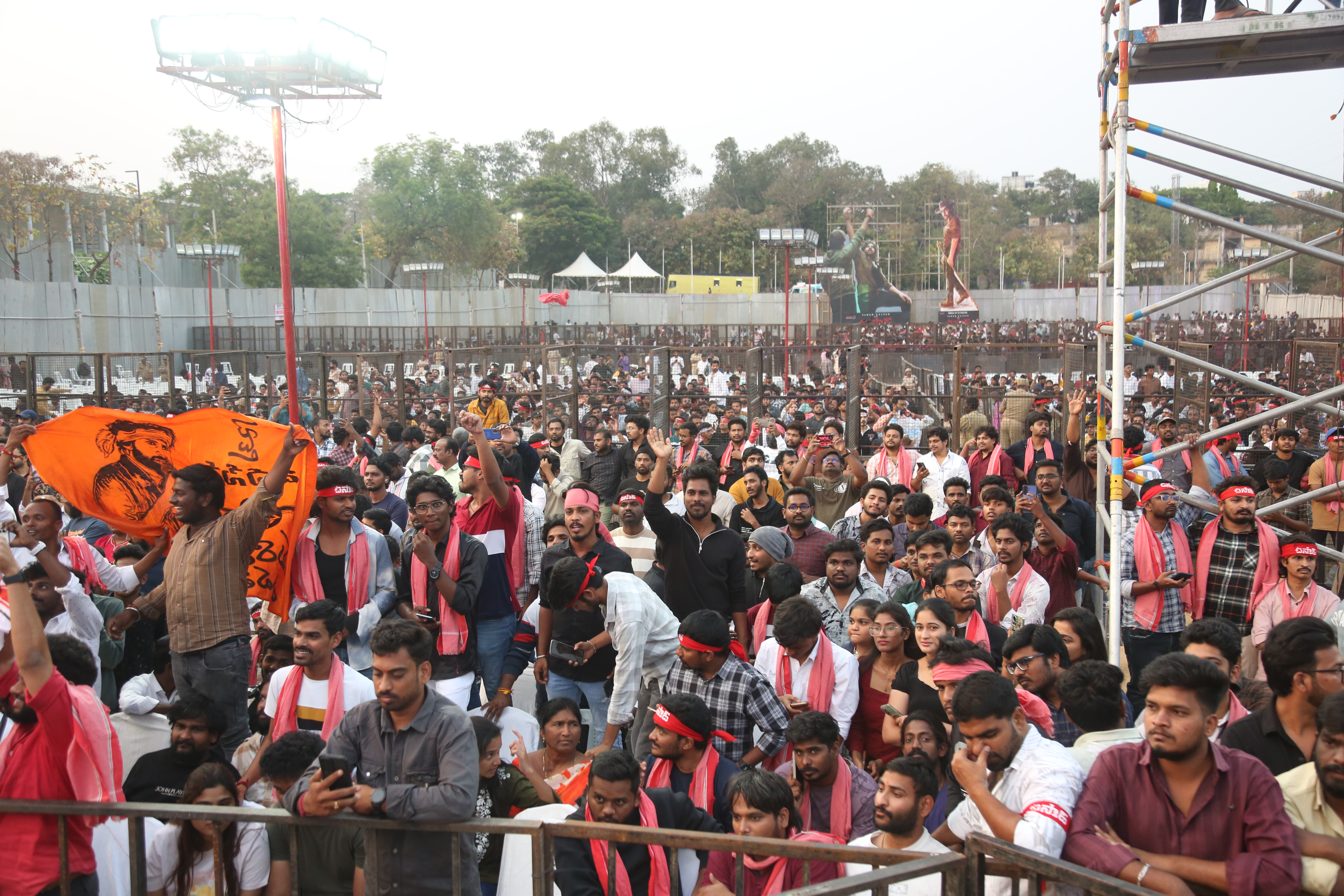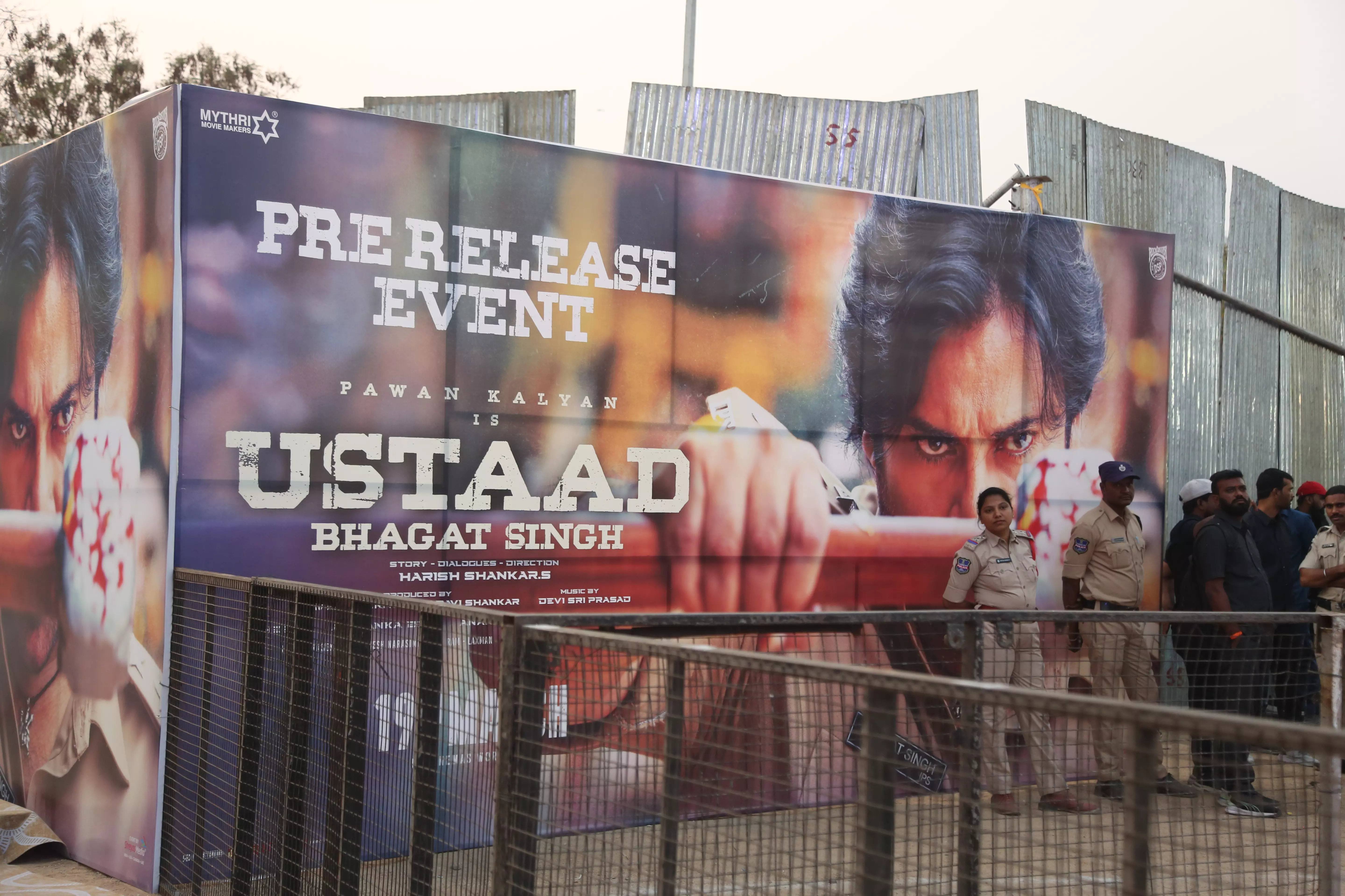 Fans of Ustaad Bhagat Singh gathered in huge numbers at the pre-release event, creating an electrifying atmosphere filled with excitement and anticipation. Enthusiastic supporters arrived early, waving banners and cheering for Pawan Kalyan, showing their unwavering love and support for the film.