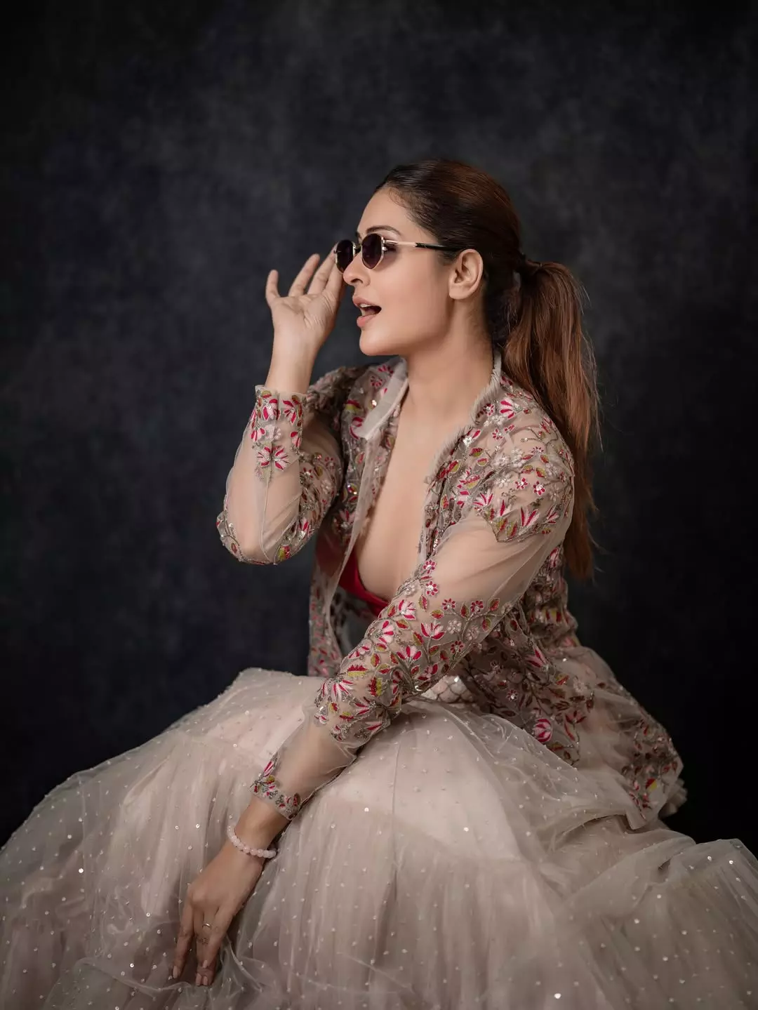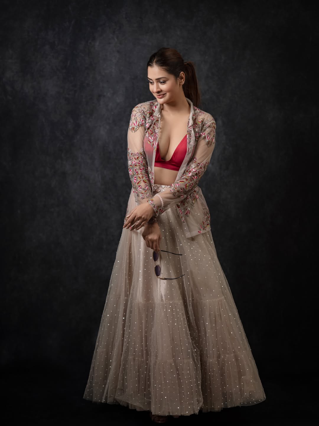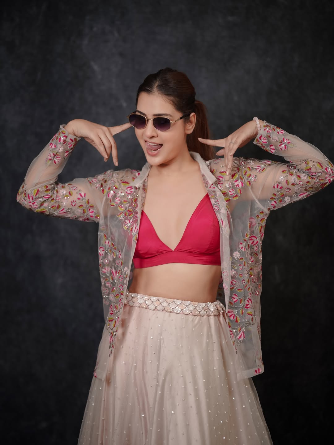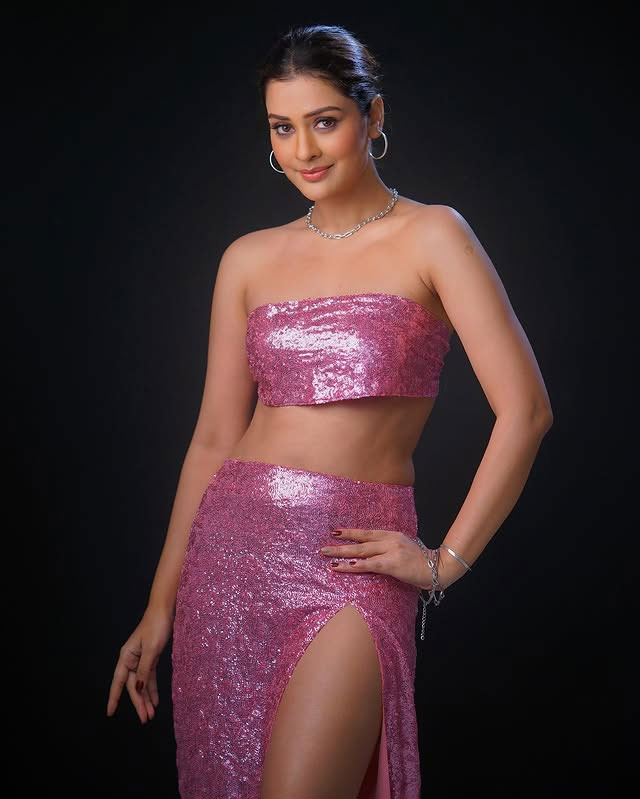 Payal Rajput dazzles in this glamorous photoshoot, exuding confidence and allure as she playfully adjusts her stylish sunglasses. Dressed in a stunning embroidered sheer jacket over a vibrant pink bralette, paired with a shimmering beige lehenga adorned with sequins and intricate floral details, she strikes a bold, joyful pose against a dark backdrop—perfectly capturing her radiant personality and fashion flair. Born on December 5, 1992, in Delhi, Payal Rajput began her career in television with the Hindi series Sapnon Se Bhare Naina (2010).
