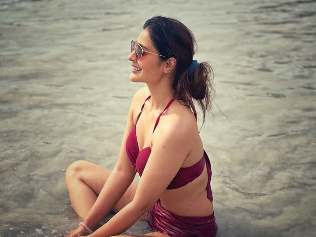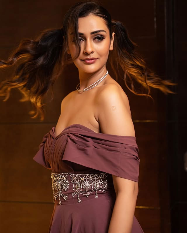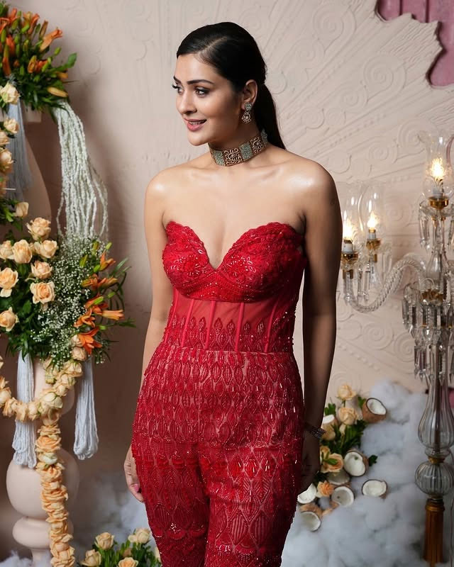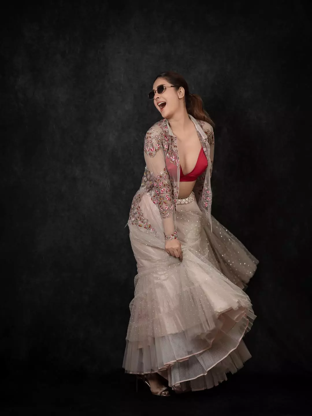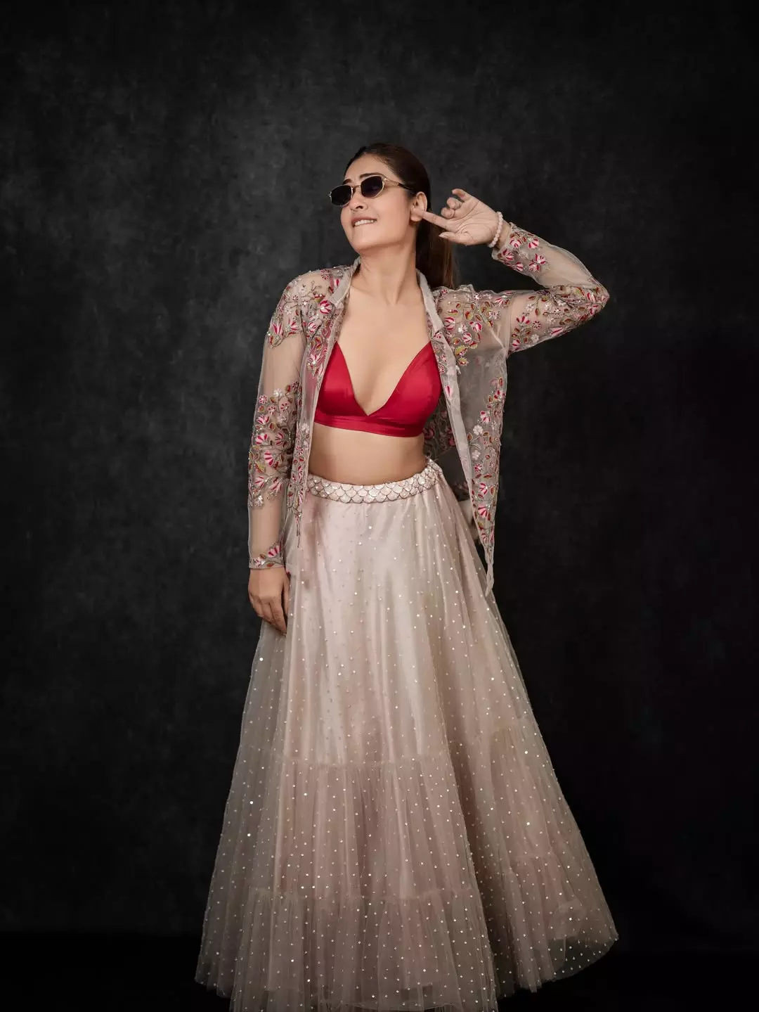 Payal Rajput dazzles in this glamorous photoshoot, exuding confidence and allure as she playfully adjusts her stylish sunglasses. Dressed in a stunning embroidered sheer jacket over a vibrant pink bralette, paired with a shimmering beige lehenga adorned with sequins and intricate floral details, she strikes a bold, joyful pose against a dark backdrop—perfectly capturing her radiant personality and fashion flair. Born on December 5, 1992, in Delhi, Payal Rajput began her career in television with the Hindi series Sapnon Se Bhare Naina (2010).