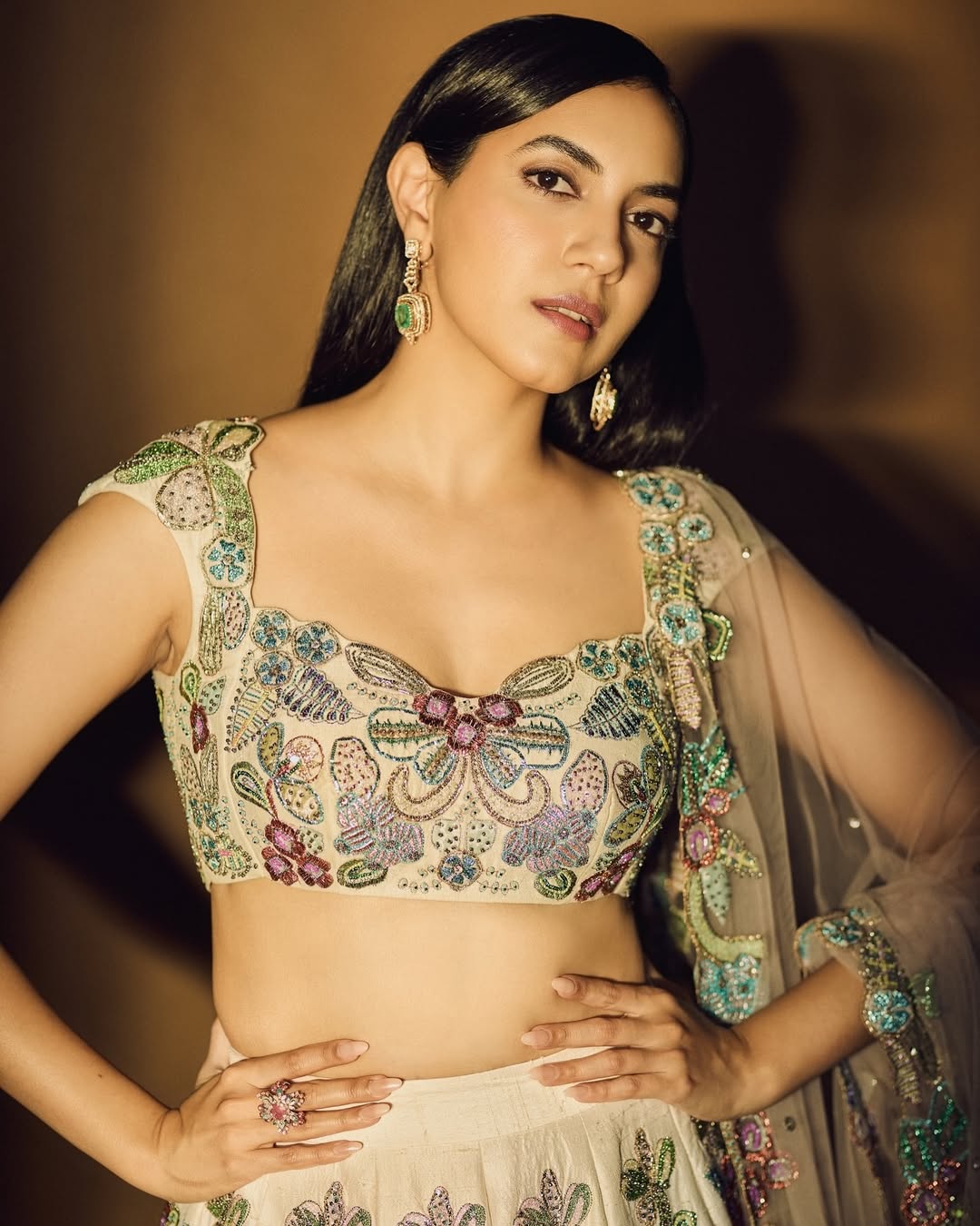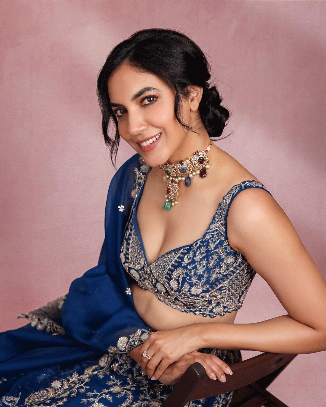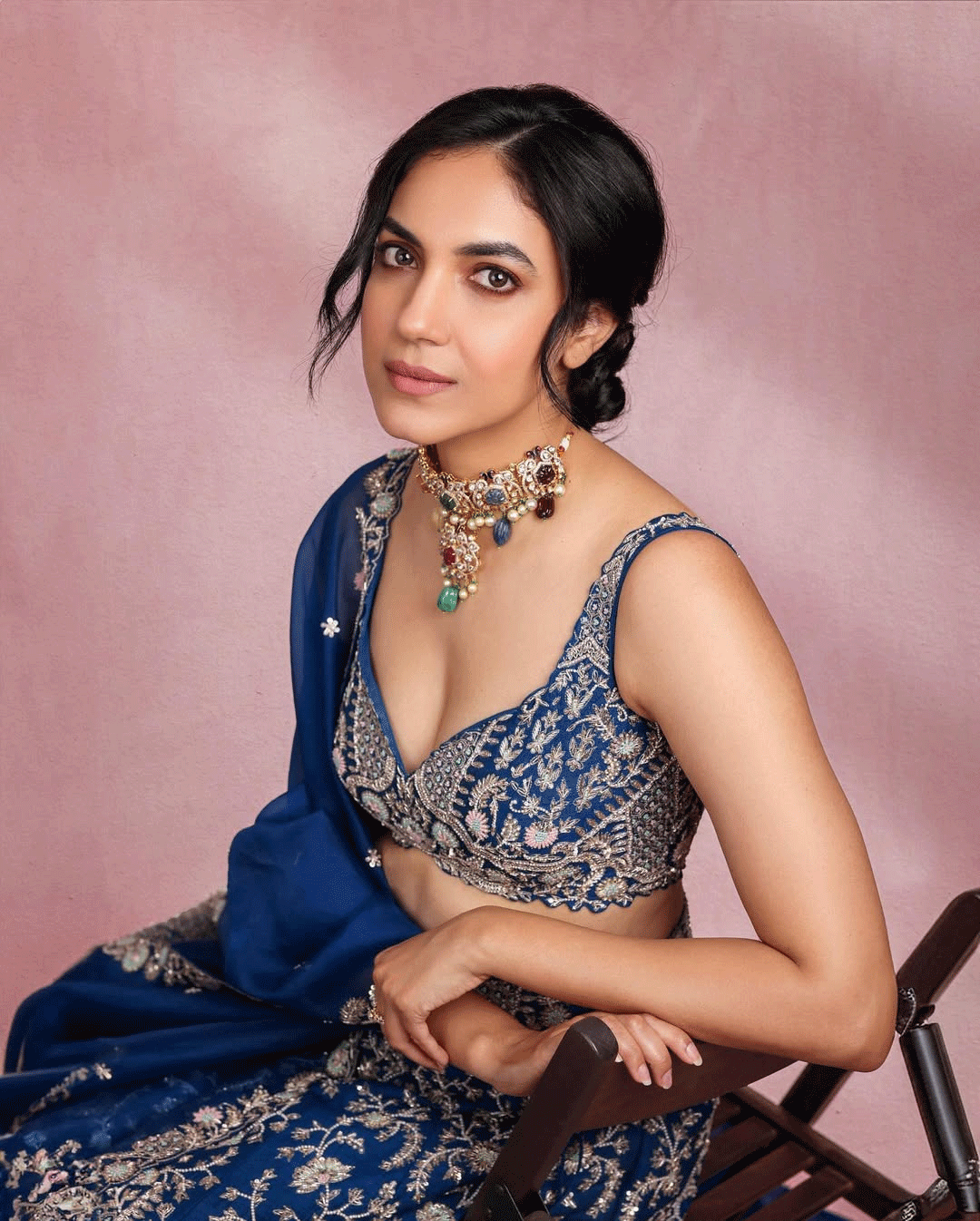 This elegant portrait of Ritu Varma showcases her radiant smile and graceful charm in a richly embroidered royal blue lehenga with intricate silver zari work, paired with a statement multi-gem choker necklace.