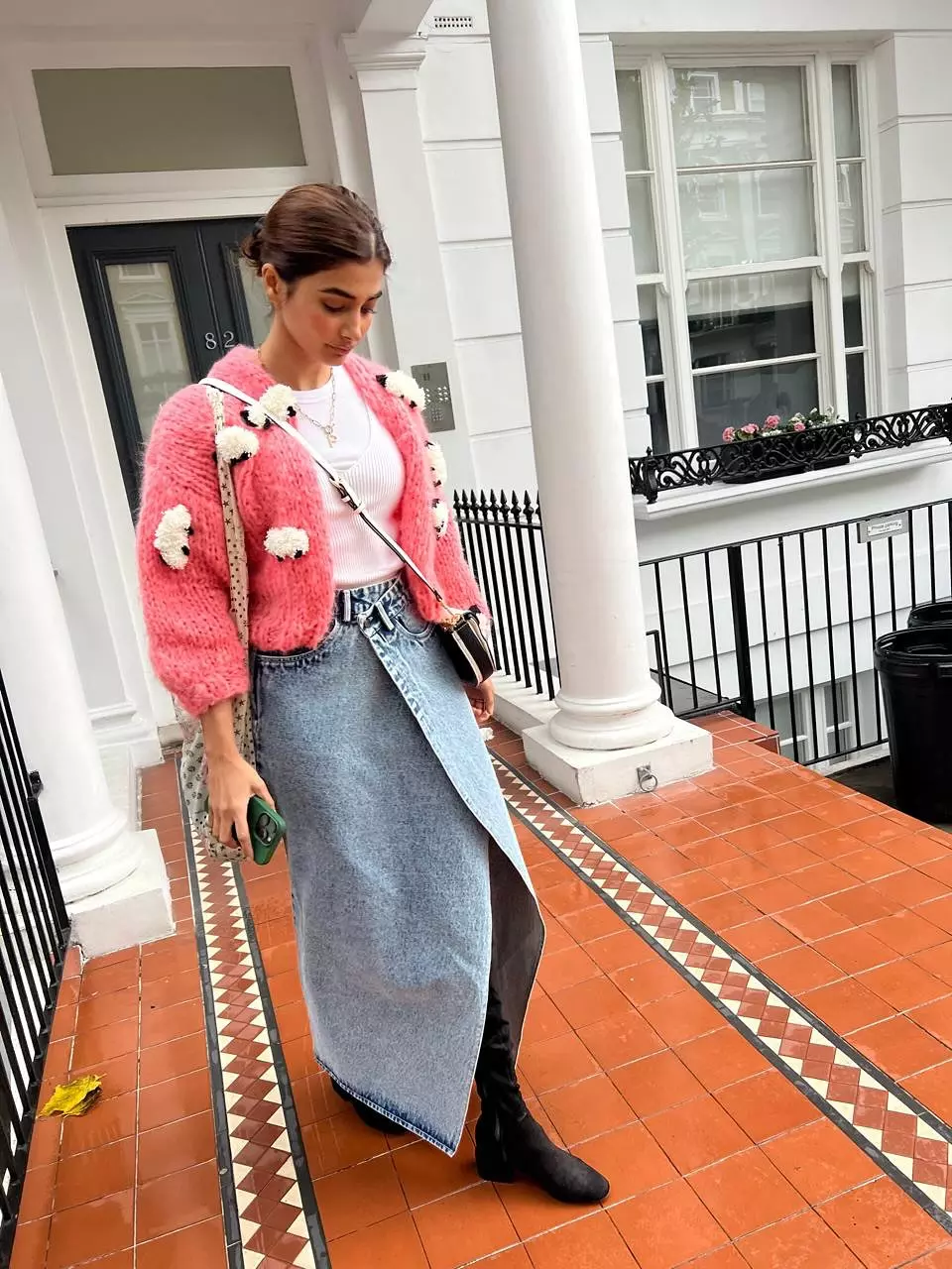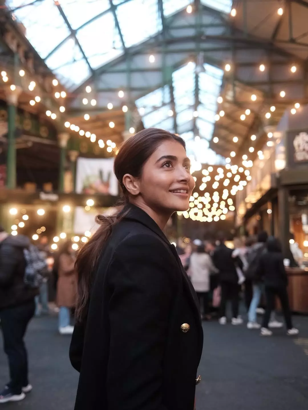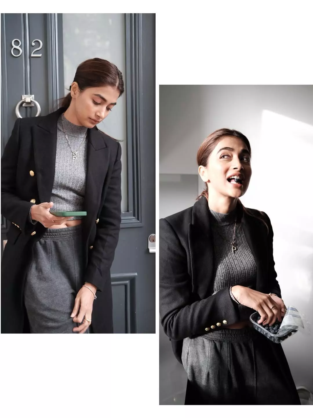 Pooja Hegde is once again in the spotlight, thanks to her new Instagram photos where she wrote the caption “moving to December.” In the picture, Pooja is seen standing in a narrow hallway wearing a white sweater, navy blue trousers, simple white shoes, and a small black sling bag. She also many other photos that quickly became viral across social media.