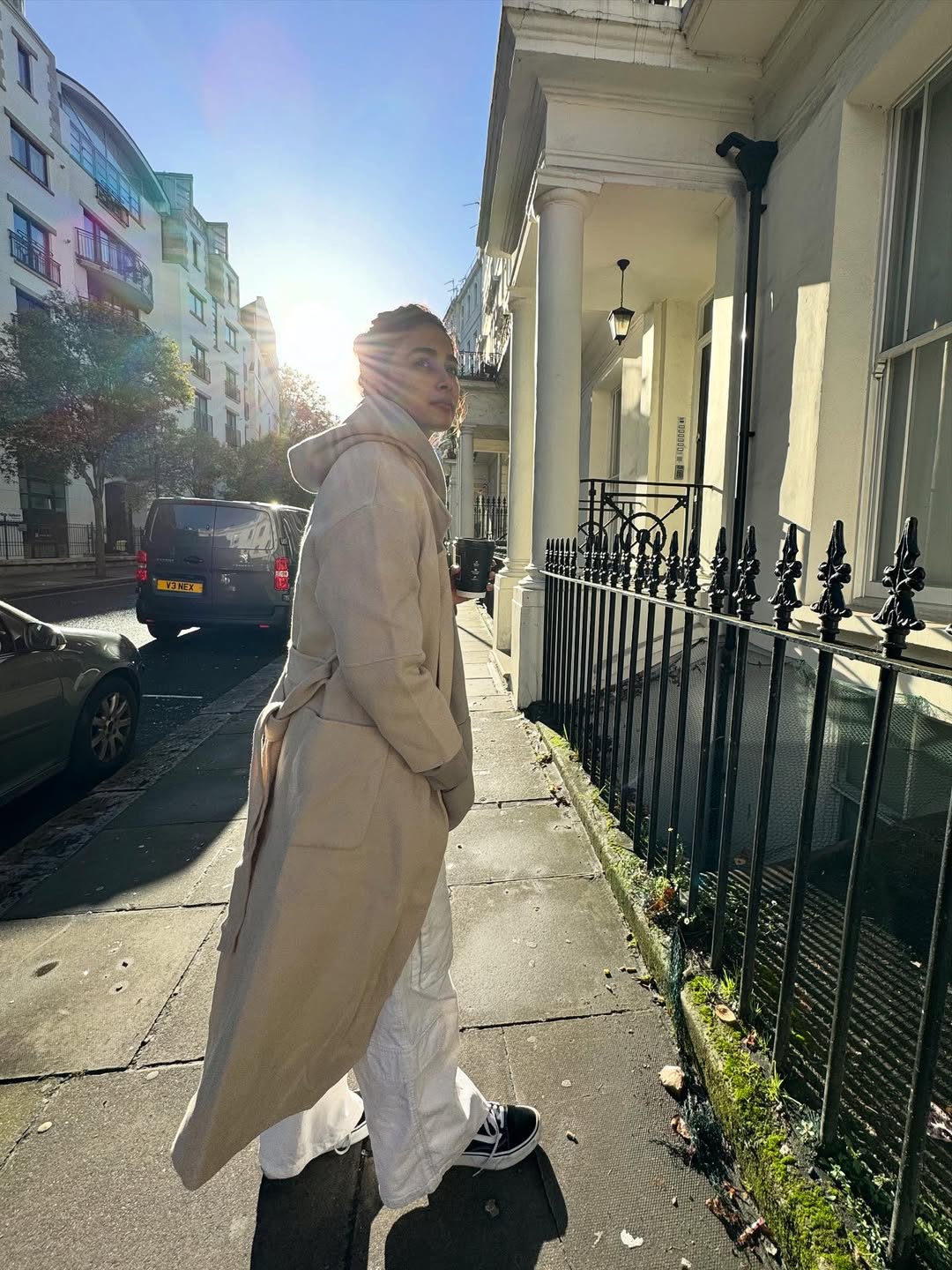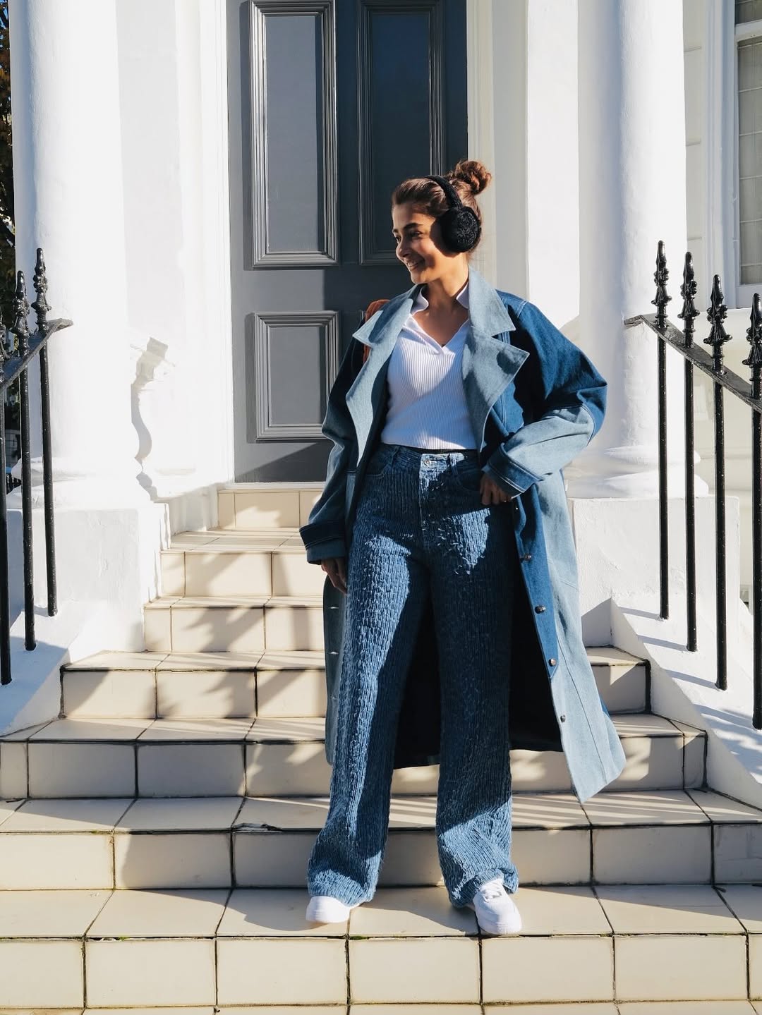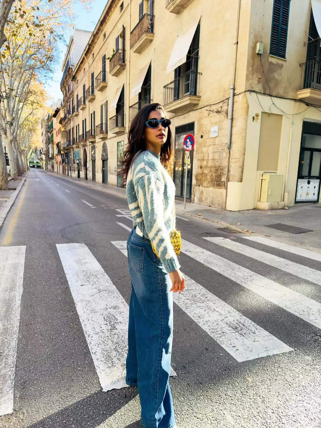 Pooja Hegde is once again in the spotlight, thanks to her new Instagram photos where she wrote the caption “moving to December.” In the picture, Pooja is seen standing in a narrow hallway wearing a white sweater, navy blue trousers, simple white shoes, and a small black sling bag. She also many other photos that quickly became viral across social media.
