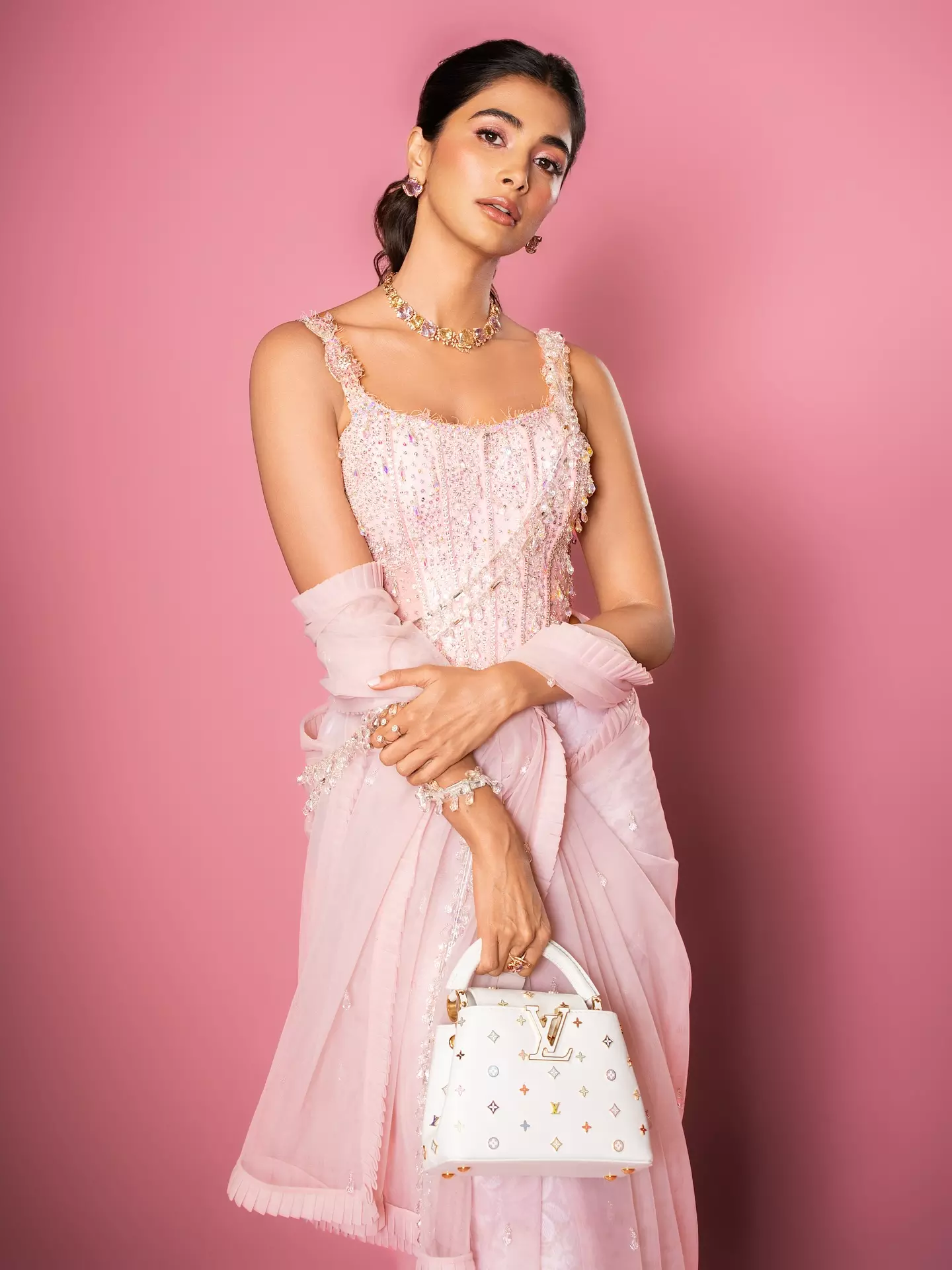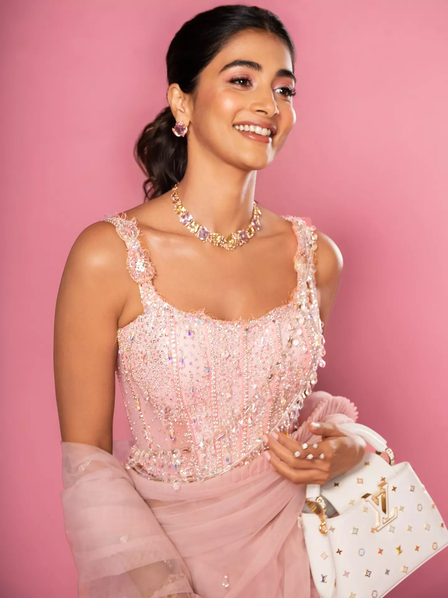 Pooja Hegde recently shared a beautiful picture on her Instagram profile that has taken over social media. In the photo, Pooja is seen dressed in an elegant pastel pink embellished outfit, paired with a adorable necklace and matching earrings. Her look was completed with natural makeup and a bright smile that added to her charm. The actress captioned her post, “All dolled up to bring in my birthday and attend my first Diwali party with Manish Malhotra.”
