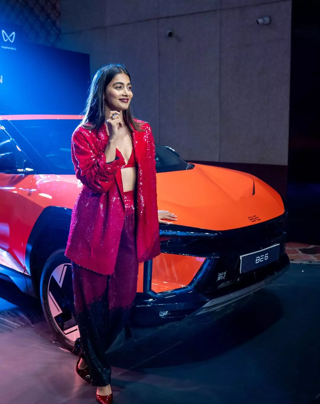 Pooja Hegde looked stunning in a red sequined outfit as she posed confidently beside Mahindra’s stylish BE6 electric SUV.
