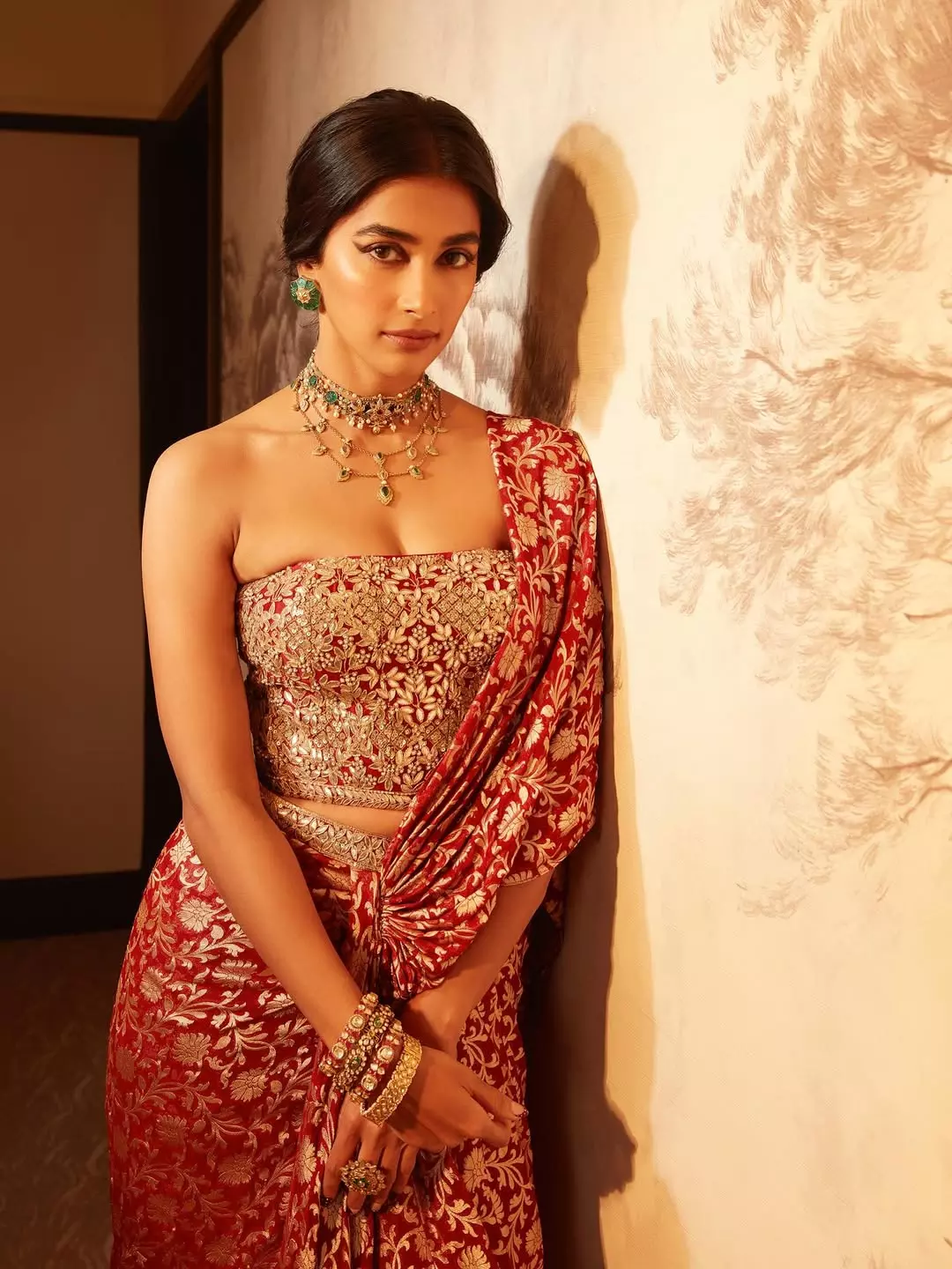 In the photos, Pooja Hegde is seen sitting calmly on a sofa dressed in a rich red traditional dress with detailed patterns.