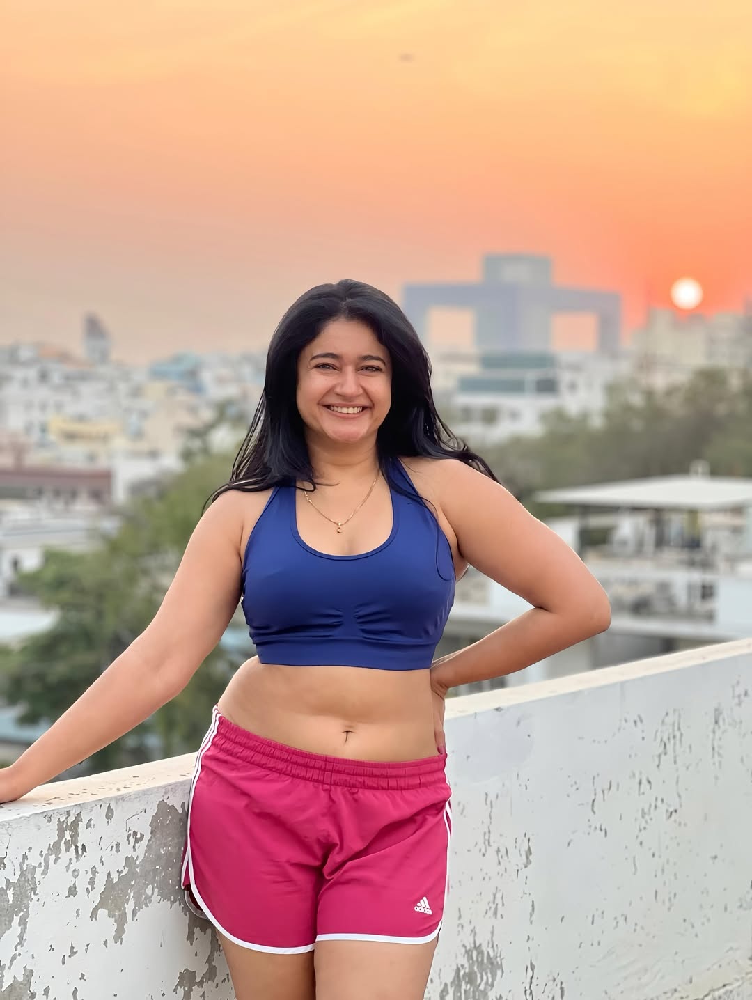 South Indian actress Poonam Bajwa shines with effortless charm and vitality in this captivating sunset photoshoot. Sporting a navy blue sports bra paired with vibrant pink shorts, she poses confidently against a stunning city skyline bathed in warm orange hues. Her natural smile, wind-swept hair, and athletic vibe perfectly capture the magic of #sunsethours. @nishamakeoversofficial