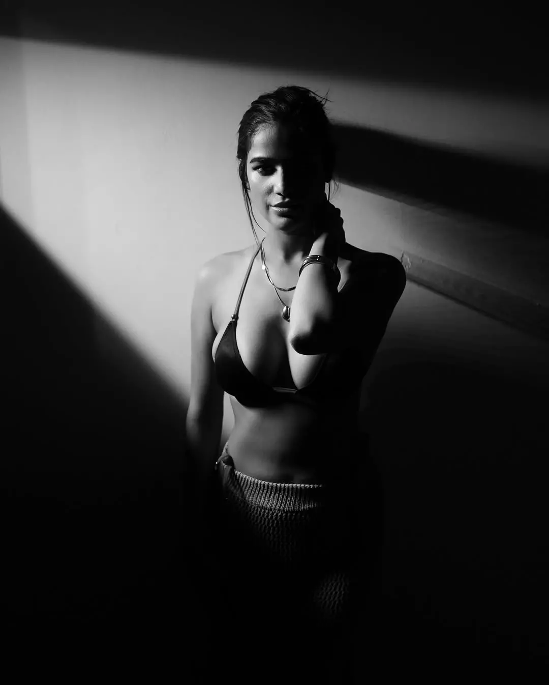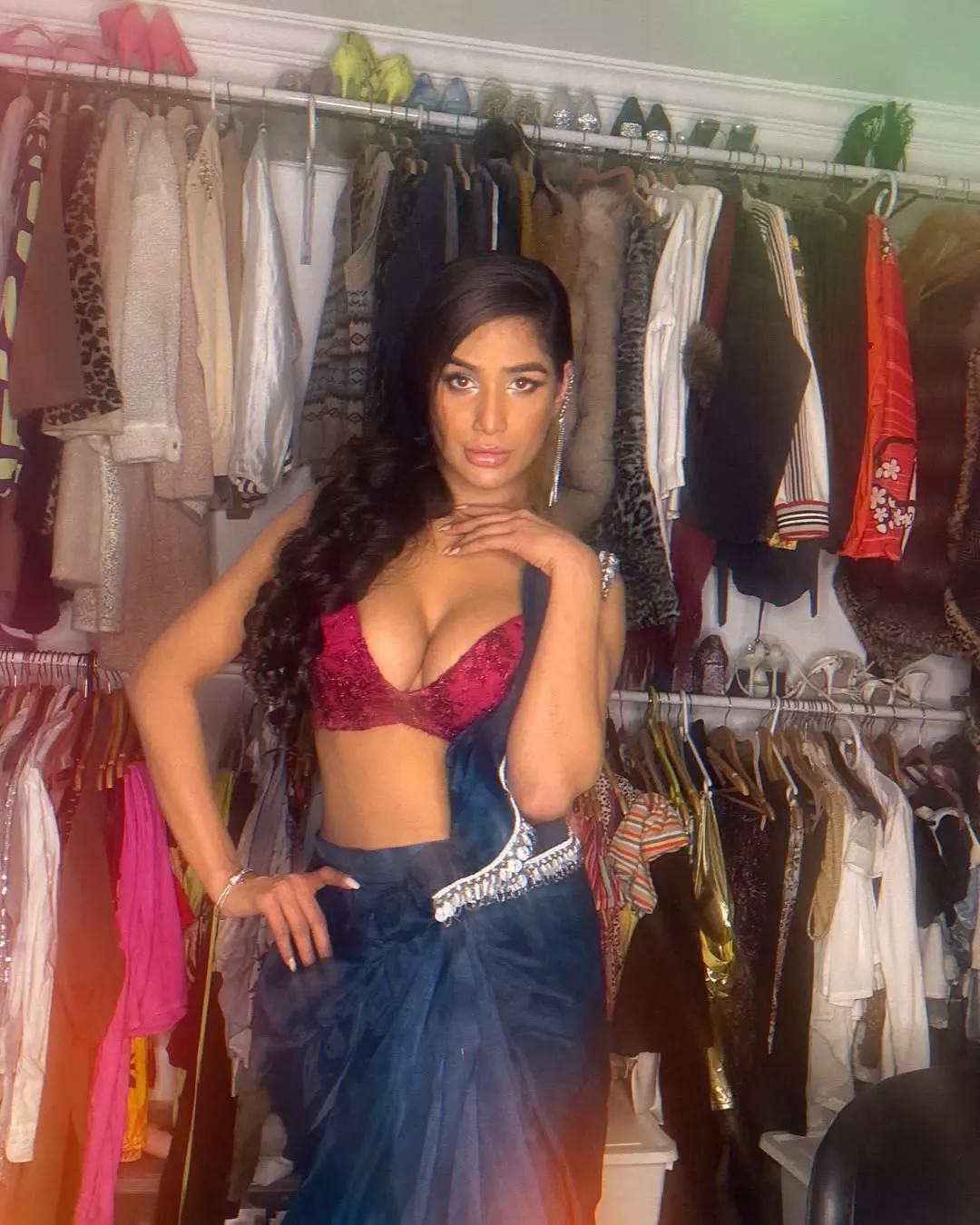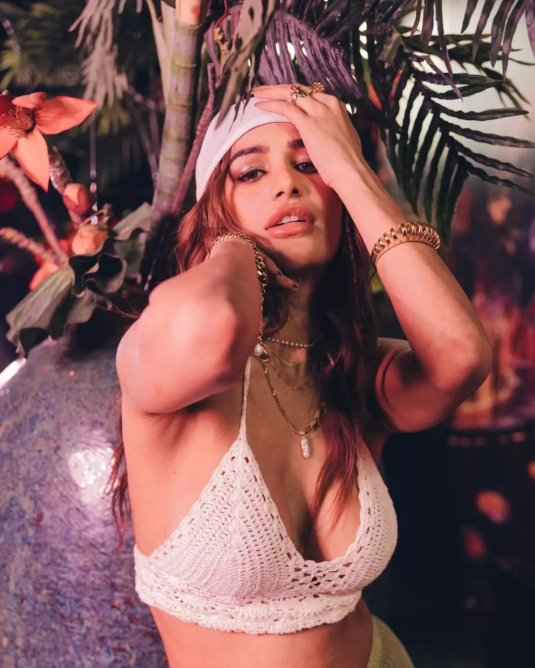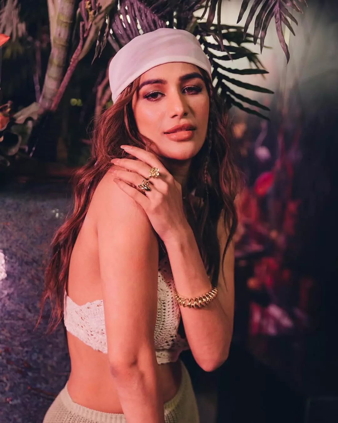 In this stunning shot of Poonam Pandey, she radiates tropical glam with her chic crochet outfit, golden accessories, and dewy glow.