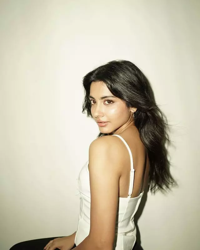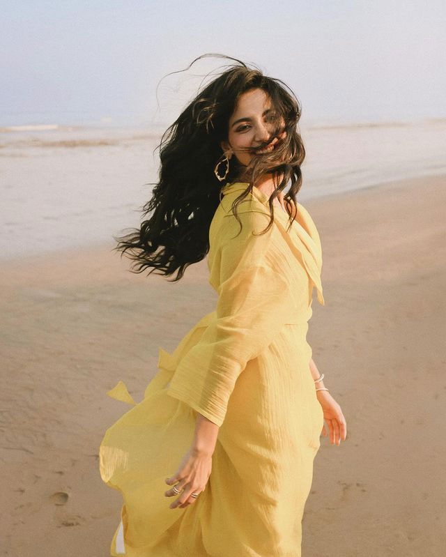 In the photo, Pragati looks effortlessly glamorous in a sleeveless black knit outfit, featuring a netted design that highlights her toned figure. Her wavy hair falls messily over her shoulders giving her an edgy and sultry look. She paired it with gold bangles.
