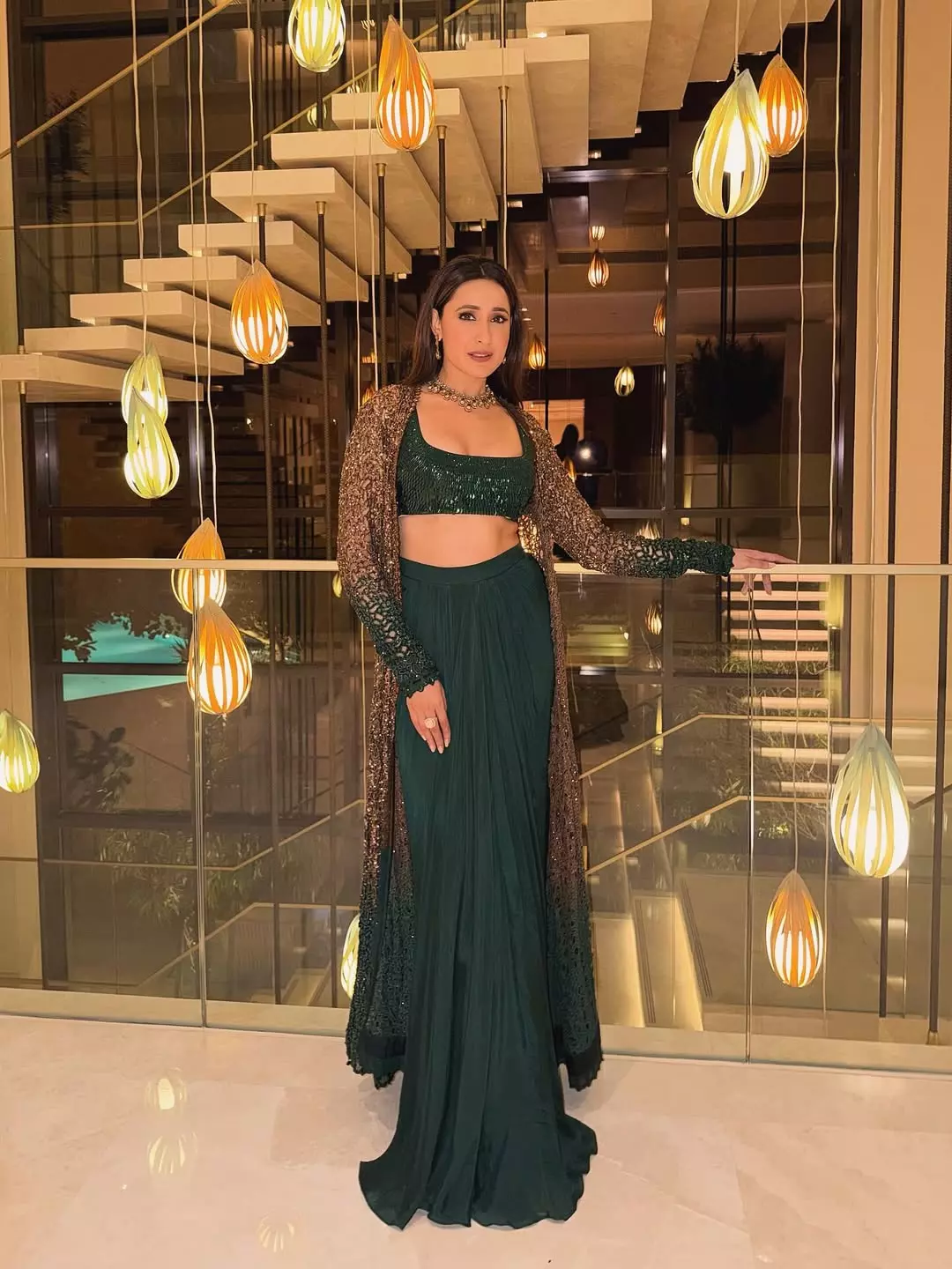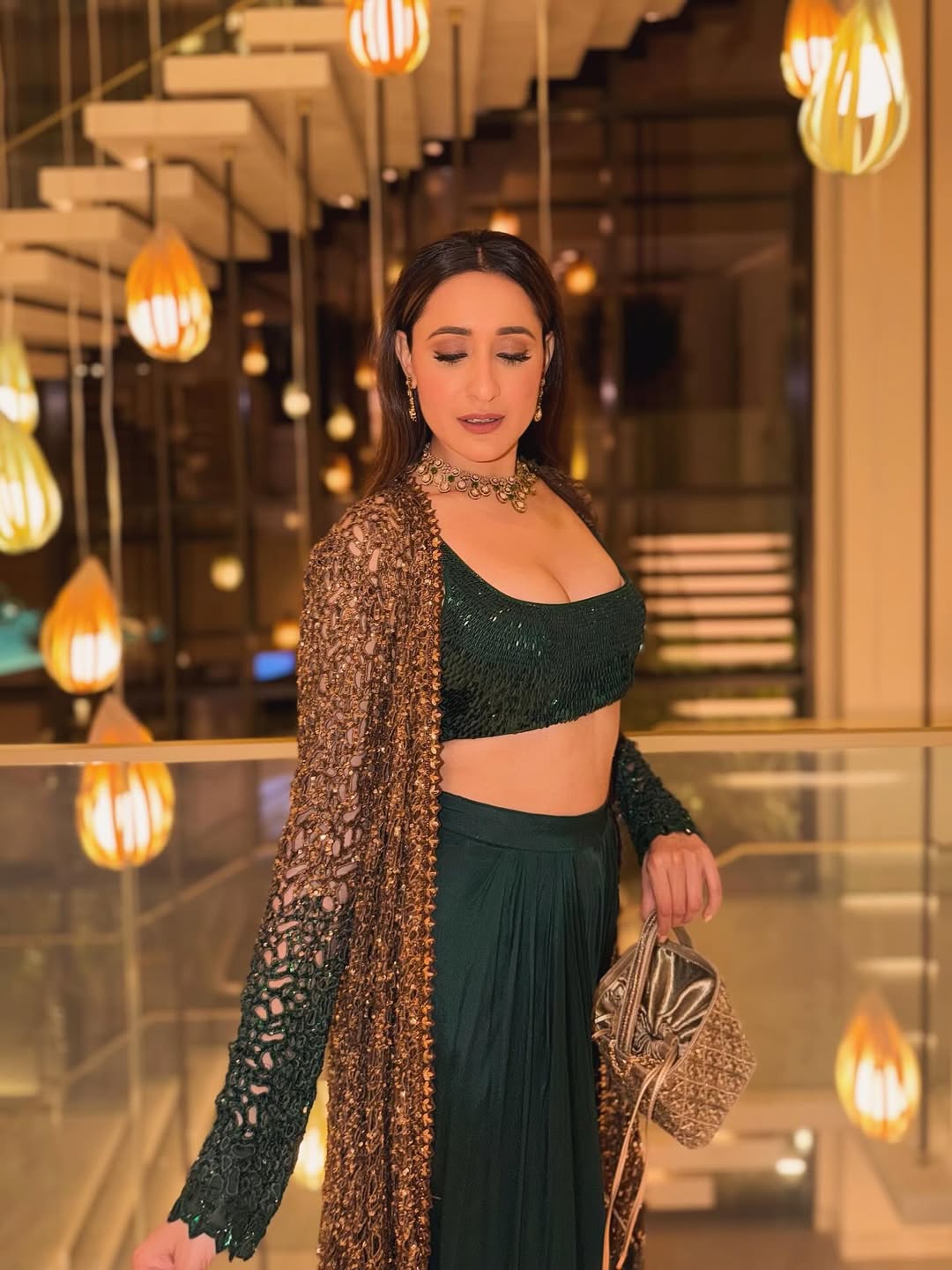 Pragya Jaiswal enchants in this mesmerizing photoshoot captioned Sufi Magic , exuding ethereal elegance in a luxurious emerald green ensemble. She dons a sequined crop top and pleated skirt by @sawangandhiofficial, complemented by a stunning necklace set from @rubans.in, a ring by @miranabymegha, and a chic potli bag from @fizzygoblet. Styled impeccably by @natashaabothra with assistance from @styleitupwithmicheala and @mausmi_mitra_, the look features intricate gold lace detailing on the sheer long jacket, bold makeup, and a poised demeanor against a backdrop of ambient orange lights—perfectly capturing mystical allure and sophistication.
