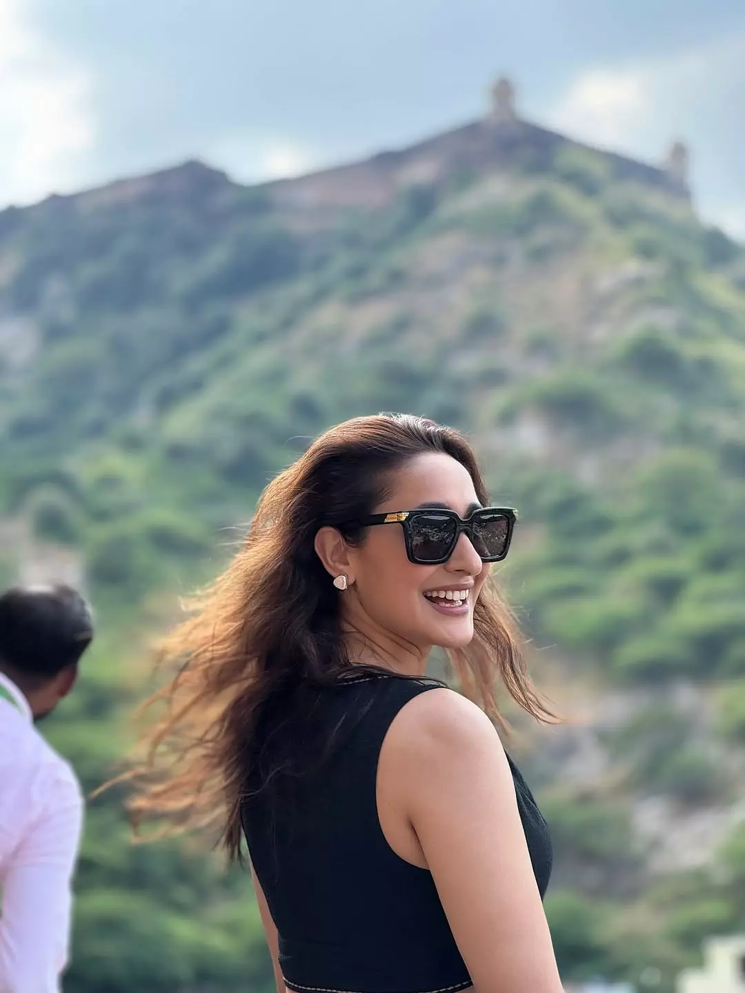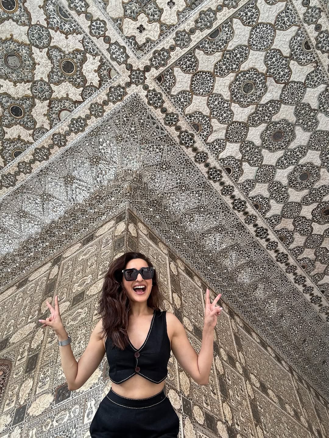 Radiating elegance against the majestic Hawa Mahal, Pragya Jaiswal stuns in an all-black outfit, perfectly contrasting the iconic pink backdrop of Jaipur. Her radiant smile and effortless charm capture the true essence of the Pink City. Sharing her travel moments, she writes — “Last 24 hours in the Pink City 💘💘 Jaipur, you took my breath away!! Can’t wait to be back again..” Her post beautifully reflects her love for culture, color, and timeless style.