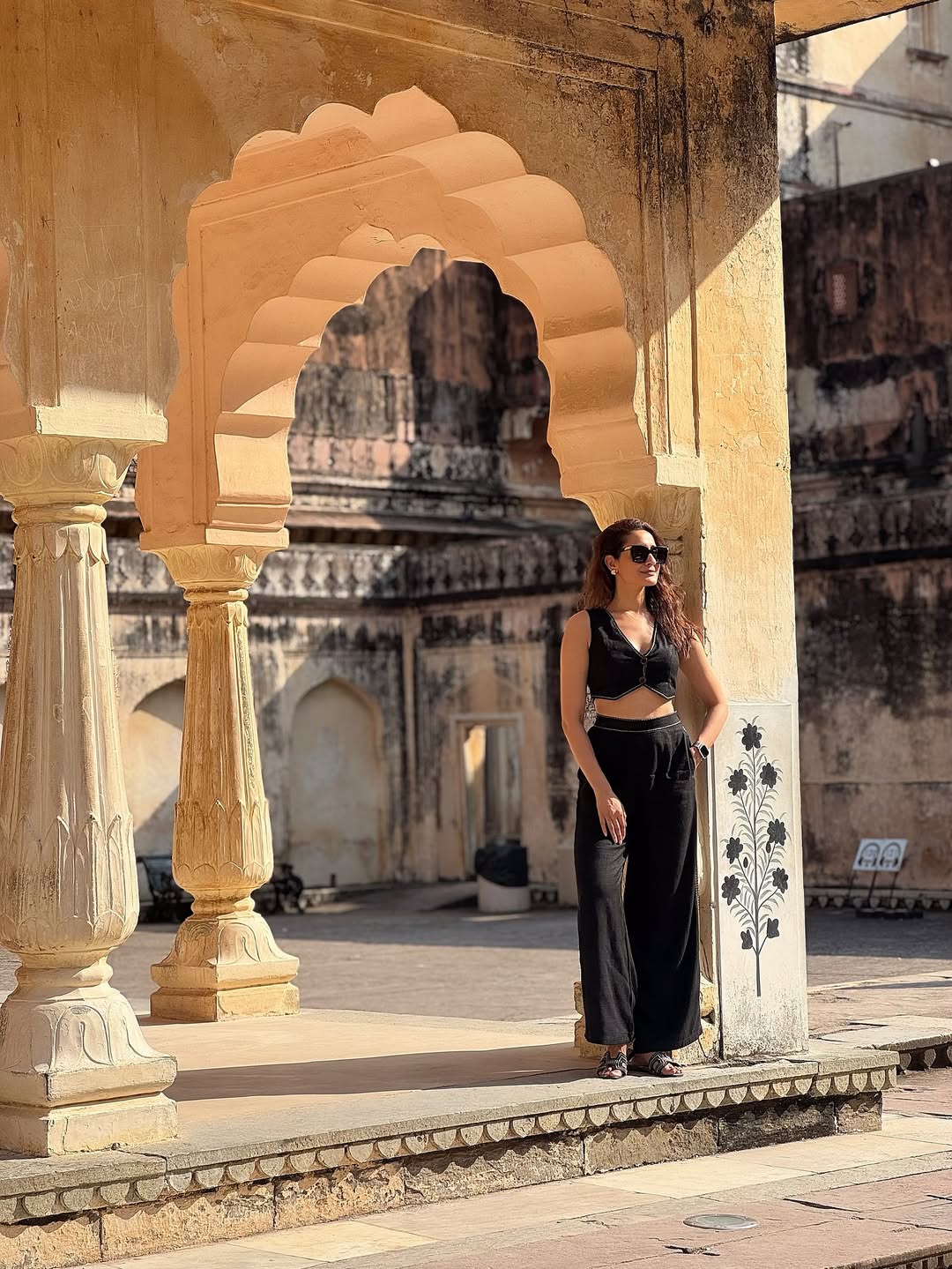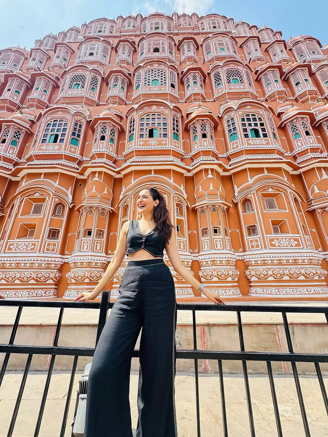 Radiating elegance against the majestic Hawa Mahal, Pragya Jaiswal stuns in an all-black outfit, perfectly contrasting the iconic pink backdrop of Jaipur.