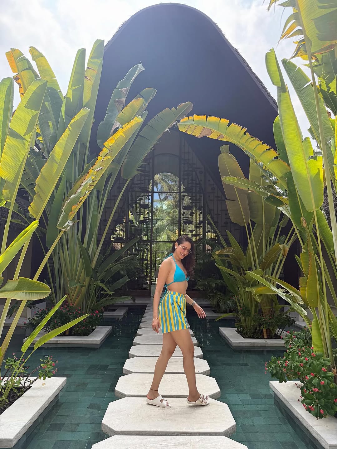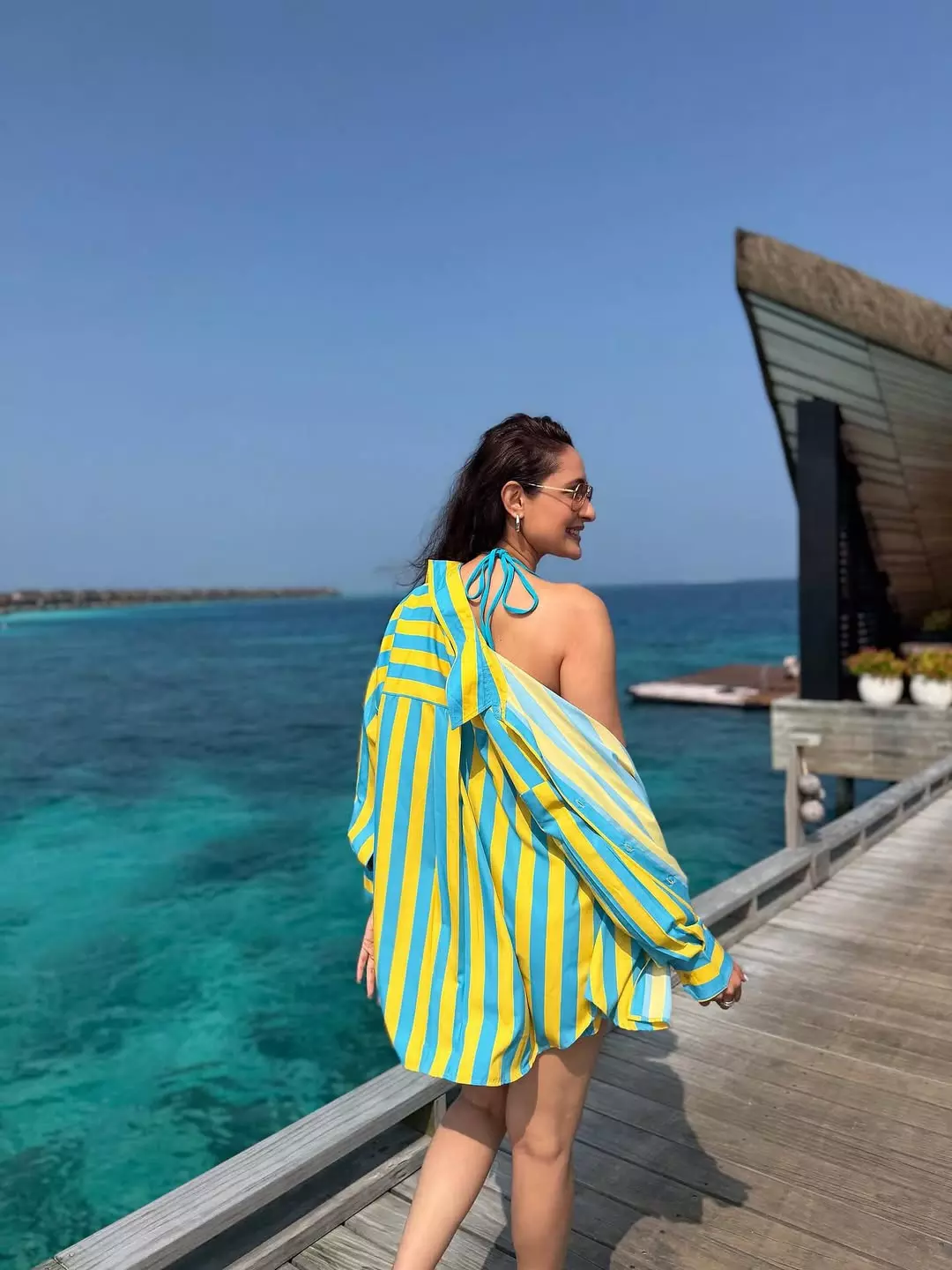 Dressed in a vibrant co-ord set from @flirtatious_india, the actress radiates effortless beach chic. The turquoise bikini paired with striped yellow-and-blue shorts and an open shirt beautifully complements the crystal-clear waters around her. The look strikes the perfect balance between playful and polished, making it ideal for a tropical escape.
