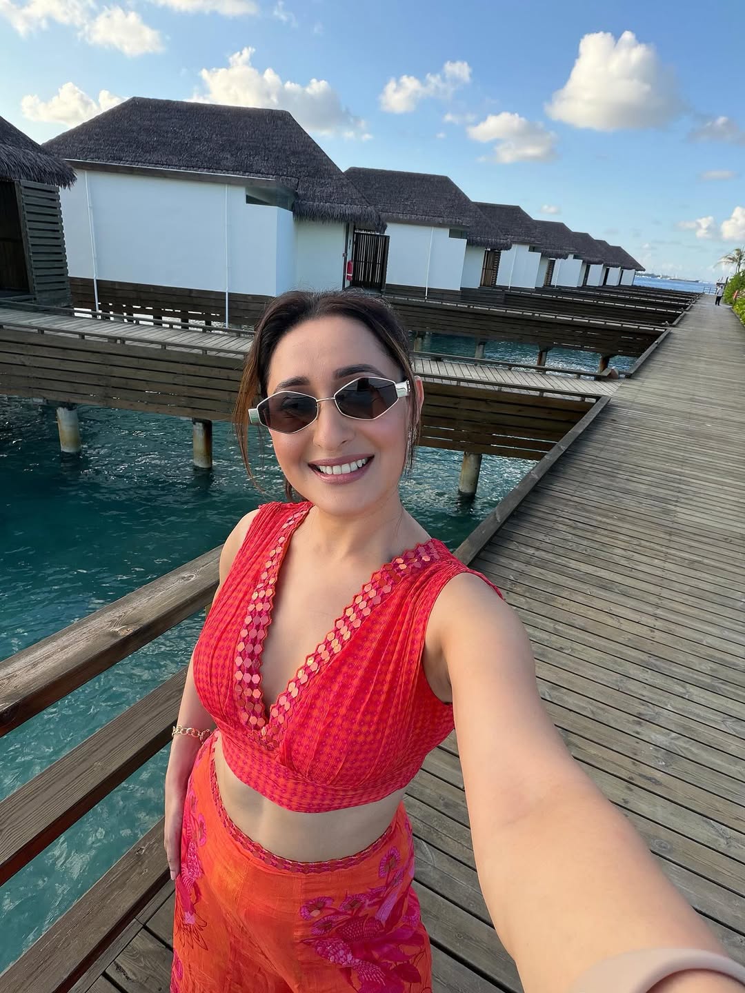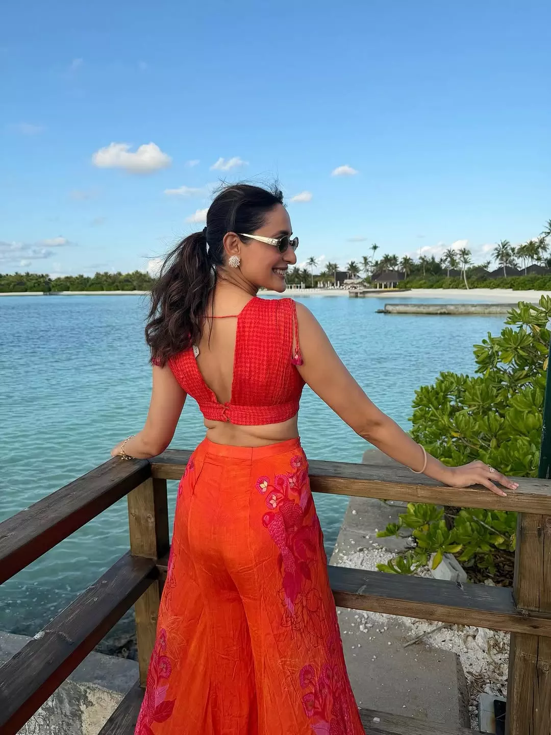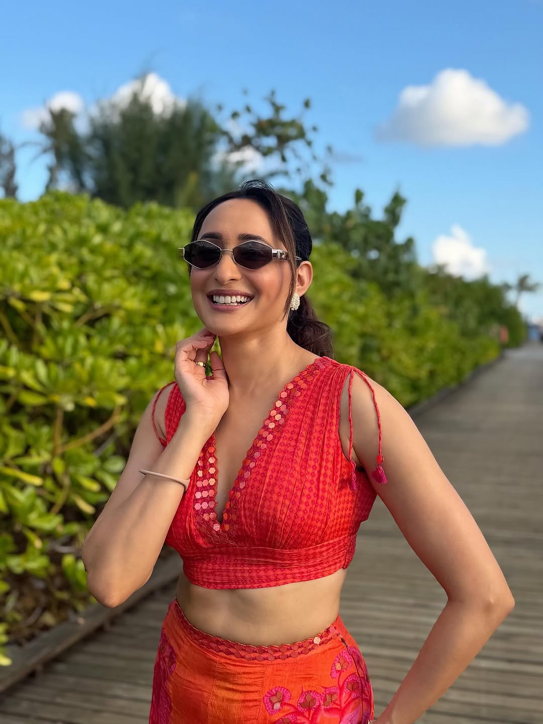 Pragya’s choice of minimal accessories, including delicate earrings and a sleek bracelet, keeps the focus on her radiant smile and confident stance. Her stylish sunglasses add a modern twist, perfectly complementing the sunny outdoor setting. The lush green backdrop and clear blue sky elevate the aesthetic of this vibrant shot, capturing a moment of pure joy and carefree elegance.