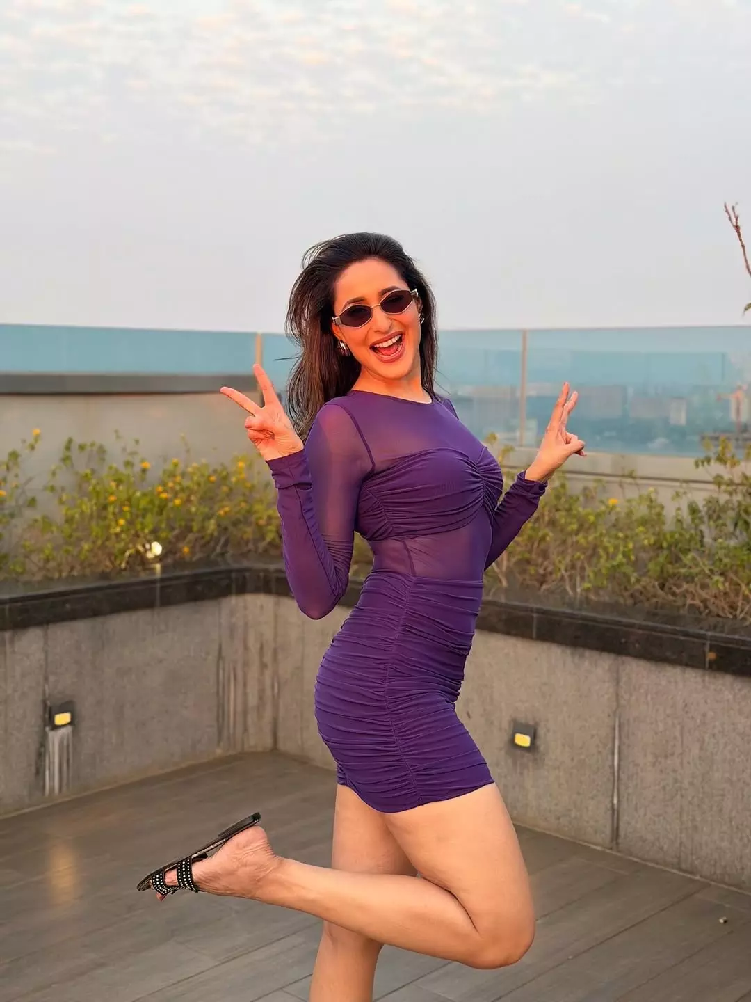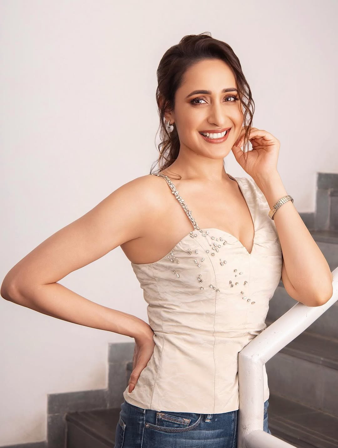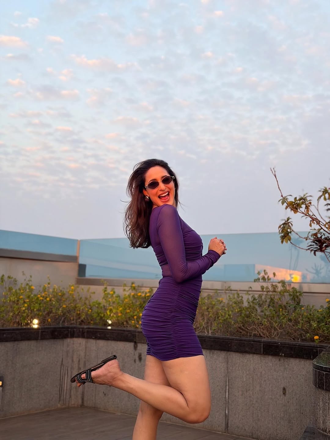 Pragya accessorized with sleek, minimal sunglasses, while her soft waves and natural makeup highlight her radiant smile, achieving an effortlessly glamorous vibe.