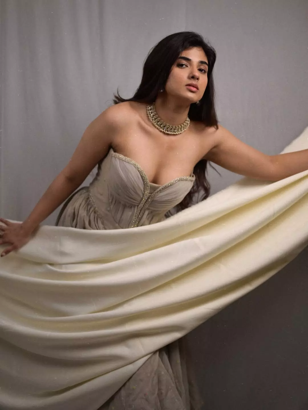 Pragya Nagra stuns in this elegant portrait, radiating timeless charm and modern glamour. Draped in a soft, flowing beige ensemble, she exudes a regal aura that feels straight out of a period drama. Aptly captioned “Born in Bridgerton, Made to survive this era,” the look blends vintage sophistication with contemporary boldness. Styled in a delicate corset-style dress by @zenoraofficial_ and captured beautifully by VC @sathyaphotography3, the image highlights her graceful poise, expressive gaze, and effortless confidence.