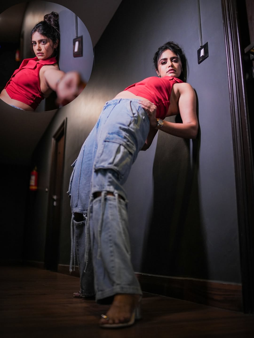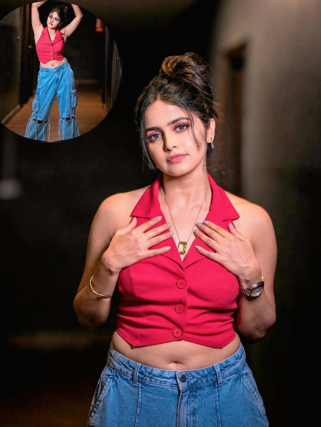 She wore a sleeveless red buttoned top and the top had a sharp collar design. She paired it with wide-legged blue denim pants. The denim had a stylish cut-out and layered detailing. She completed the look with a pendant necklace, a wristwatchand a simple bracelet.Her hair was styled in a high messy bun and a few strands framed her face.