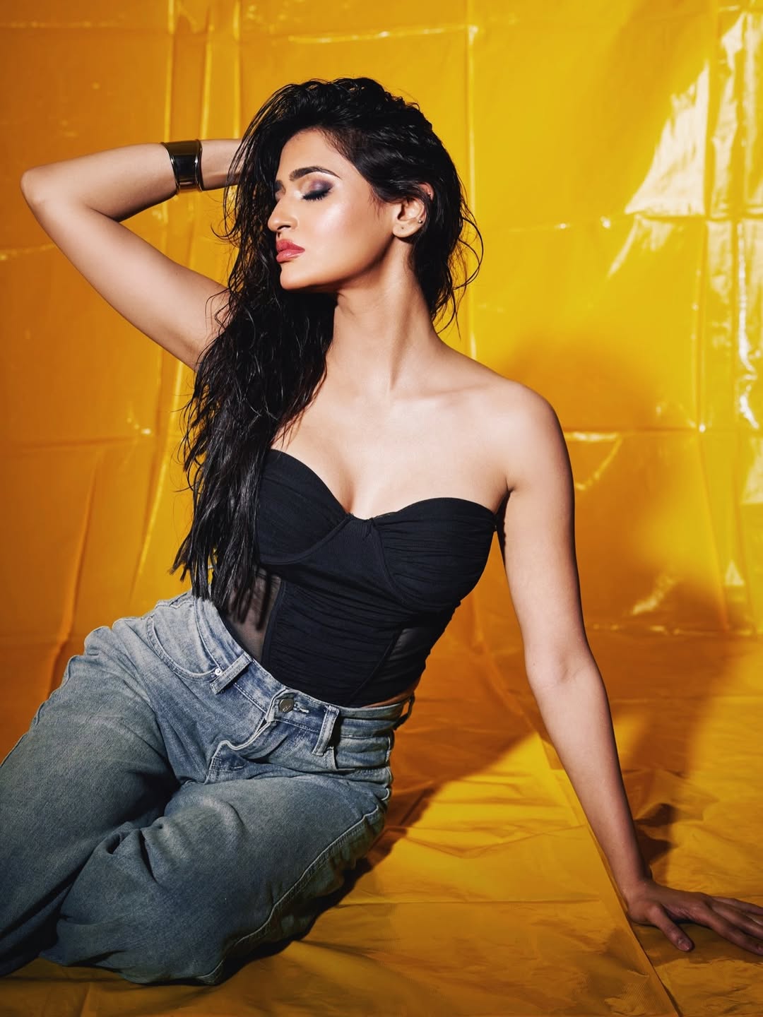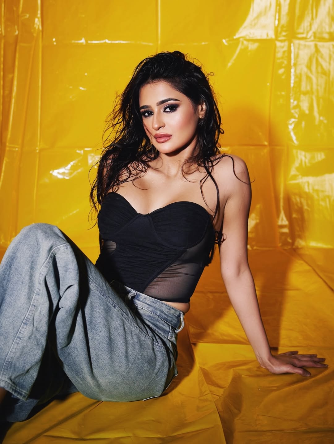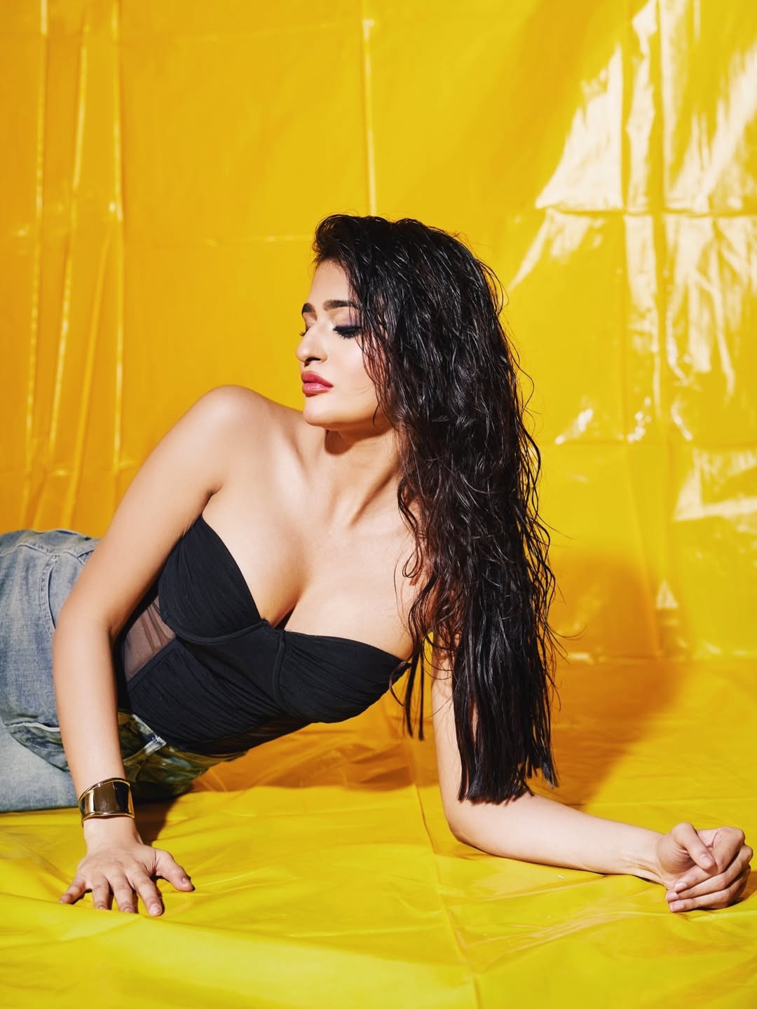 Prakriti Pavani, the striking Indian actress, model, and social media influencer, sizzles in this bold photoshoot. Lying confidently on a glossy yellow surface in a black strapless bustier top and denim jeans, her wet-look wavy hair and intense gaze create a powerful, seductive vibe.