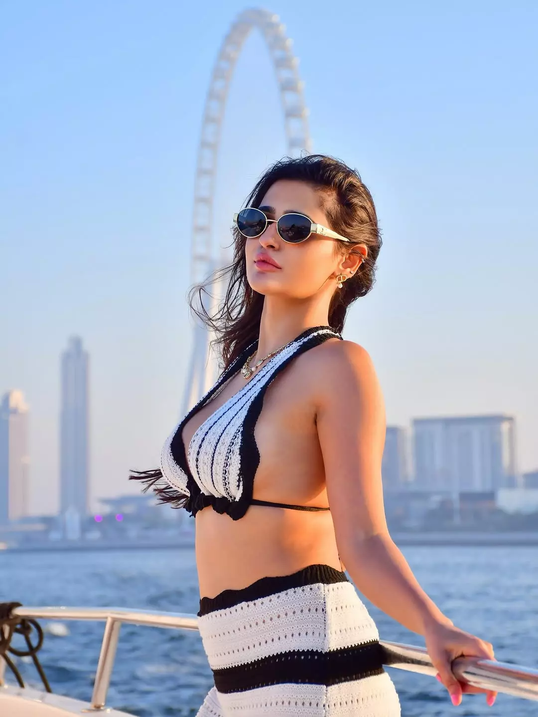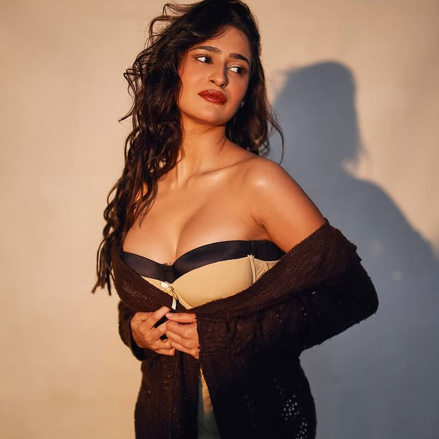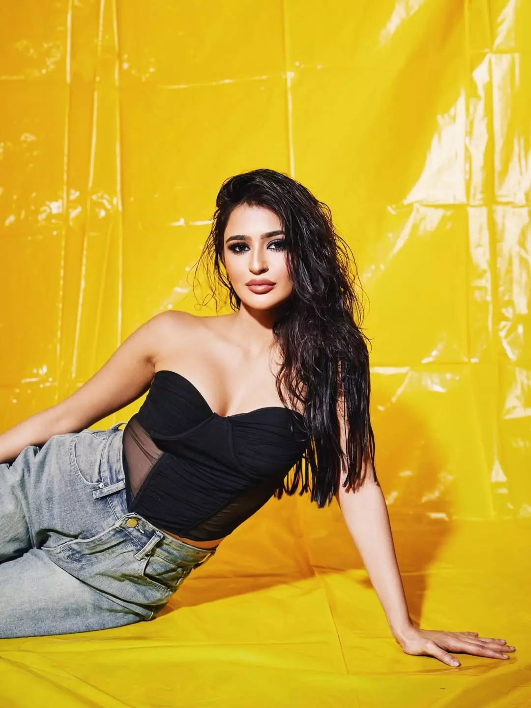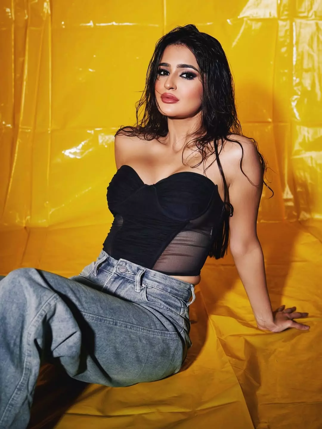 Prakriti Pavani, the striking Indian actress, model, and social media influencer, sizzles in this bold photoshoot. Lying confidently on a glossy yellow surface in a black strapless bustier top and denim jeans, her wet-look wavy hair and intense gaze create a powerful, seductive vibe.